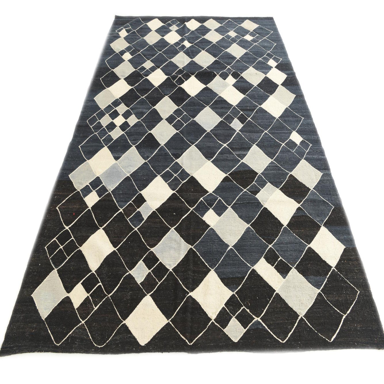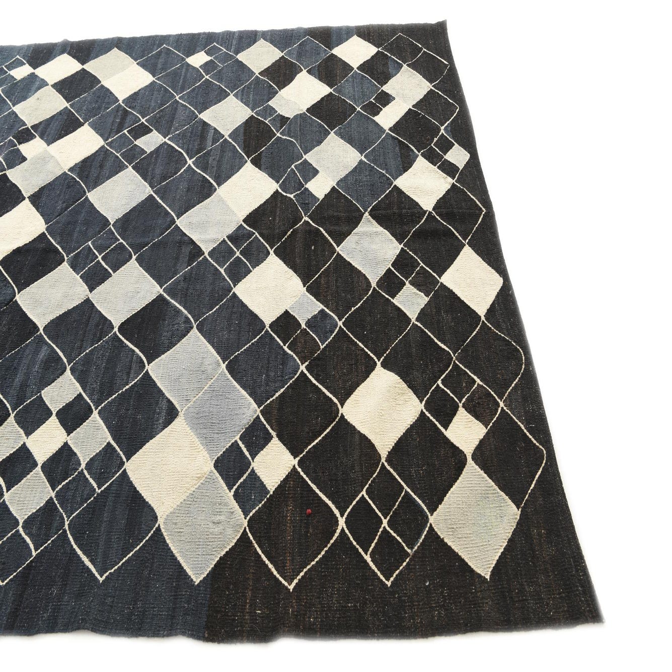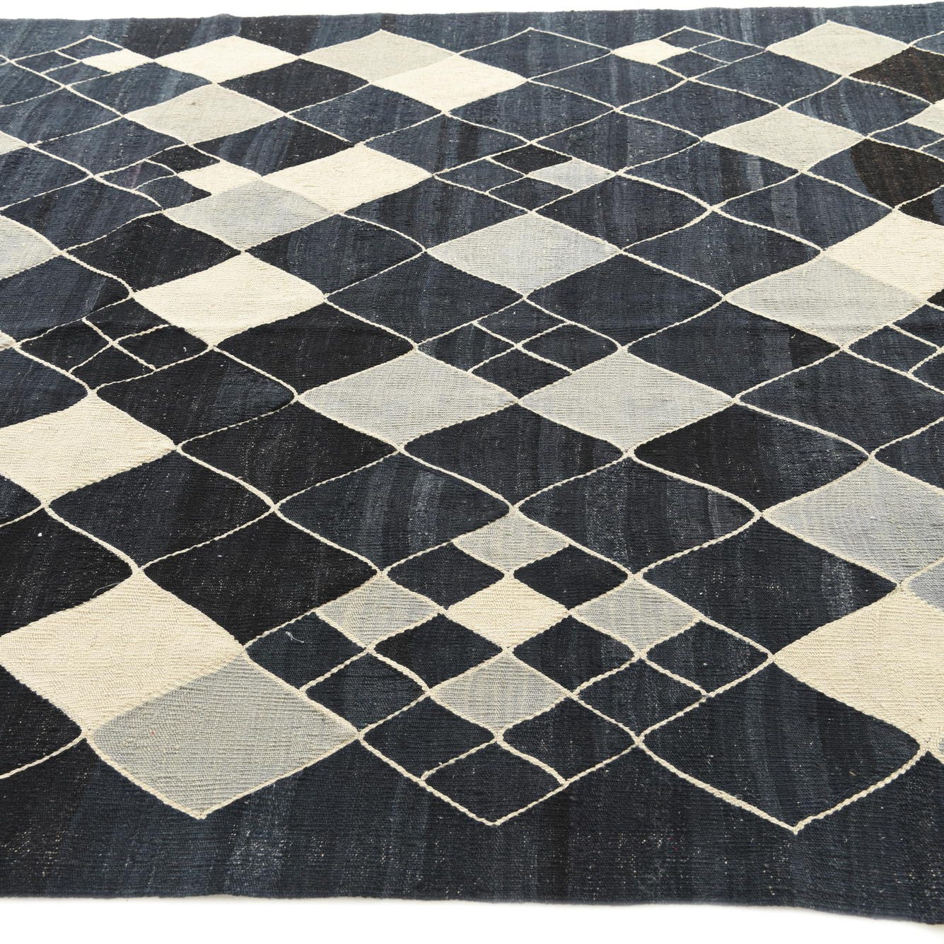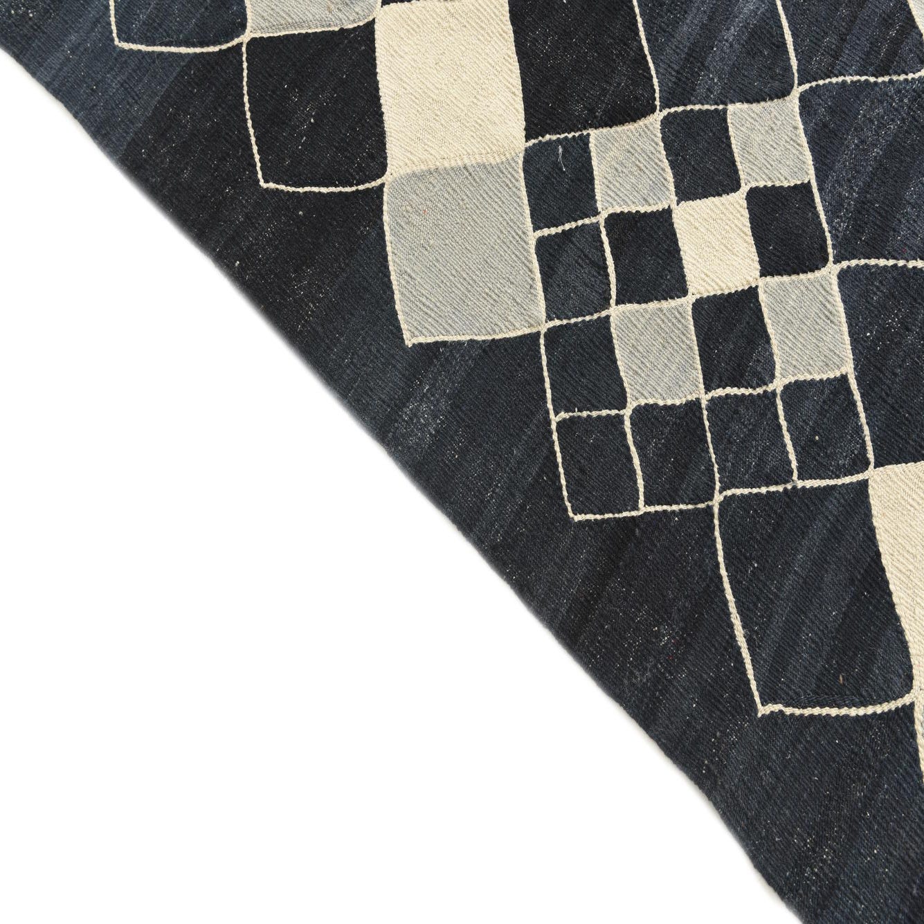 A hand-woven, 100% wool flatweave with a bold geometric layout, this rug pairs a black field with ivory and gray diamonds arranged in a loose lattice. The pattern alternates solid and outlined shapes—some filled with soft gray tones, others left bright ivory—creating a measured rhythm across the surface. The wool weave reads tactile and slightly rigid in the hand, with a comfortable, low-profile texture that still offers a warm, grounded presence underfoot.
