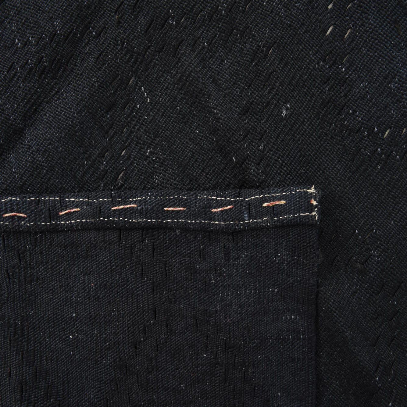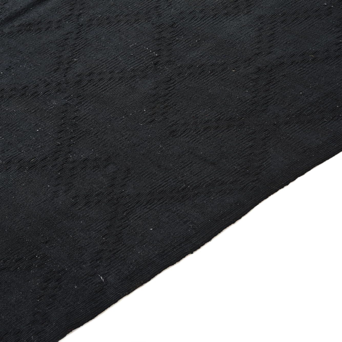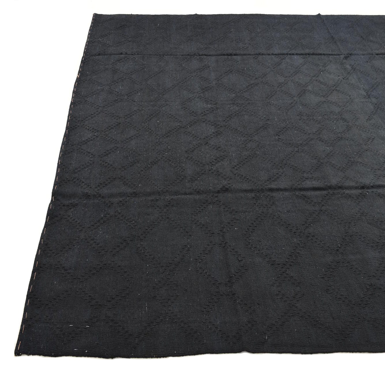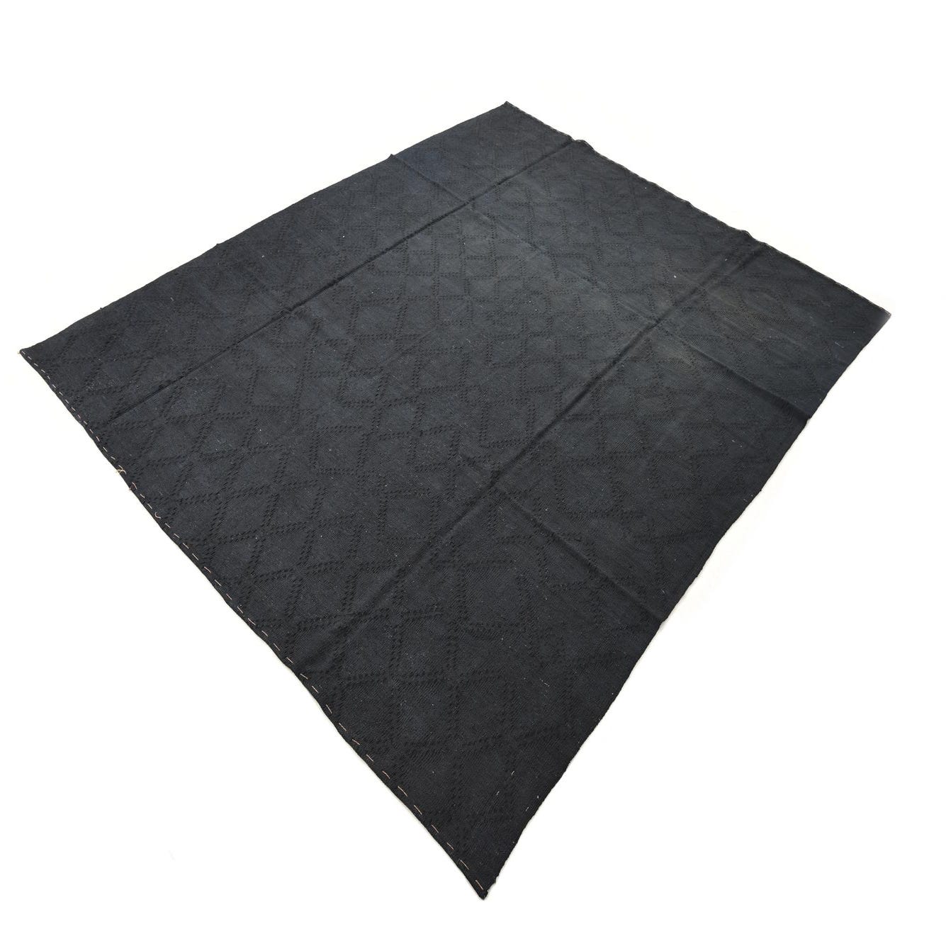An 8x10 rectangular black wool flatweave rug with a subtle tribal geometric pattern, suitable for a living room.