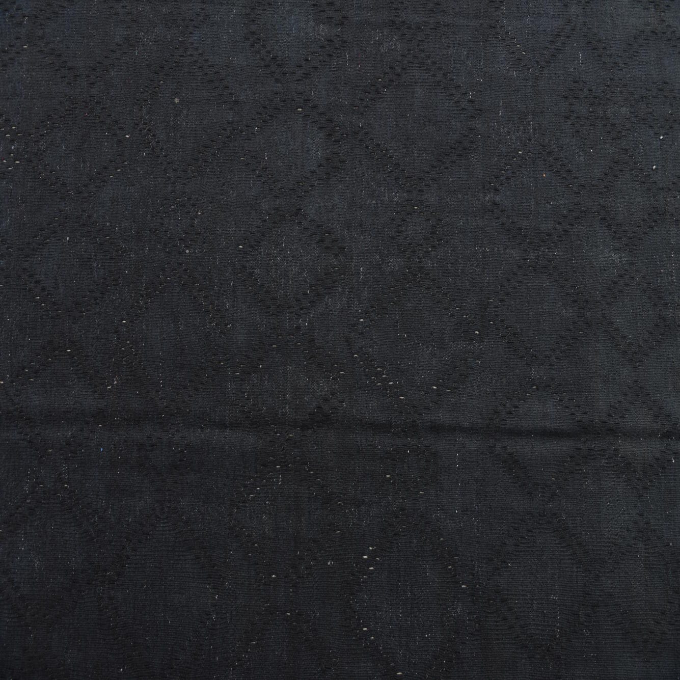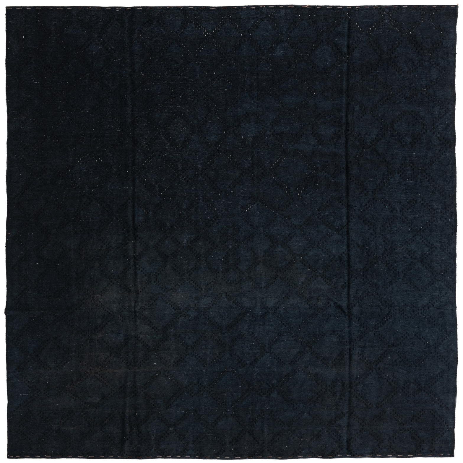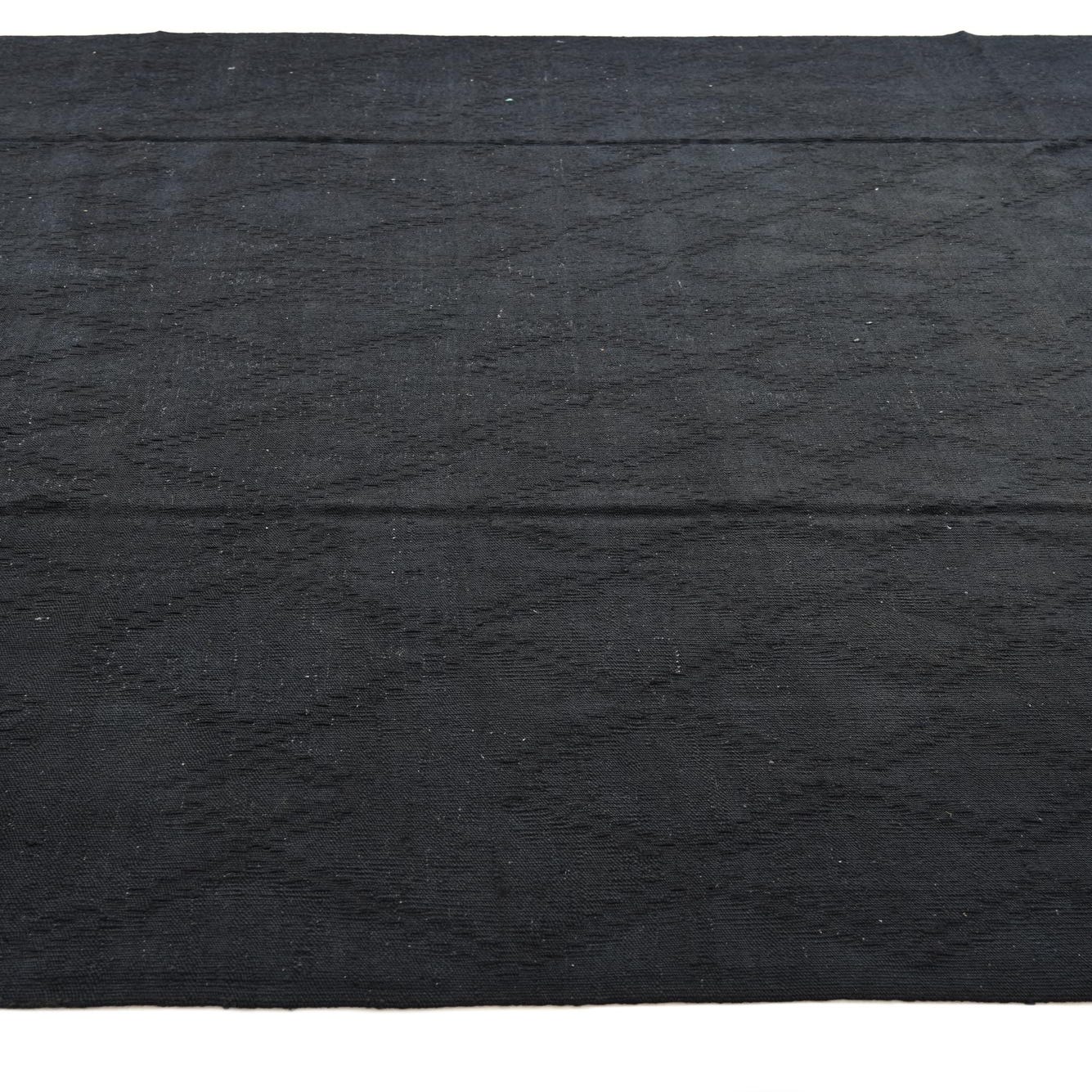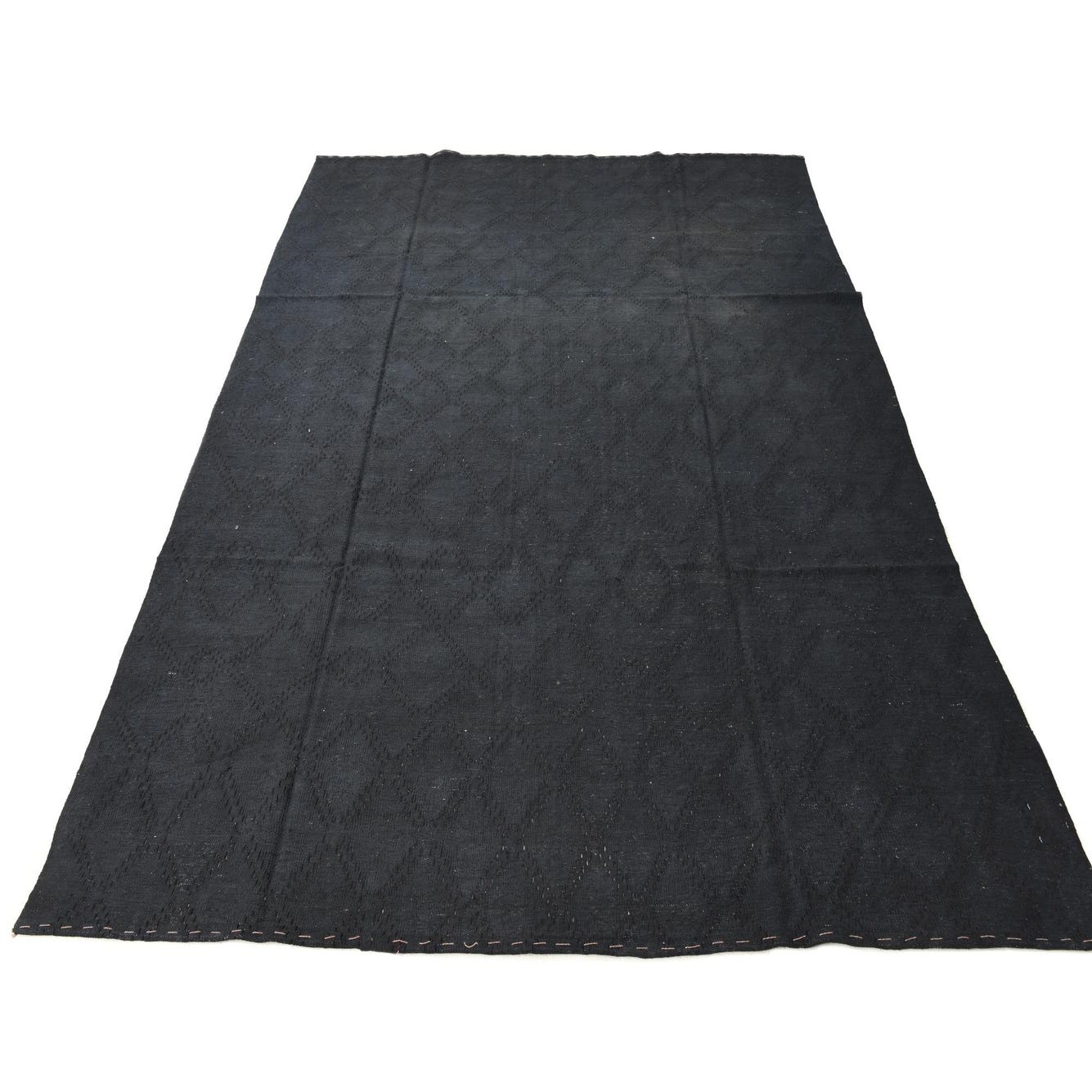 This Kilim Modern collection rug is handwoven from 100% wool, offering a durable and tactile flooring option. The piece measures 8x10 and is distinguished by its black background. Geometric diamond patterns repeat across the surface, creating a subtle, textured look that offers both visual interest and contemporary appeal.