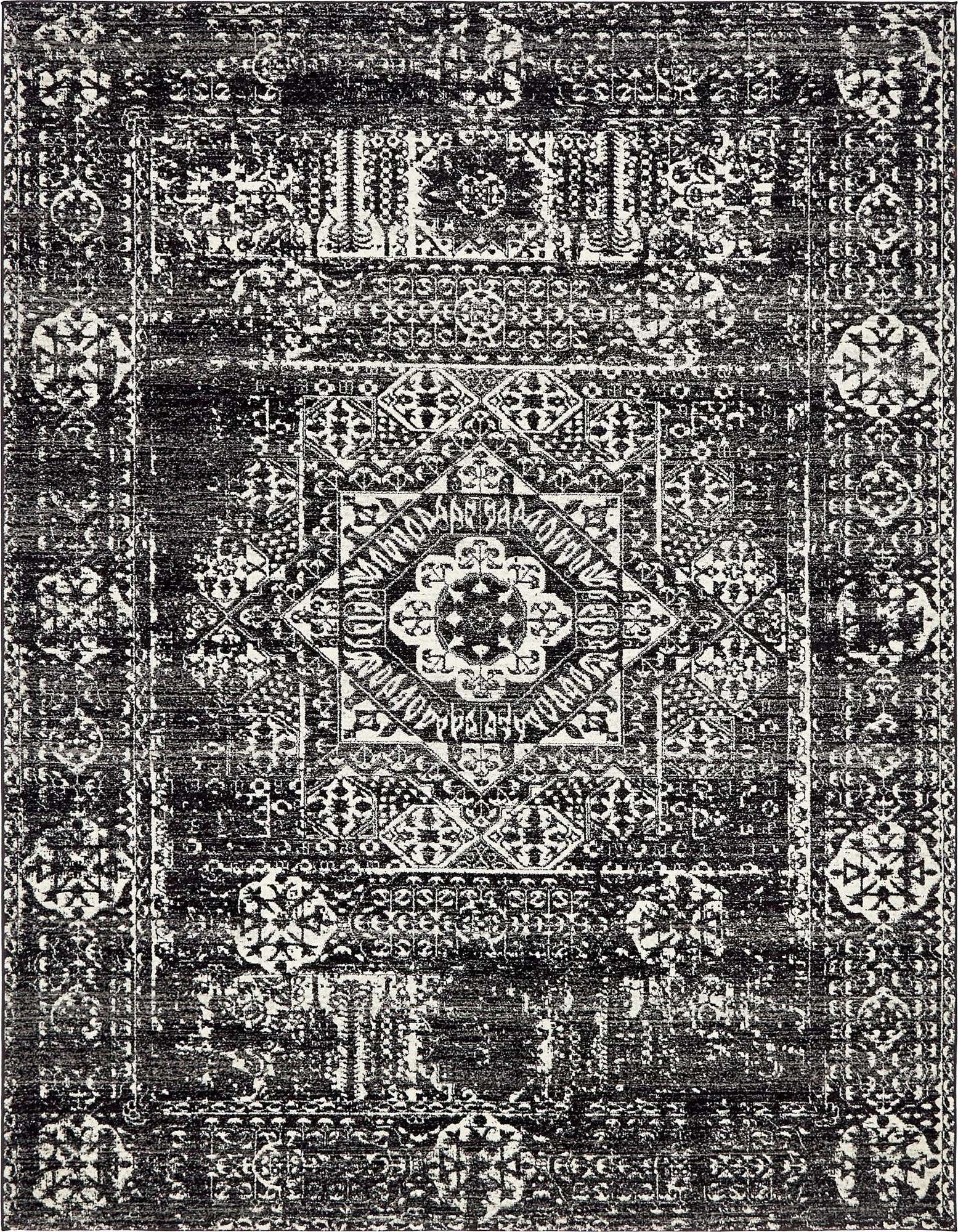 Primary color is Black. Colors in this rug include: Black, Gray, Ivory.