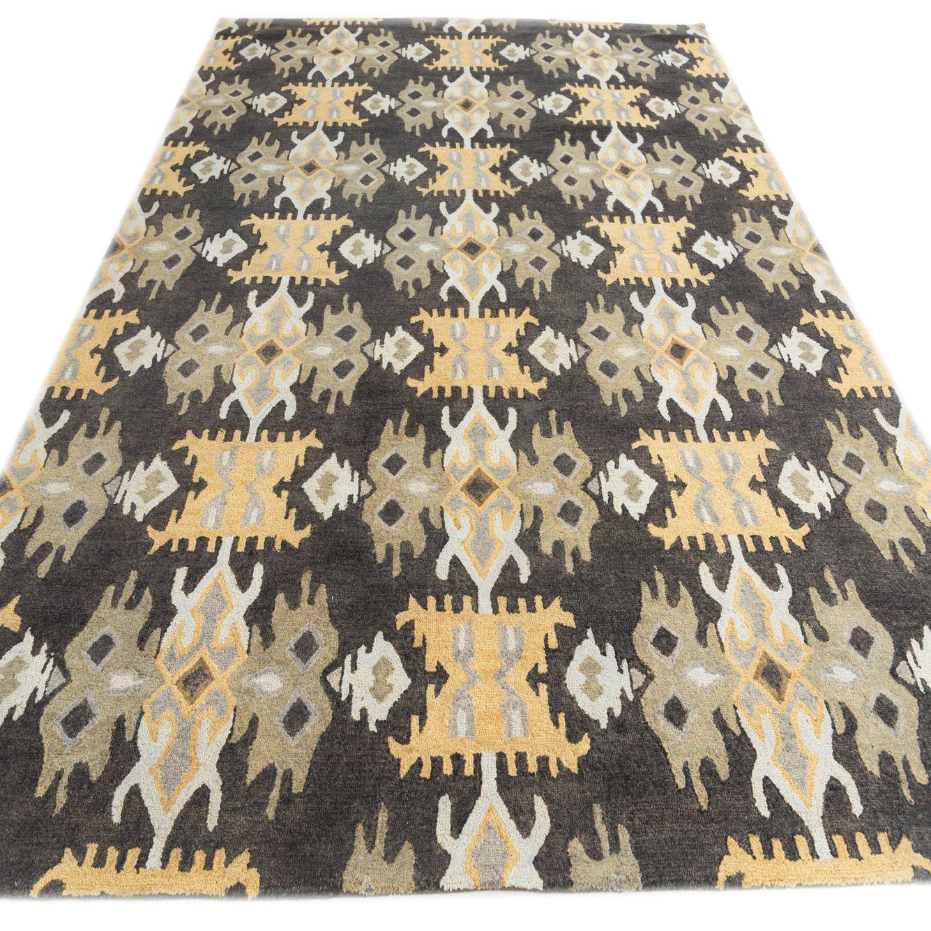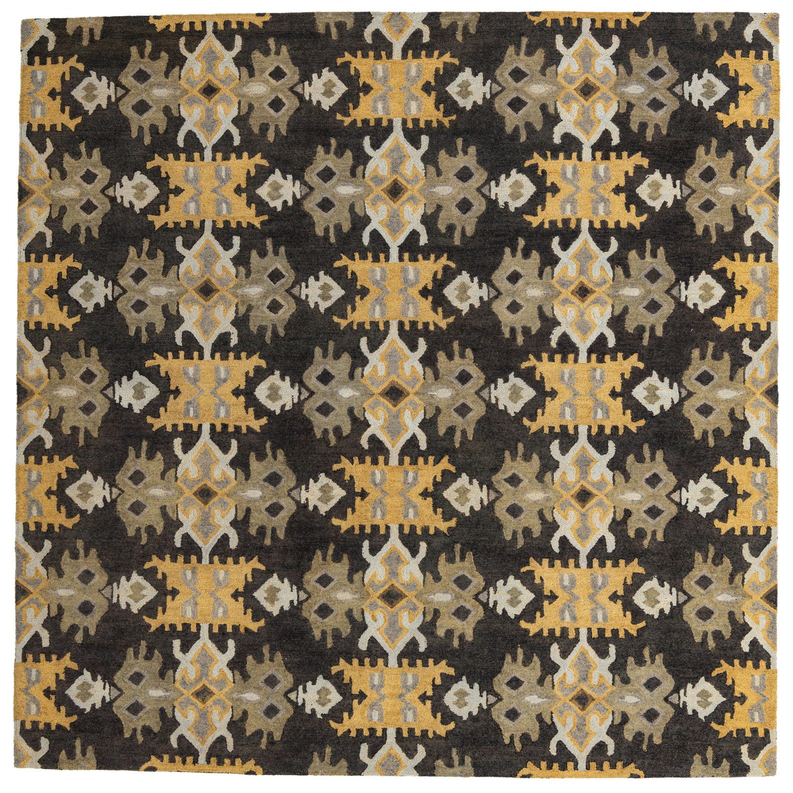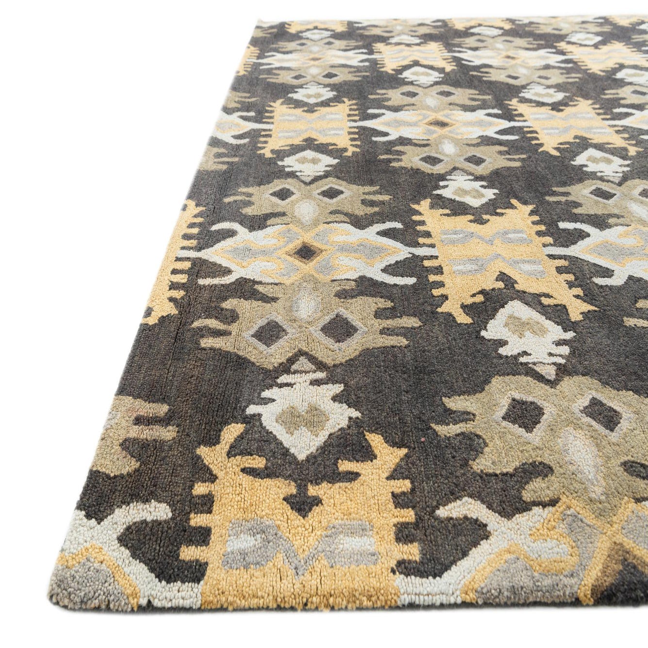 Primary color is Black. Colors in this rug include: Black, Gold, Gray, Ivory, Light Blue.