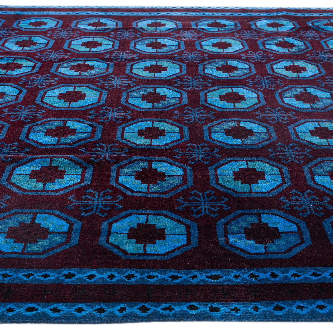 A rectangular 8x10 black and teal tribal rug with a modern geometric pattern and shag pile.