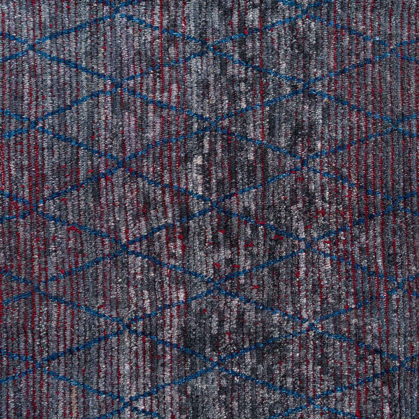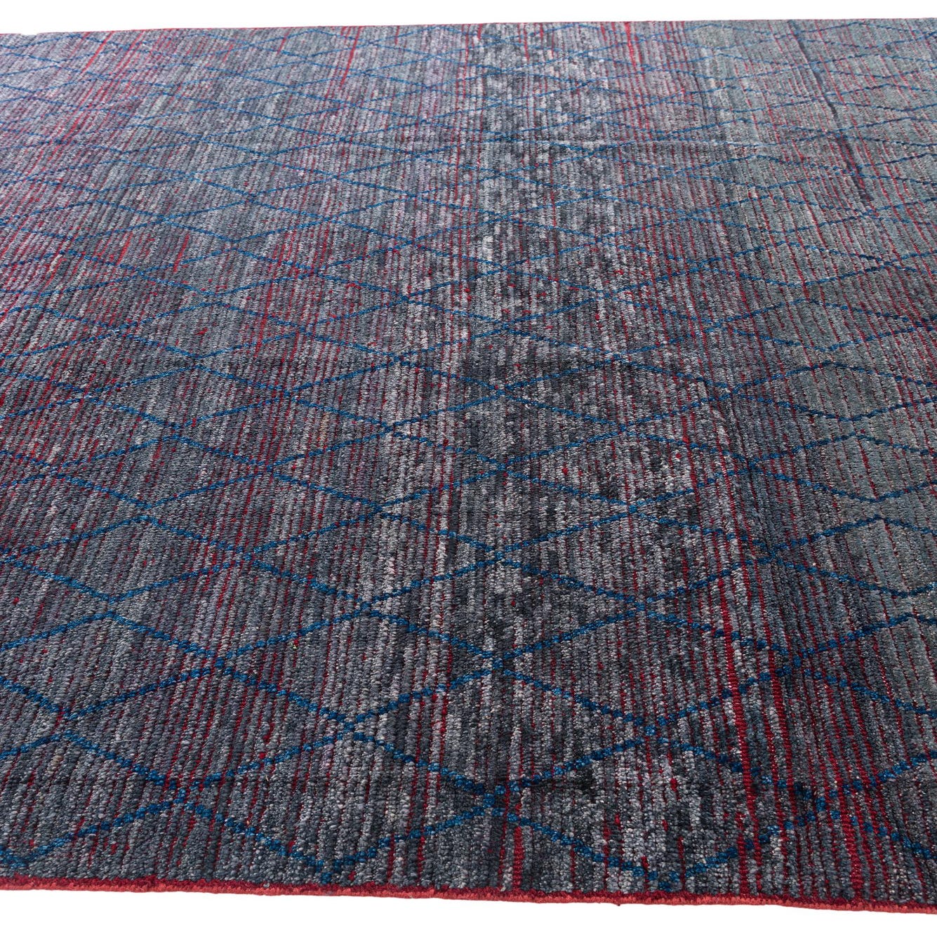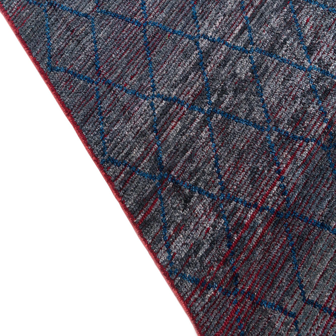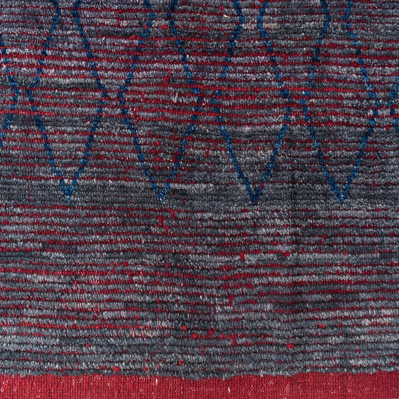 This 8x10 Moroccan collection rug, hand-knotted from 100% wool, presents a bold yet nuanced design? skillfully capturing the essence of Moroccan inspiration. The rug features a deep black background overlaid with a vibrant pattern combining navy blue, red, and gray, offering a sense of depth and intricacy. Its textured weave and slight variations in the hues provide an authentic, handmade appeal that complements its traditional craftsmanship.