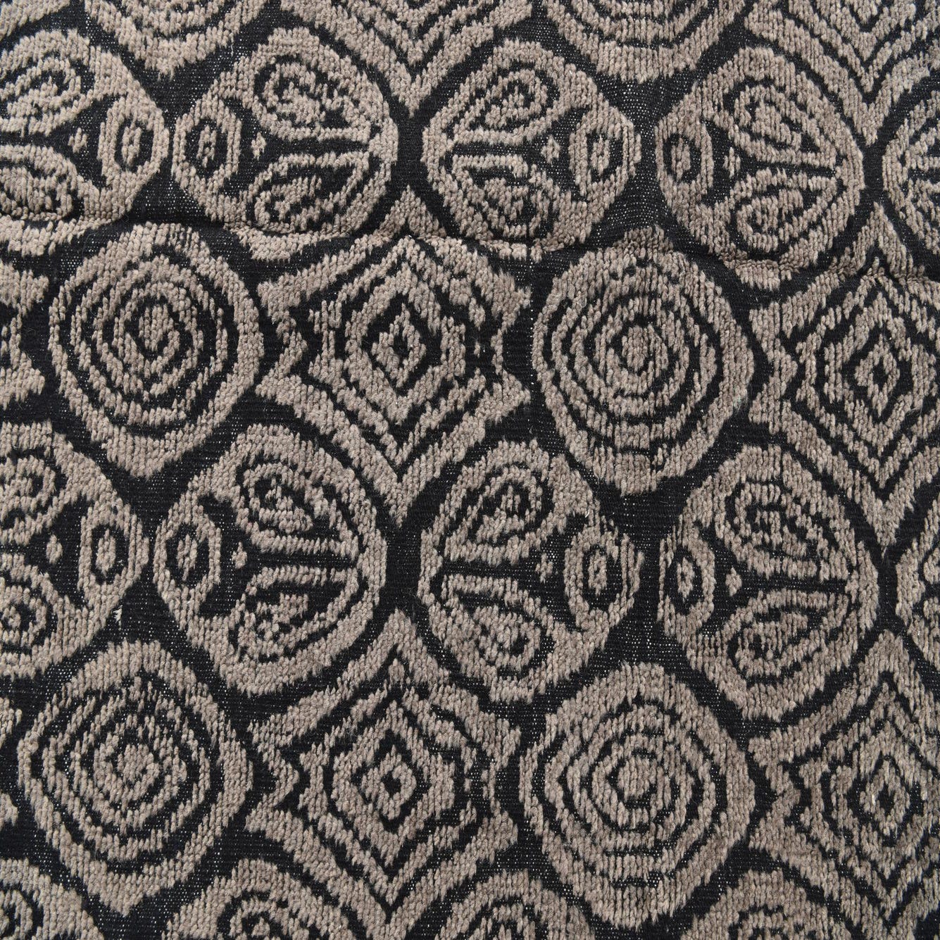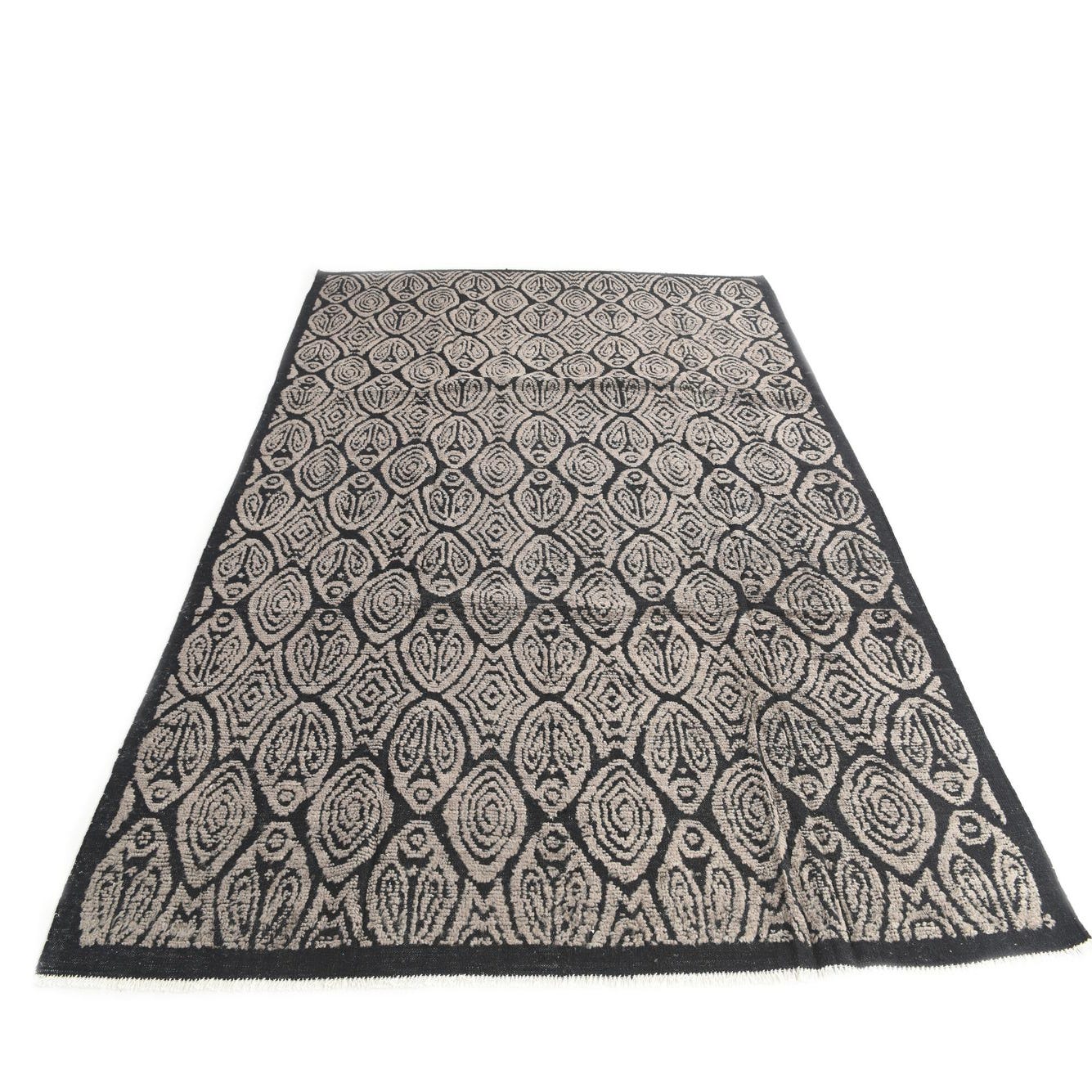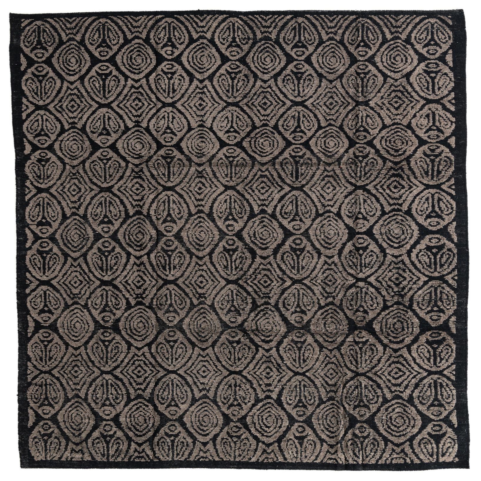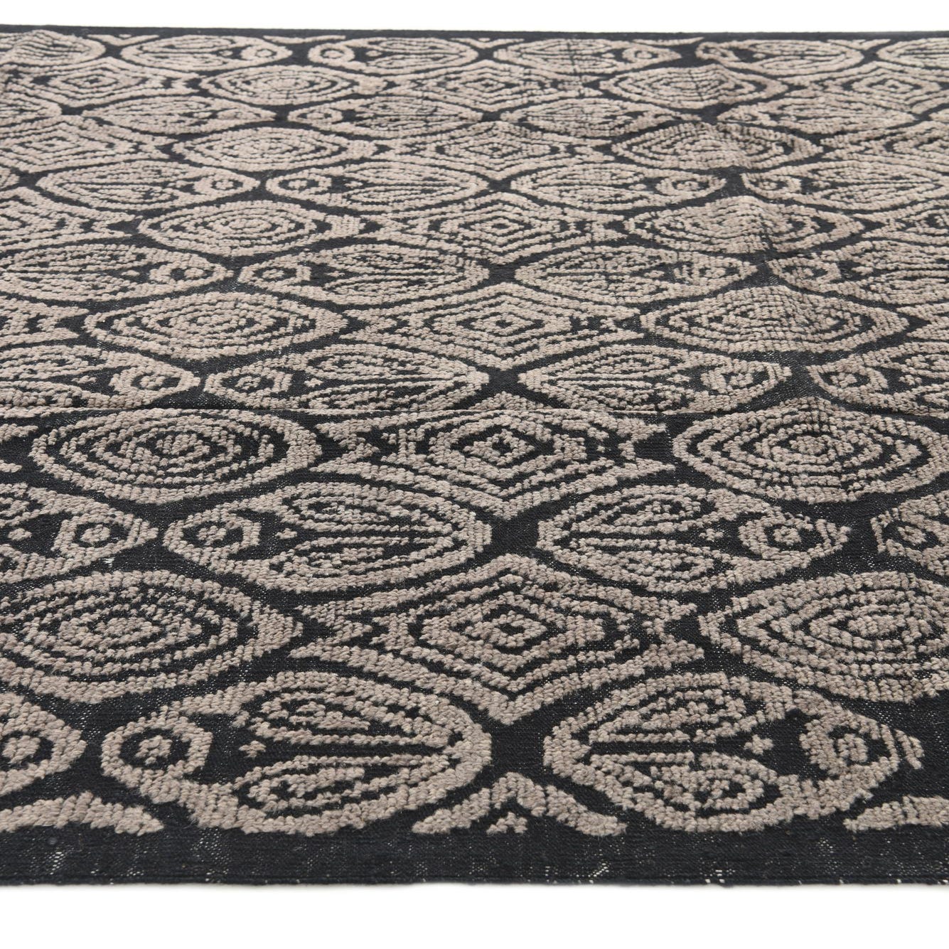 Set against the deep black background, the brown pattern lends a warm, inviting contrast that complements a variety of décor themes. The tactile quality of the woolen fibers adds depth to the pattern, resulting in a rug that isn't just visually appealing but also provides a comfortable surface.