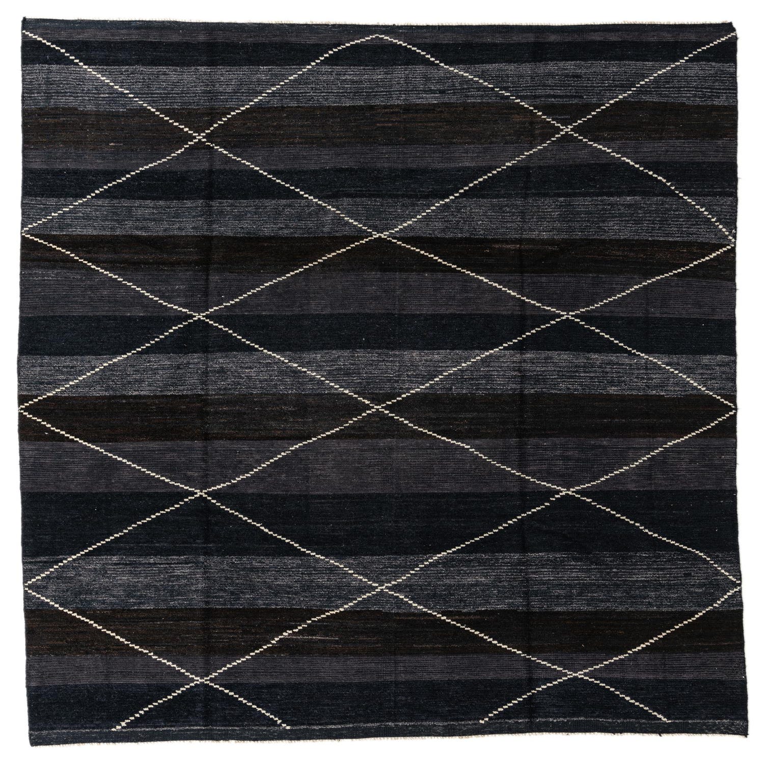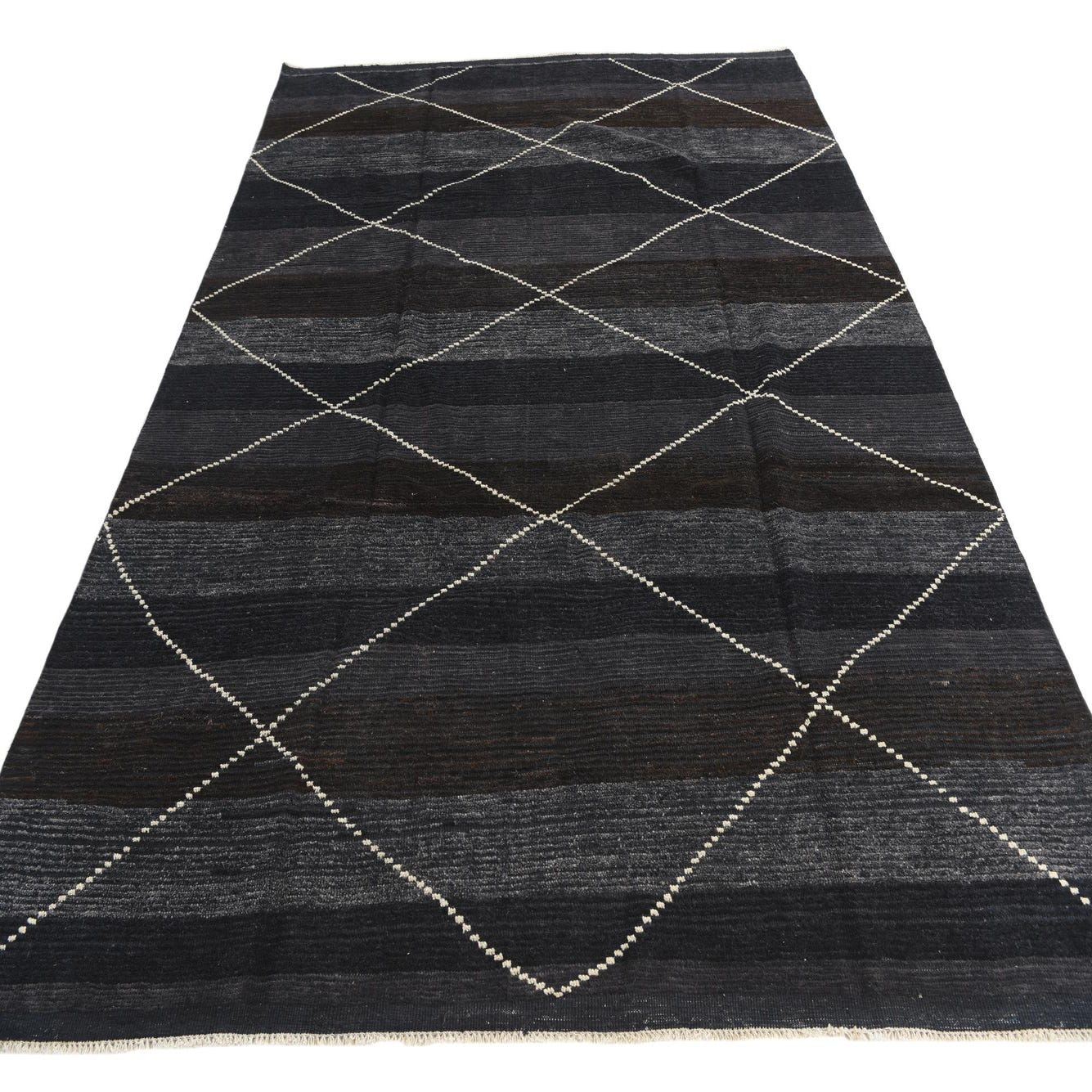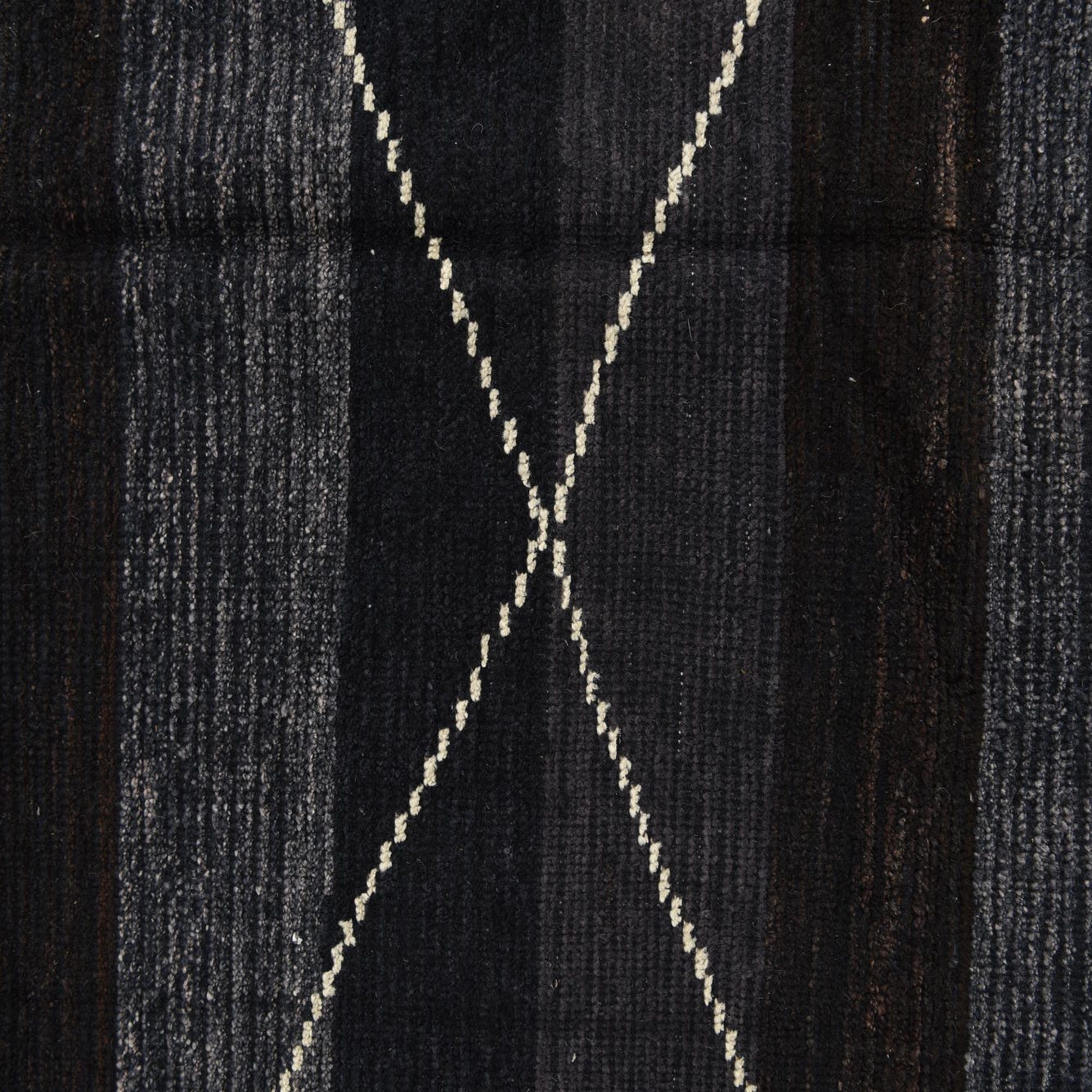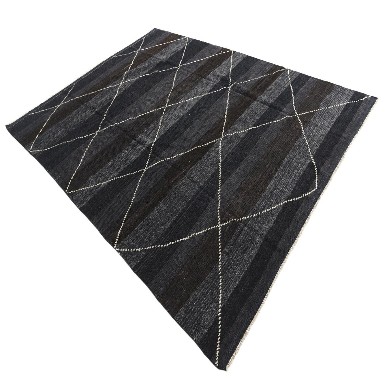 A rectangular 8x10 black wool shag rug with varying horizontal black stripes and a white diamond lattice pattern.