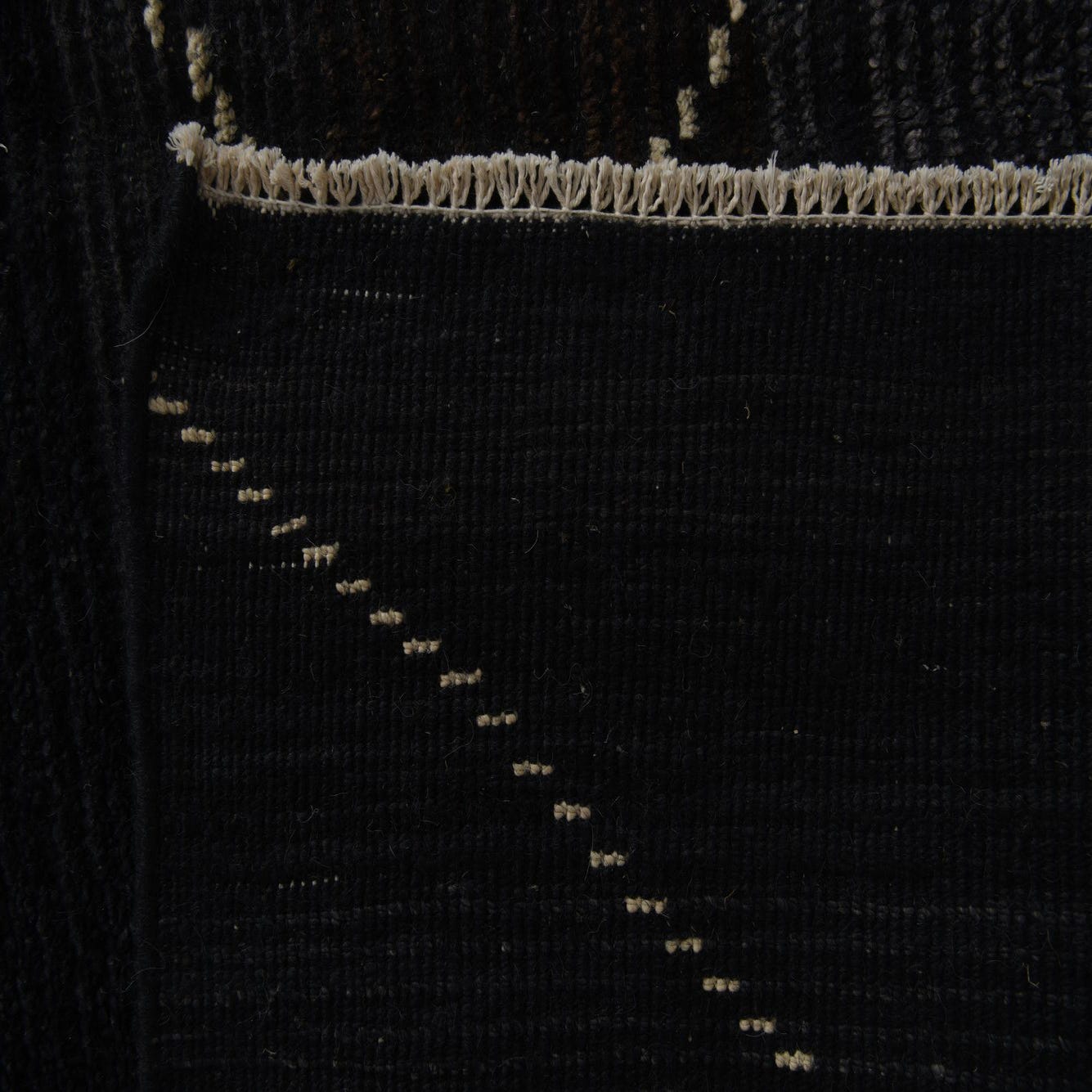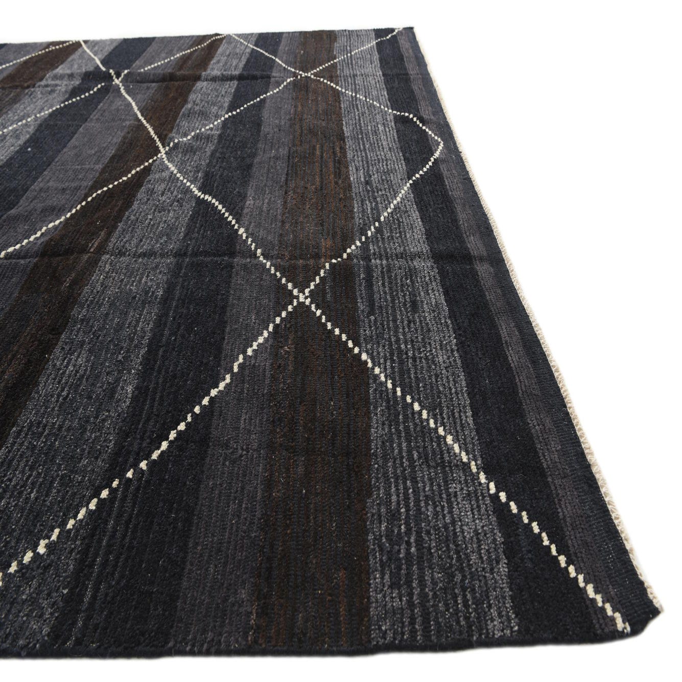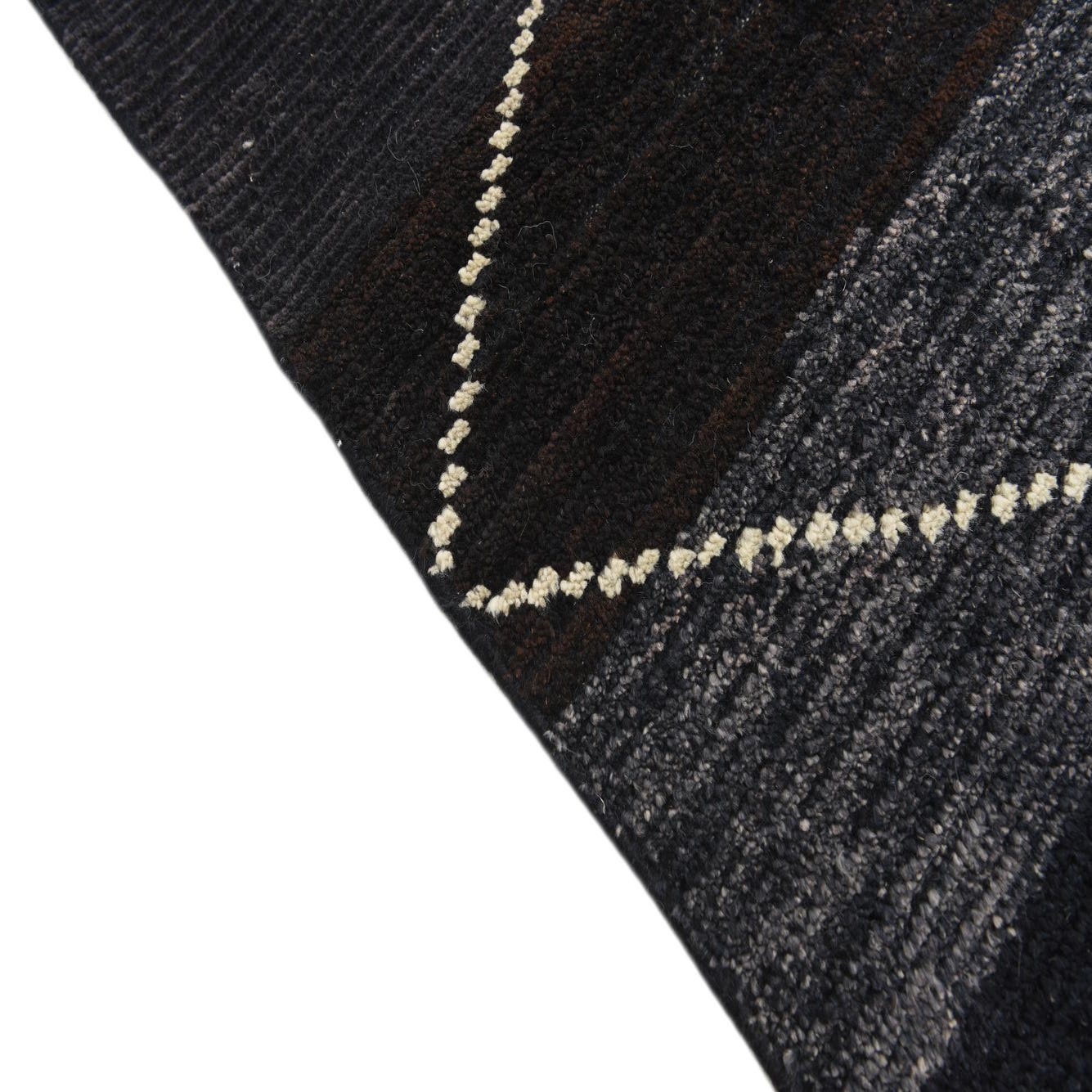 This Moroccan Collection rug is a refined 8x10 hand-knotted piece crafted from 100% wool, offering durability and a plush texture. The design features a bold black background with an engaging geometric pattern of intersecting lines in contrasting ivory, enhanced by subtle infusions of brown and gray hues. The addition of fringe along the edges introduces a traditional touch to its contemporary aesthetic.