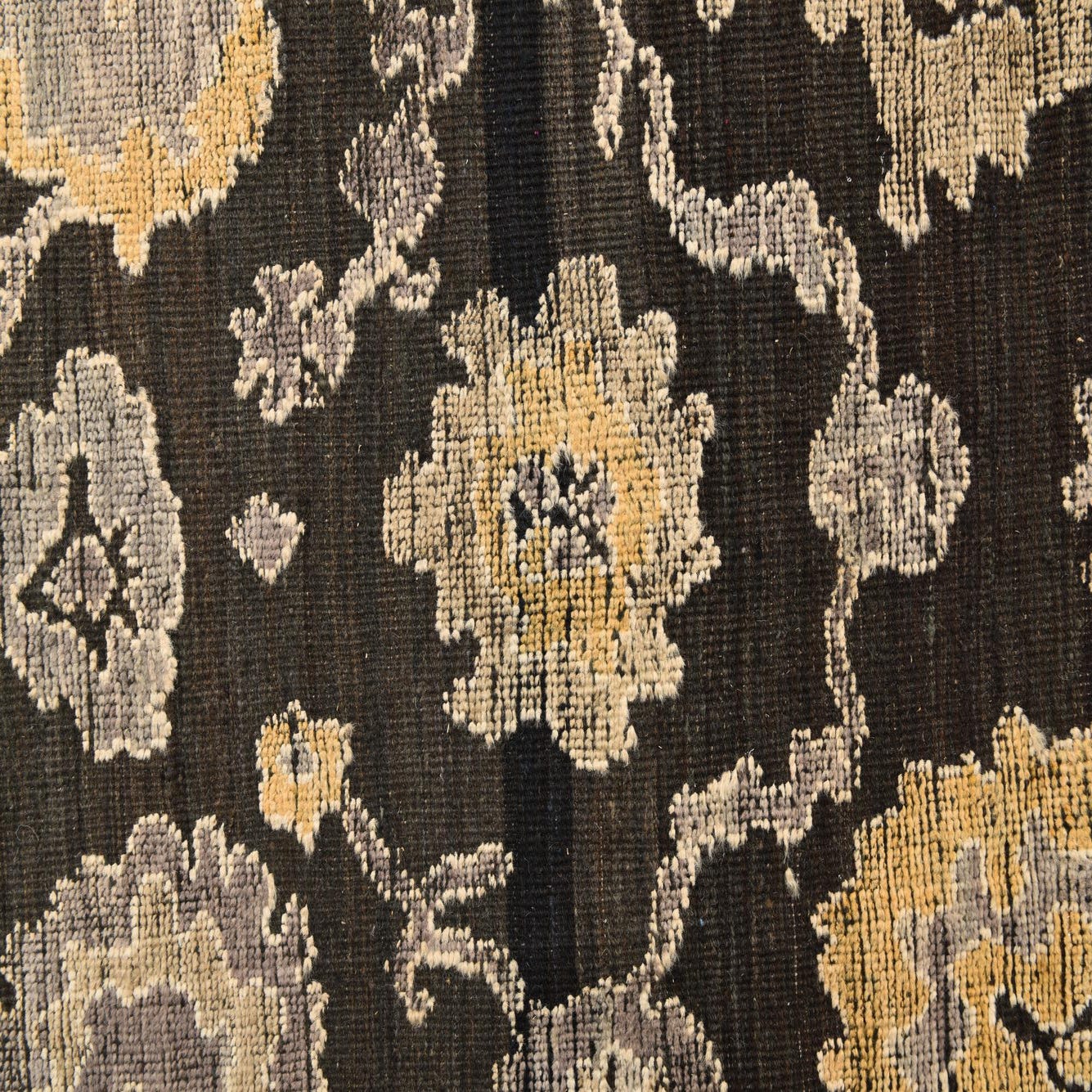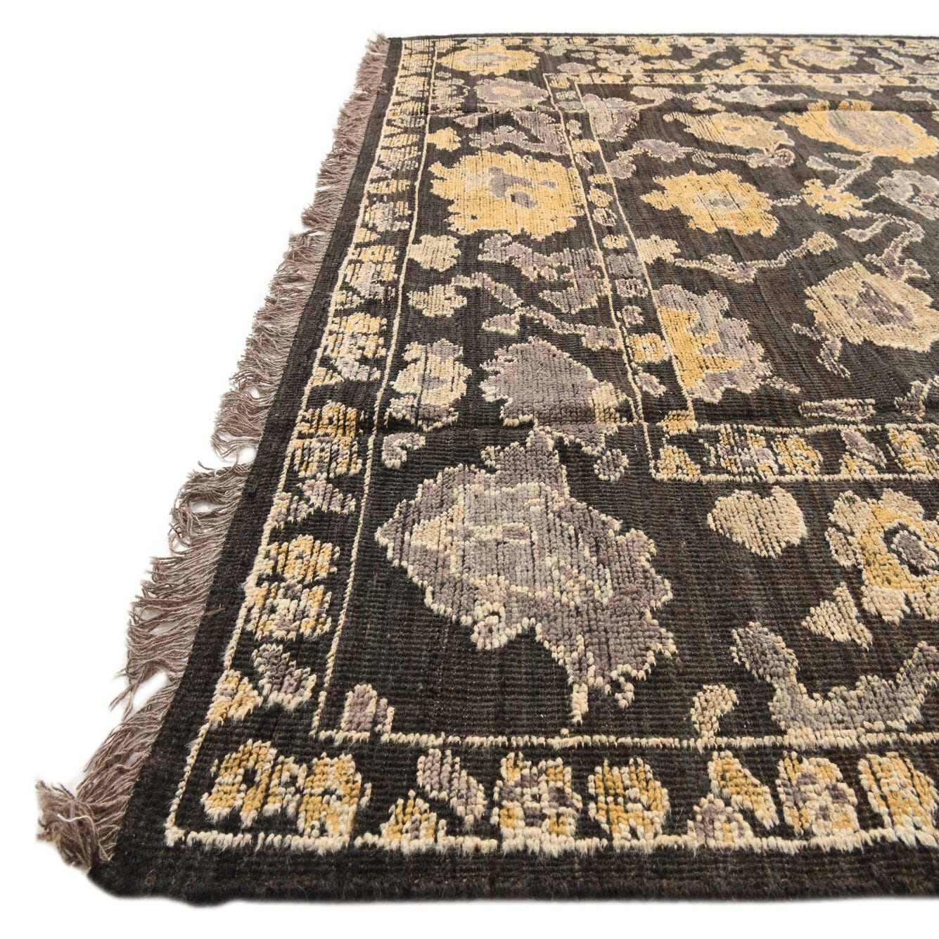 A rectangular 8x10 black wool rug with a modern floral pattern in yellow and gray, featuring a textured pile and fringe.
