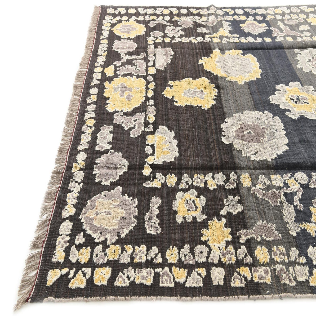 An 8x10 rectangular black wool rug with a modern abstract pattern featuring yellow and gray floral motifs and a decorative border.