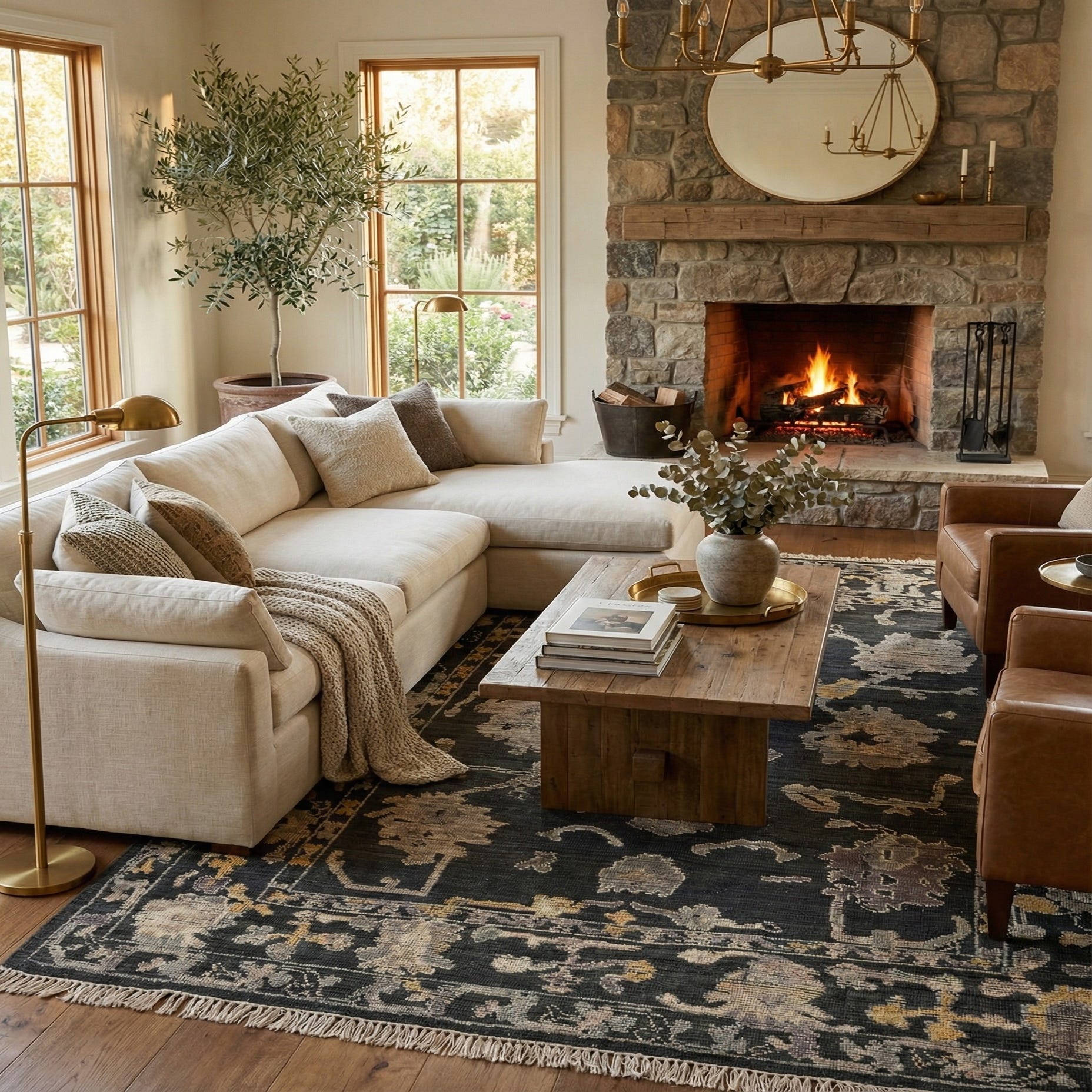 This rug's sophisticated color scheme and timeless design allow for versatile placement in various interior design styles. It would be a captivating foundation for a living room or dining area in settings that lean towards modern, transitional, or even industrial, due to its ability to anchor spaces with its distinct yet muted colors. Furthermore, the rug can serve as a tasteful contrast in a brightly colored room or complement the understated elegance of a minimalist space.