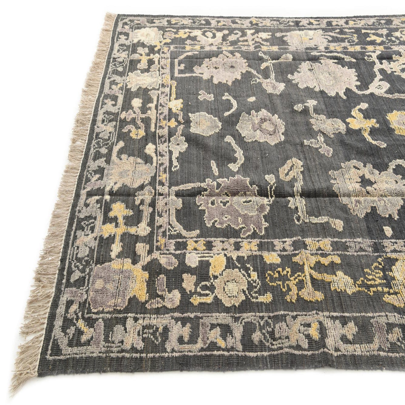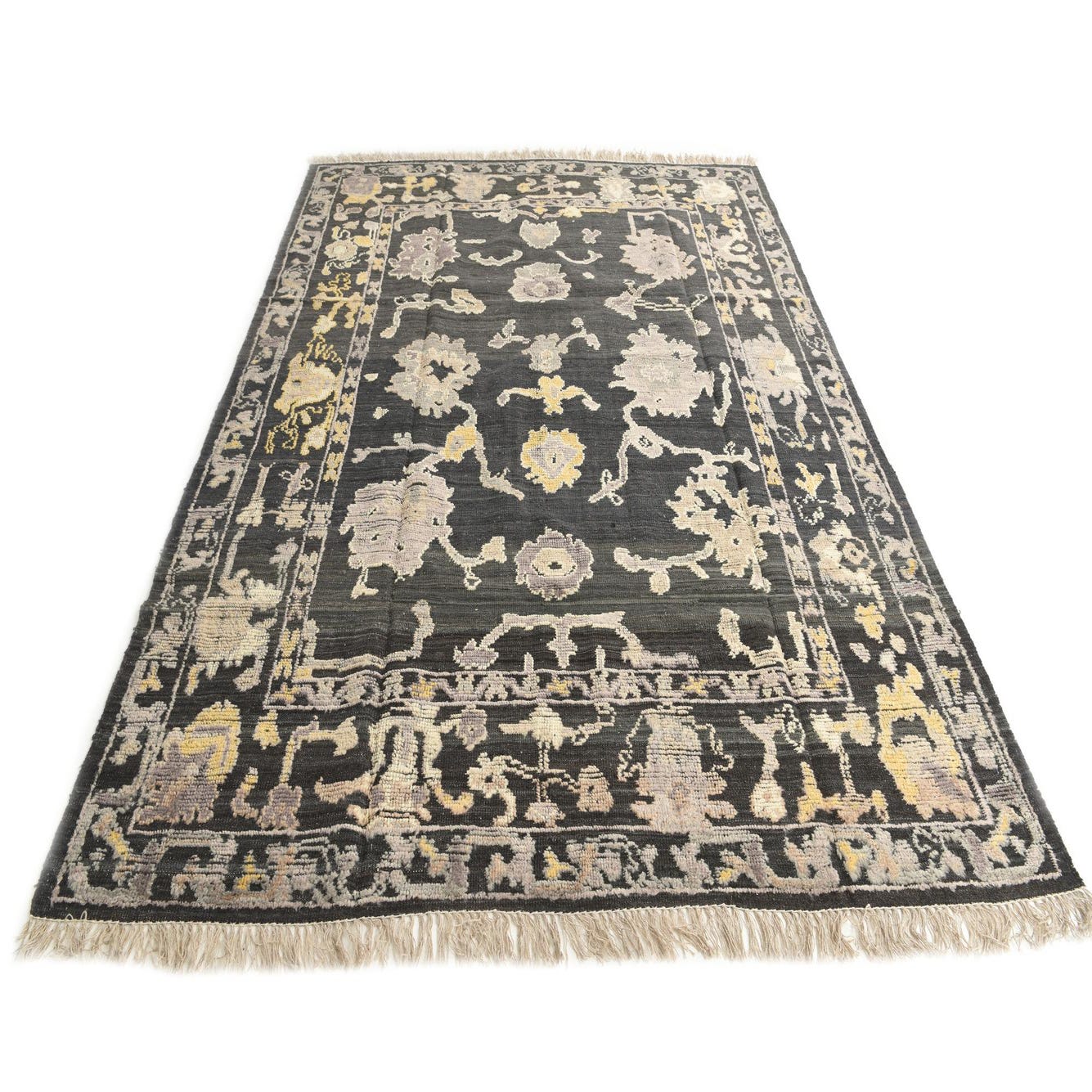An 8x10 rectangular Oushak rug with a black background and abstract floral patterns in grey, beige, and gold, featuring a border.