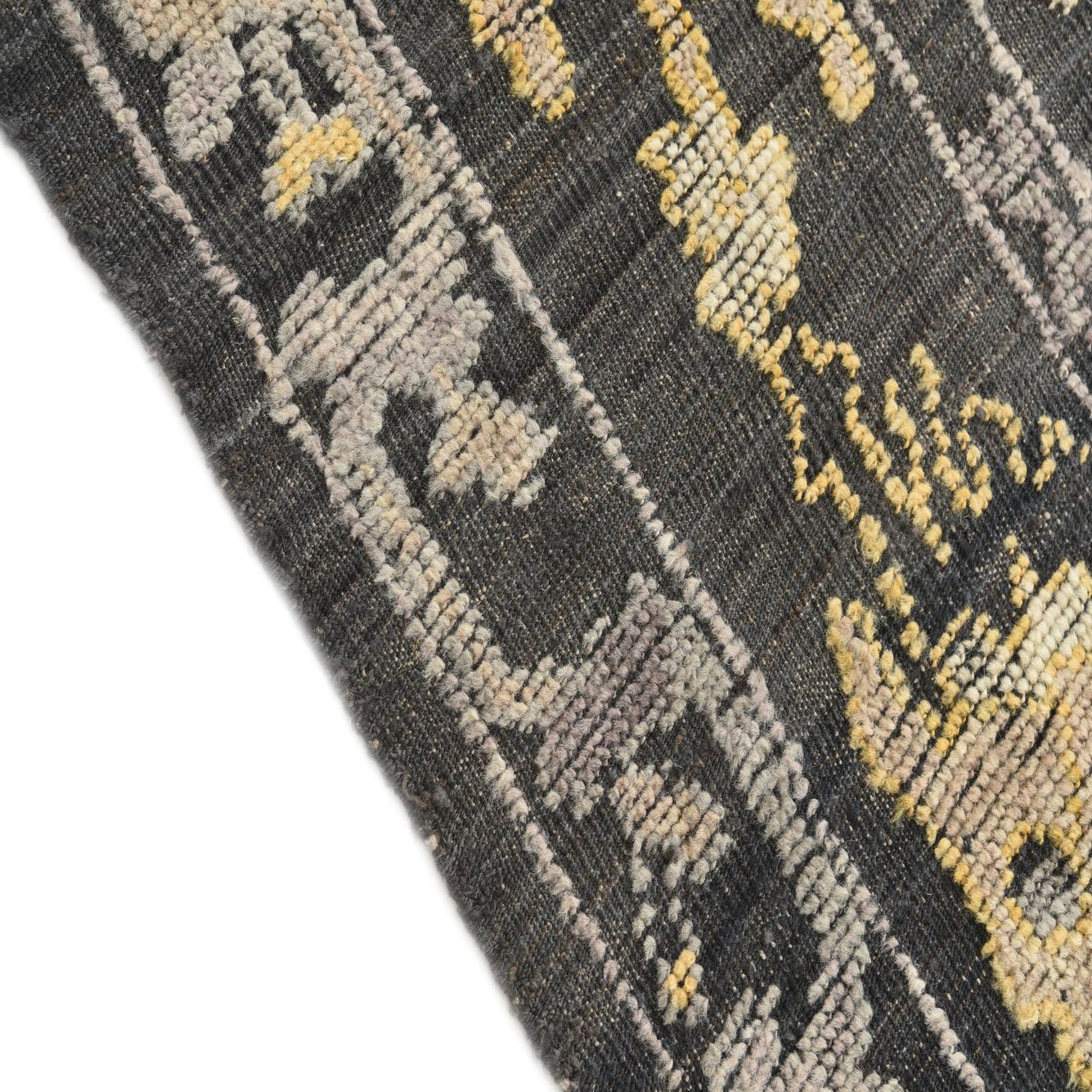 The Oushak collection rug is a hand-knotted piece crafted from 100% wool, detailing a harmonious blend of traditional design with a contemporary color palette. Measuring 8x10 feet, this rug showcases a distinguished floral and vine pattern, breathing life into the rich black background. The design is accentuated by shades of gray, ivory, light brown, and delicate touches of yellow, which bring a subdued vibrancy to the overall appearance.