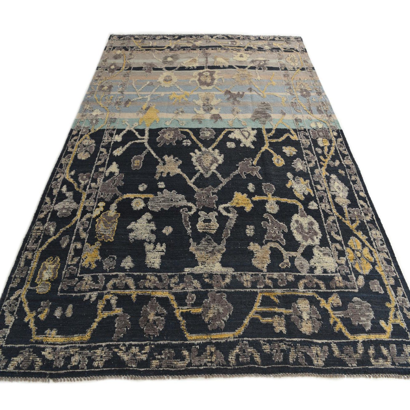 The Oushak Collection offers a hand-knotted 8x10 area rug crafted from 100% wool, ensuring a durable yet soft-to-touch surface ideal for various living spaces. This rug's design is noticeably characterized by an intricate, traditional Oushak pattern, showcasing a harmonious blend of Black as its background color, accentuated by motifs in Green, Ivory, Yellow, Light Blue, and Light Brown. The rich complexity of the pattern is thoughtfully balanced with a black base that amplifies the contrasting hues and lends the piece an air of sophistication.