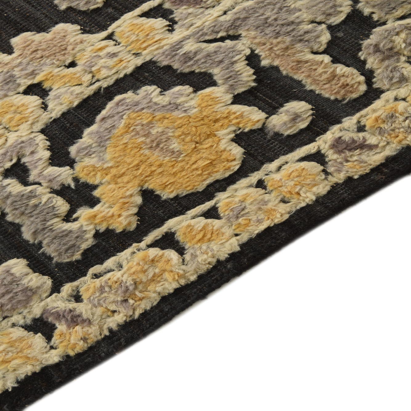 Primary color is Black. Colors in this rug include: Black, Ivory, Light Brown, Yellow, Gray.