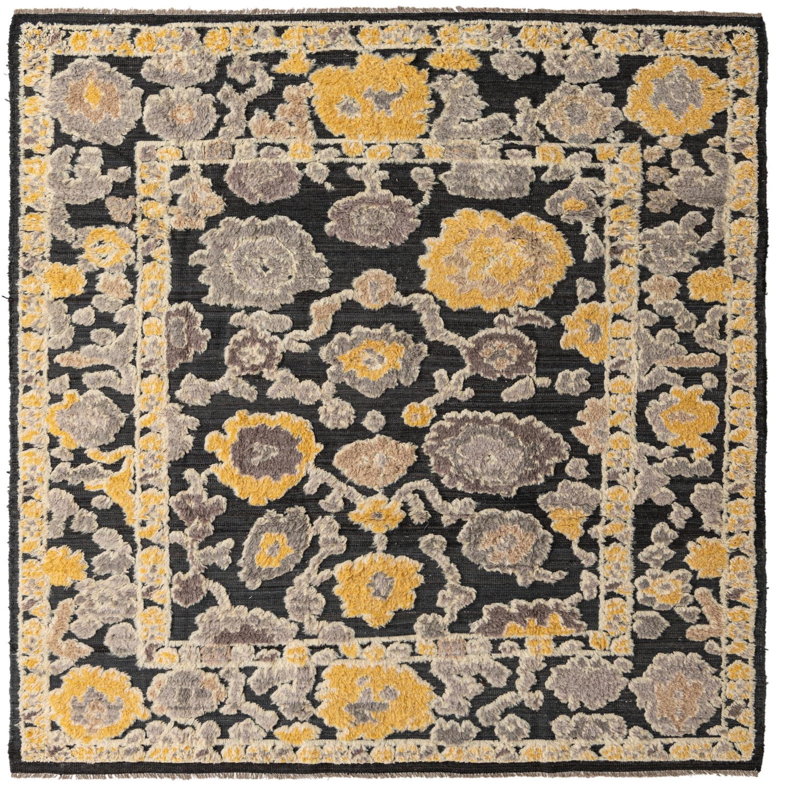 A rectangular 8x10 Oushak rug with a modern floral pattern in black, yellow, and gray, featuring a medium pile.