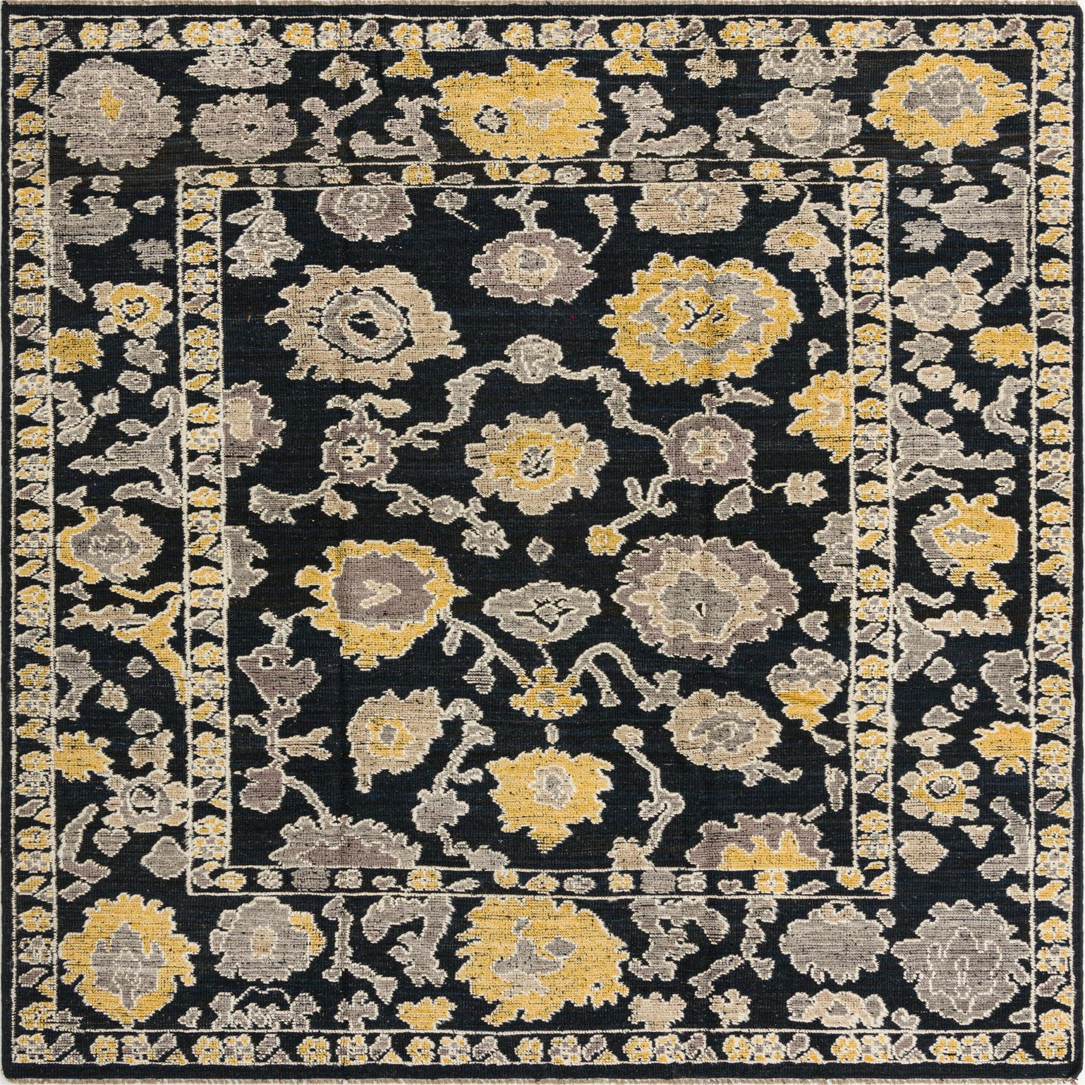 Primary color is Black. Colors in this rug include: Black, Ivory, Yellow, Gray.
