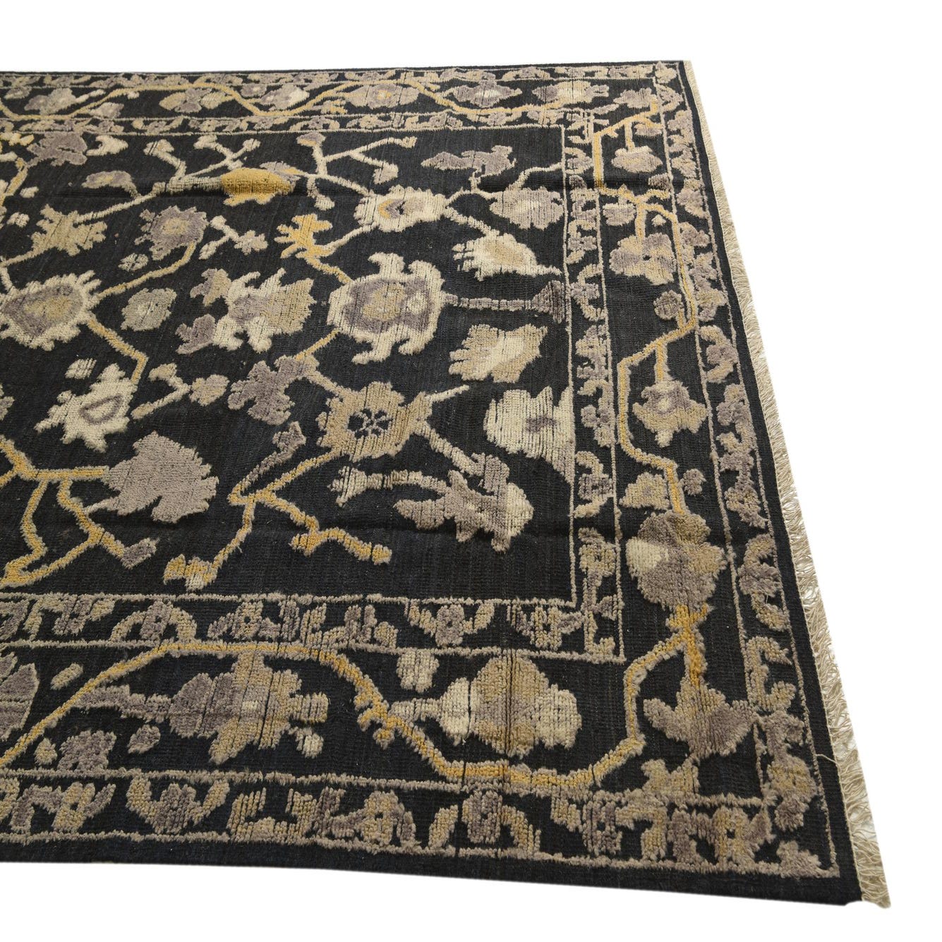 A handmade 8x10 rectangular Oushak rug in black wool, featuring a modern floral pattern with gold and grey accents.