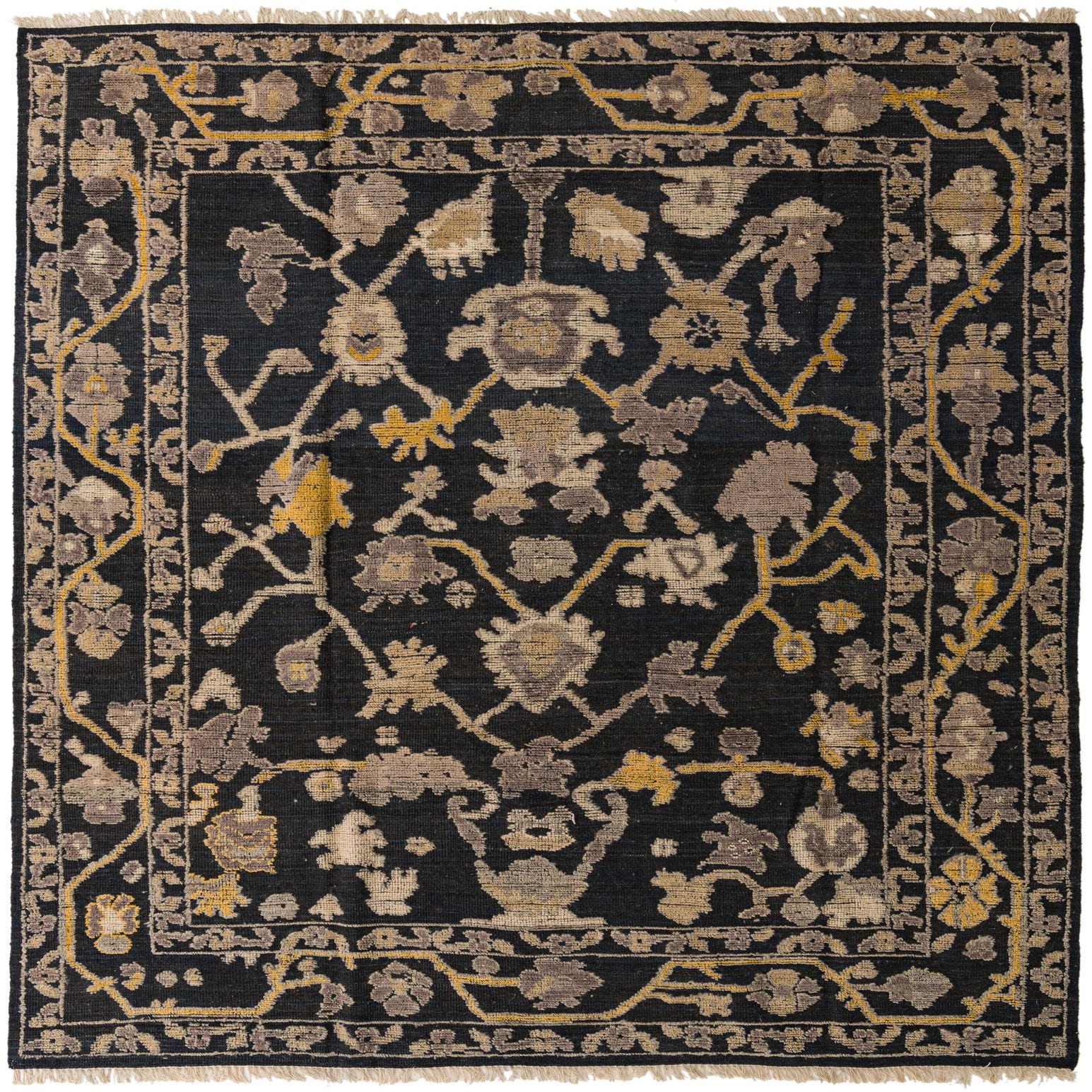 Primary color is Black. Colors in this rug include: Black, Ivory, Yellow, Gray.