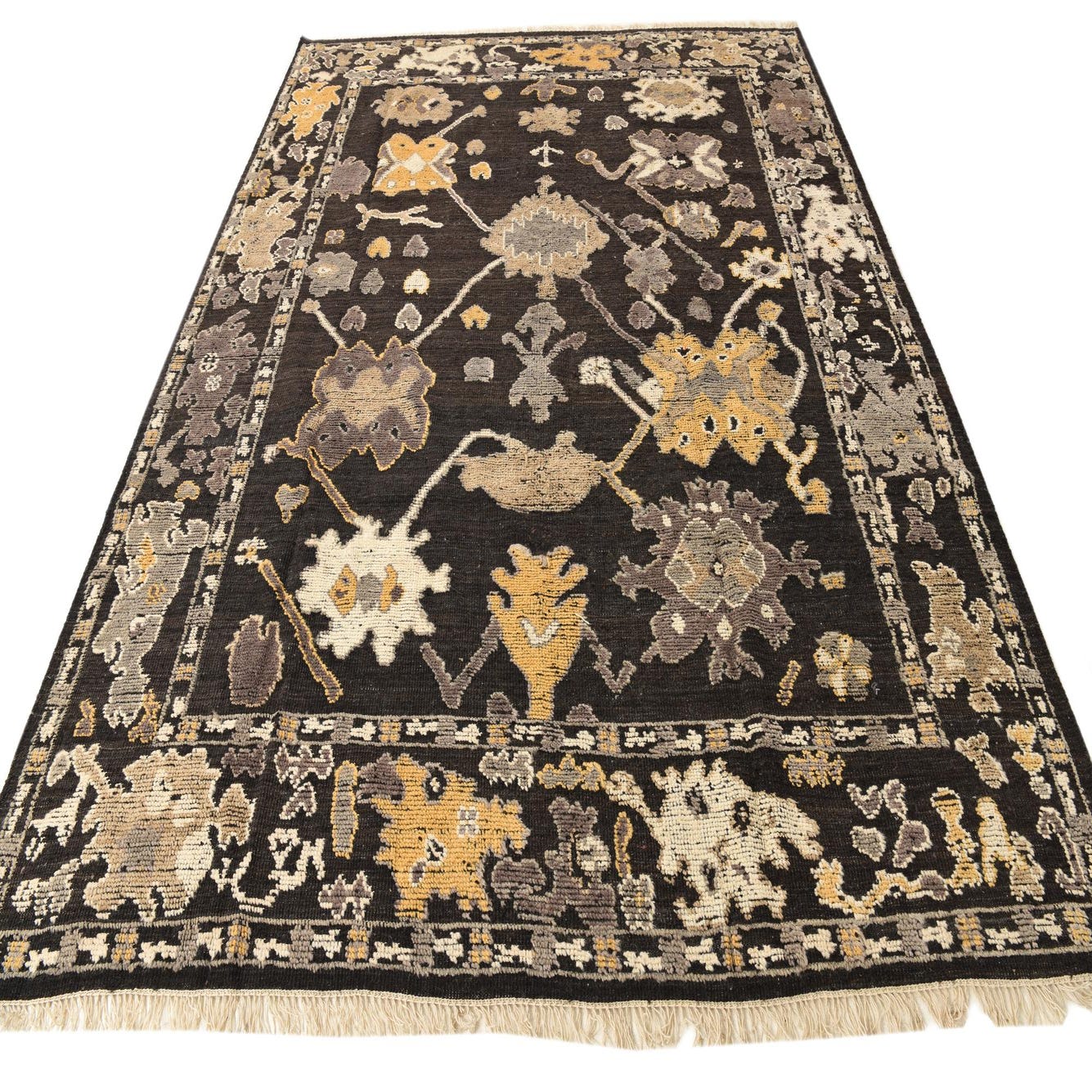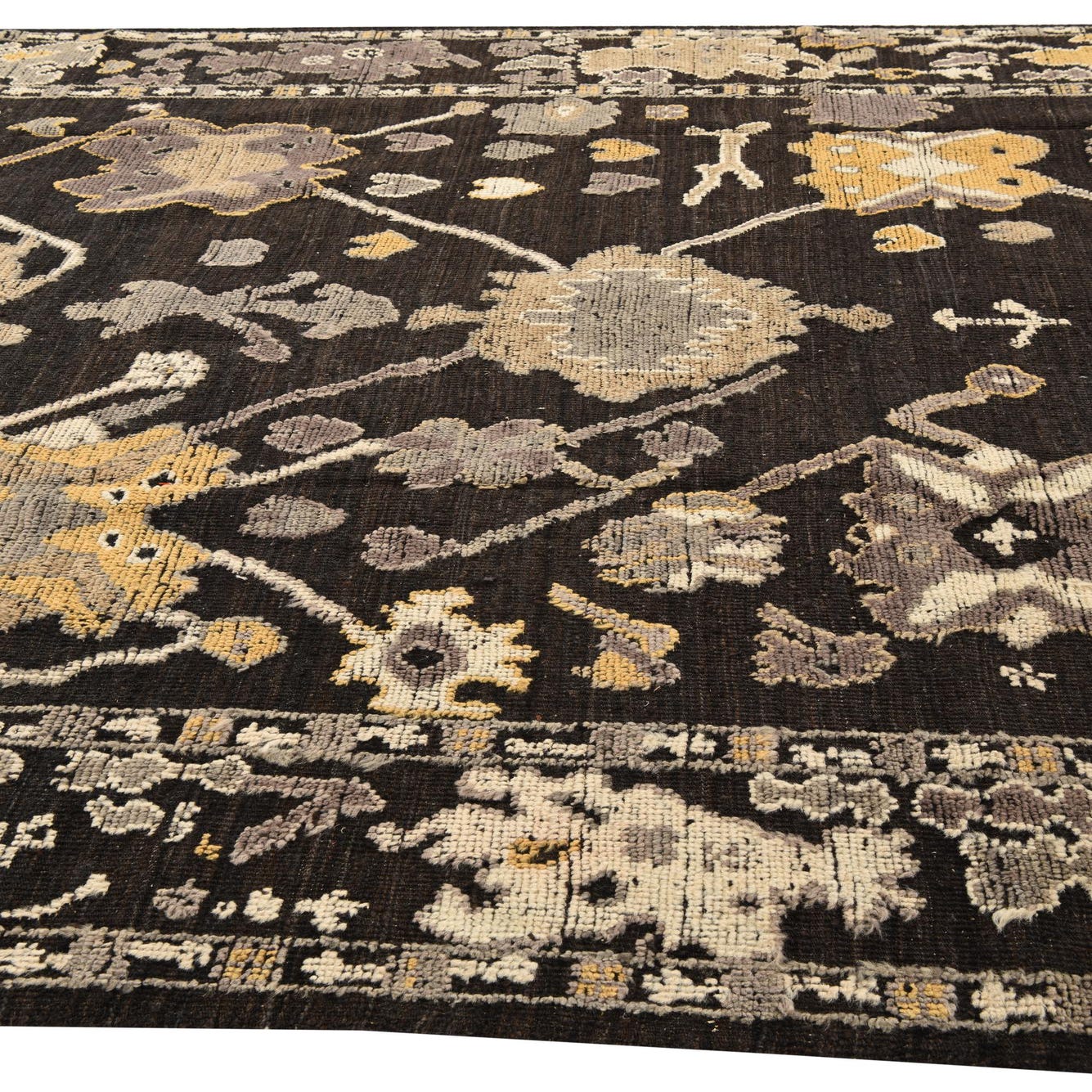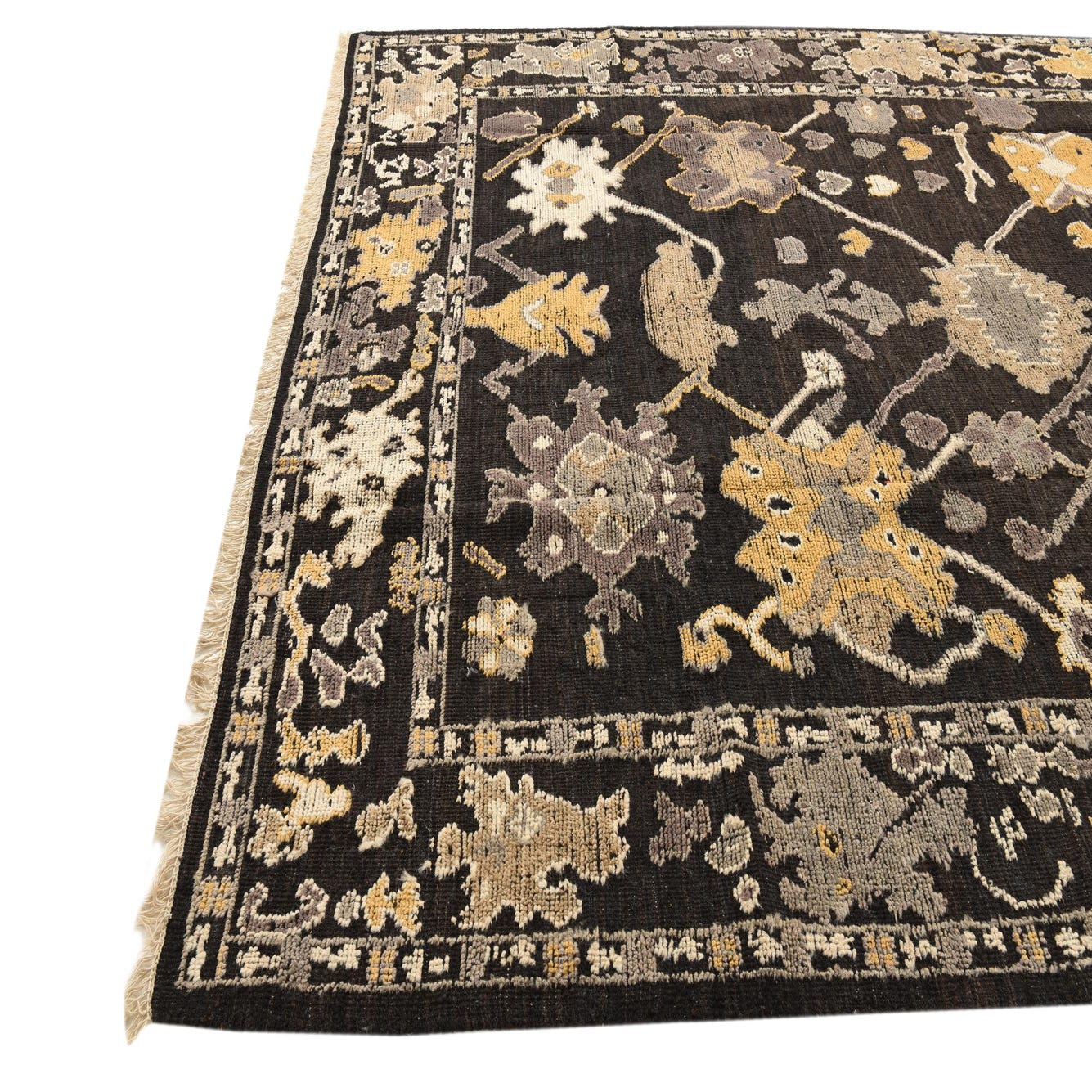 This Oushak collection rug is hand-knotted from 100% wool, offering both durability and a soft, plush texture underfoot. The 8x10 size makes it a substantial piece for spacious rooms. It features a striking black background, which serves as a dramatic canvas for the intricate pattern rendered in shades of gray, ivory, light brown, and yellow. The design is a blend of traditional floral motifs and foliage, elegantly spread across the rug, capturing the timeless essence of Oushak craftsmanship.