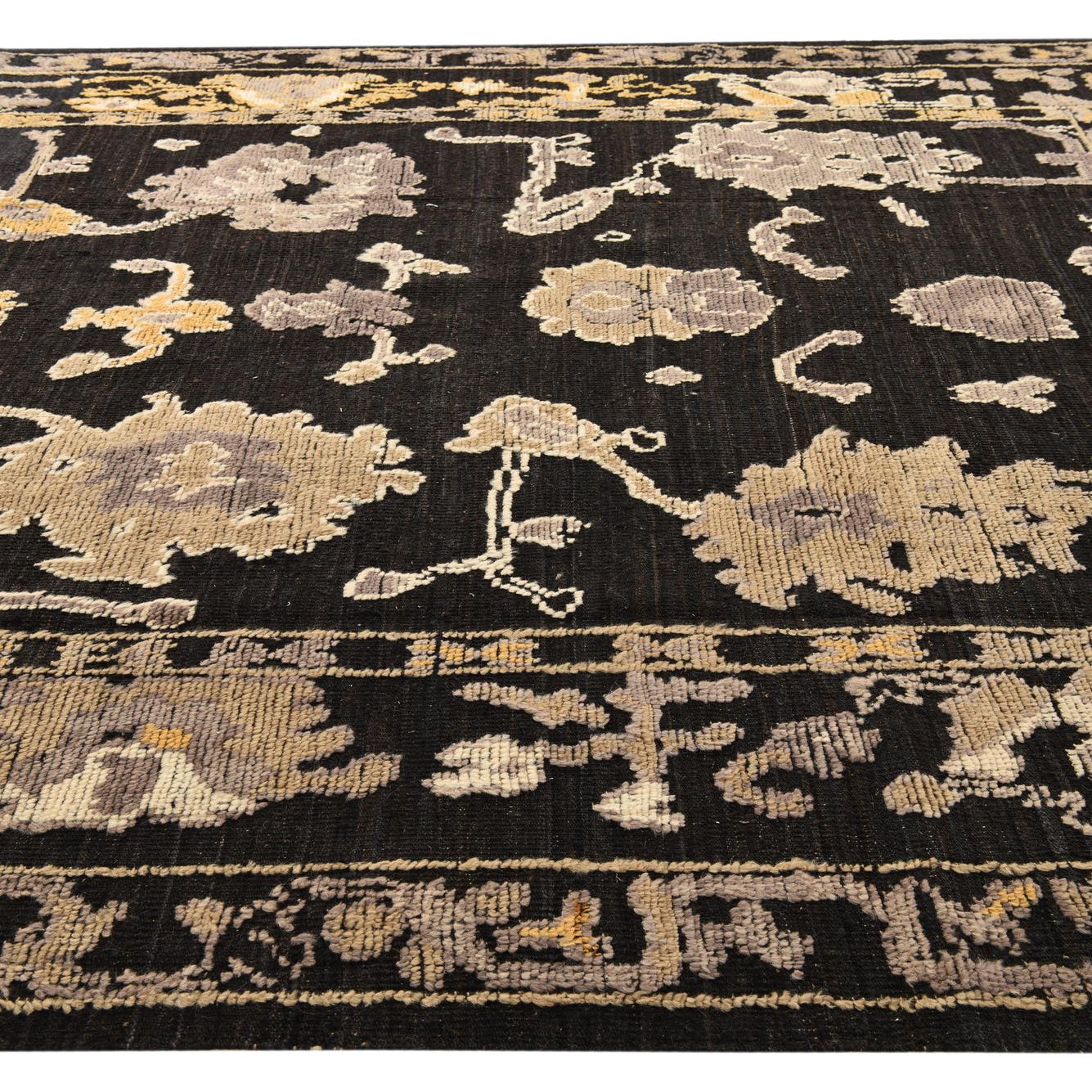 Hand-knotted of 100% wool, this rug folds traditional large-scale florals and scrolling vine motifs into a dramatic black field. The design reads with soft, antique character: beige, gray, ivory and light brown forms sit against the black background, while restrained touches of yellow bring subtle warmth and contrast. A framed border carries the same palette and organic shapes, and the surface shows gentle pile variation that highlights the pattern and gives a tactile, slightly lived-in texture underfoot.