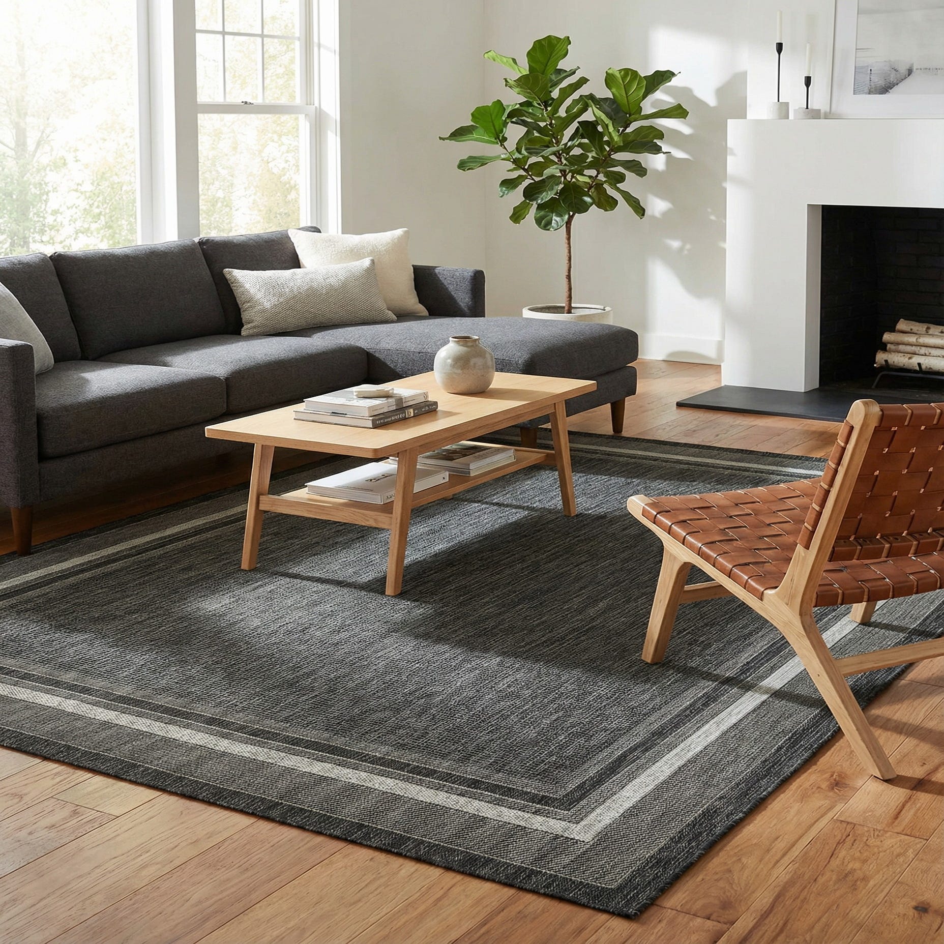 A rectangular 8x10 black modern indoor/outdoor rug with a multi-toned border, ideal for a patio or living room.