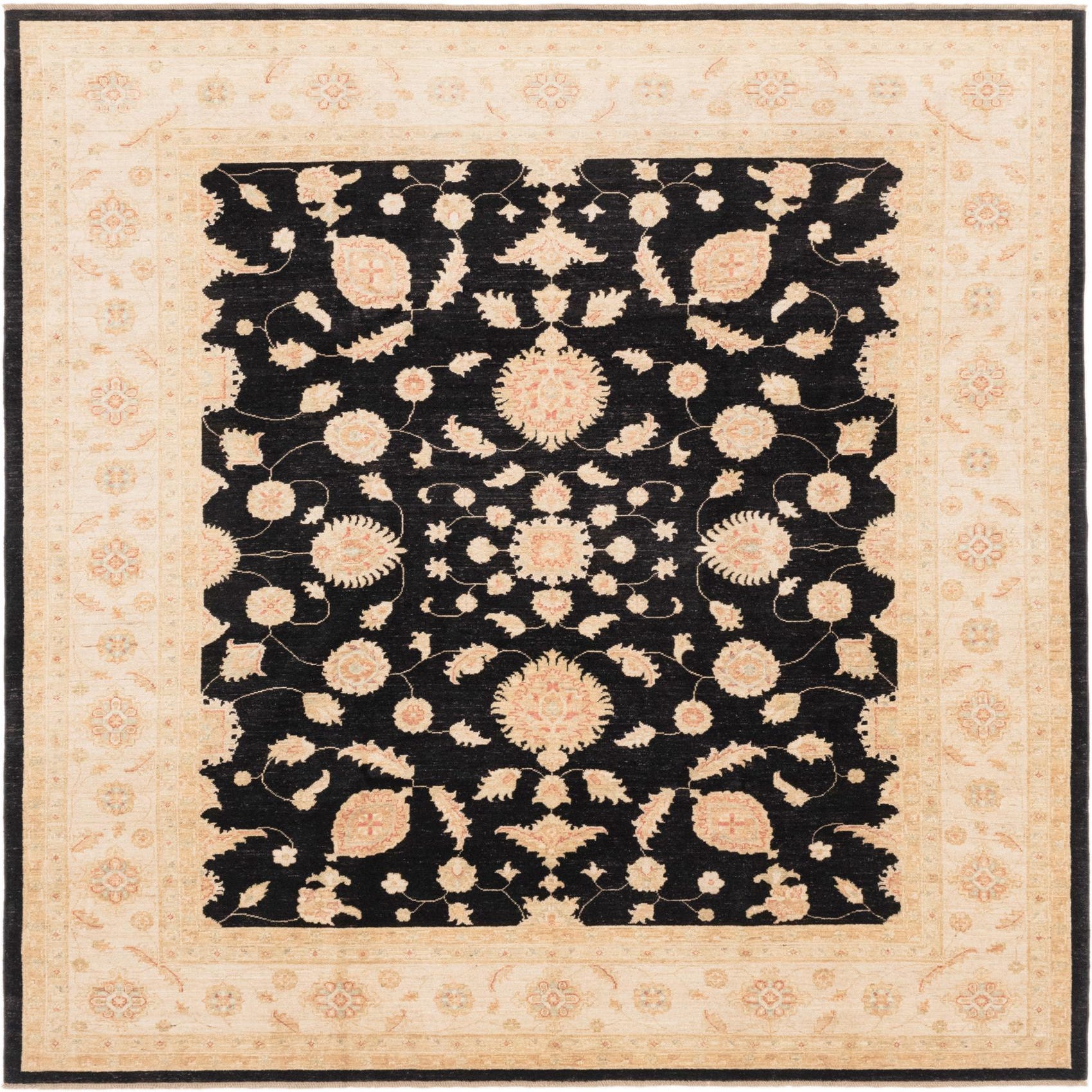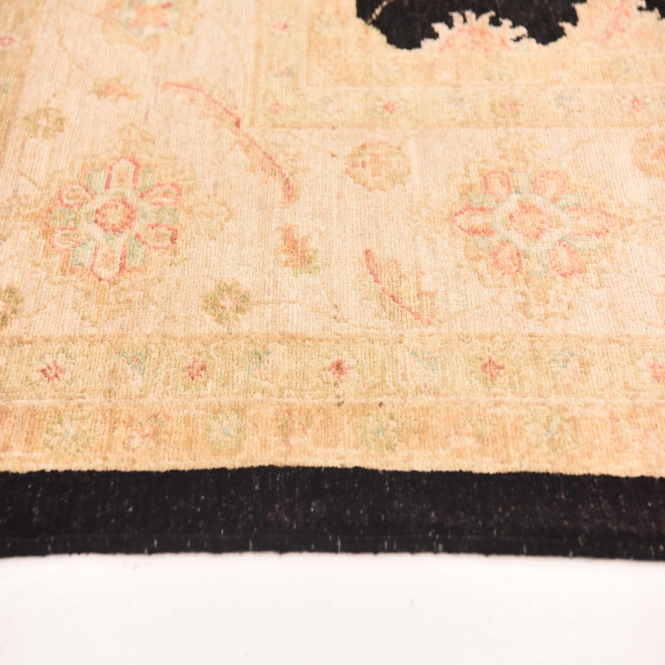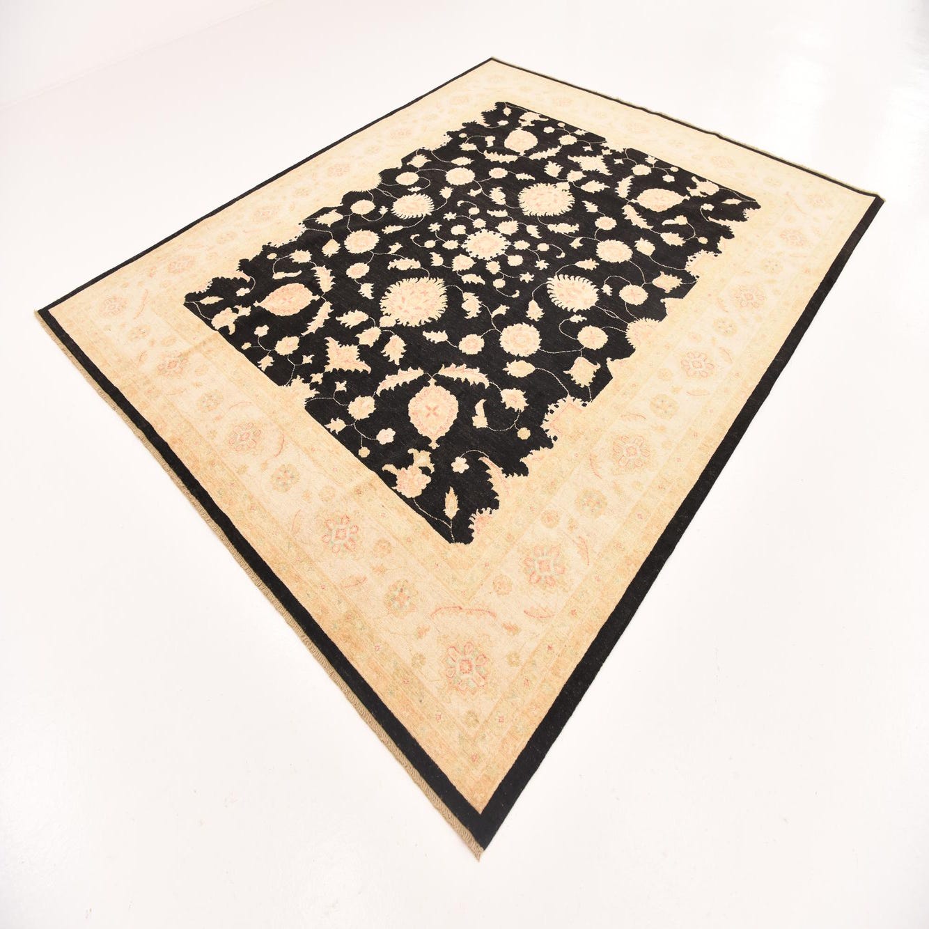 8x10 rectangular Peshawar Ziegler rug with a black field and cream traditional floral botanical pattern, featuring a cream border.