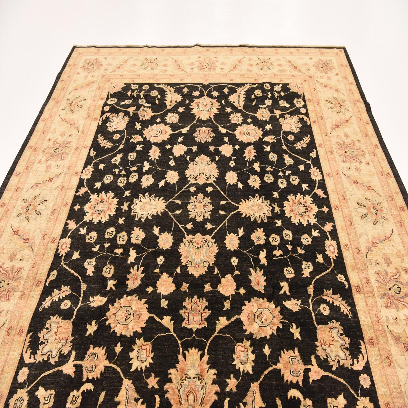 An 8x10 rectangular Peshawar Ziegler rug featuring a black field with intricate botanical and floral patterns in light beige and peach, framed by a wide traditional border.