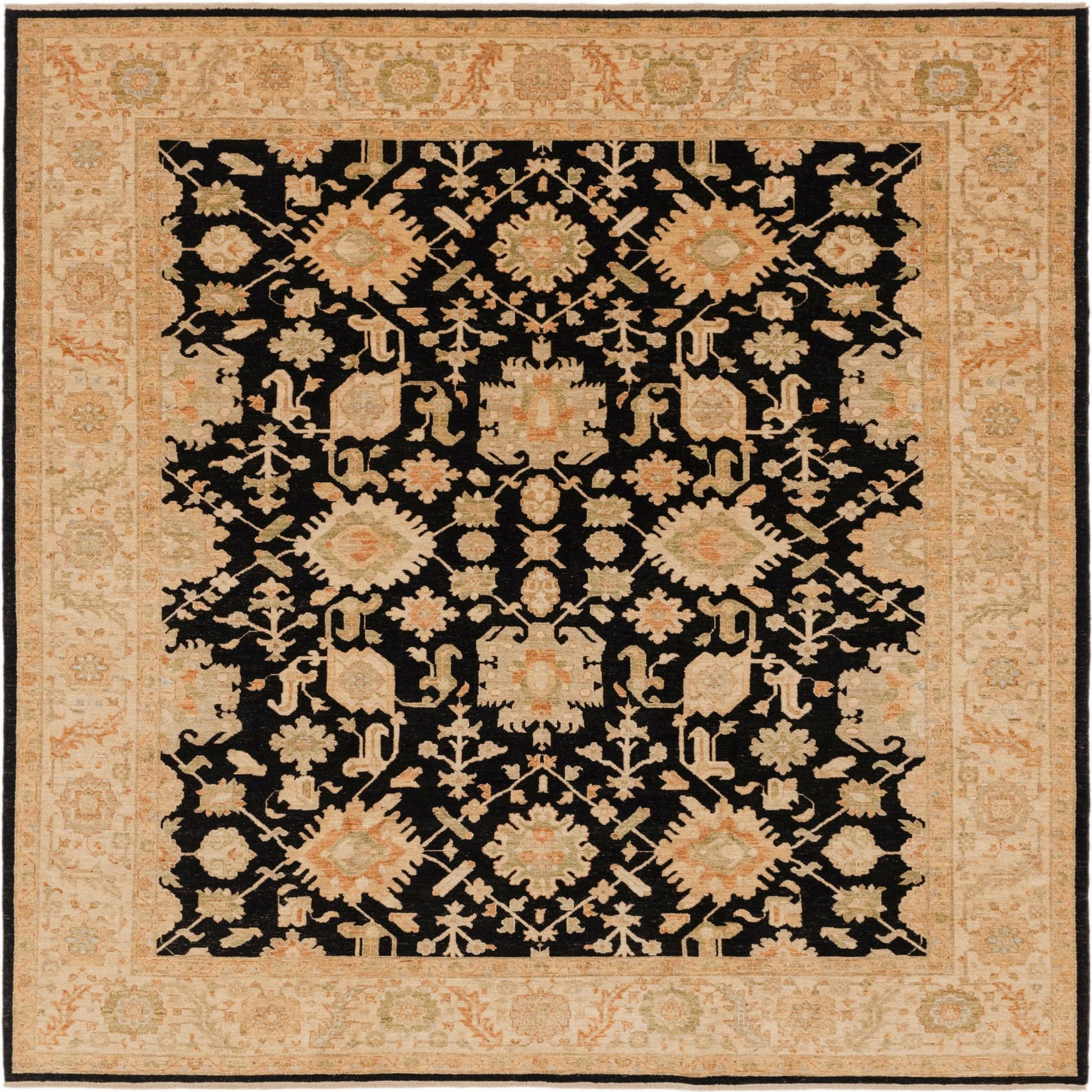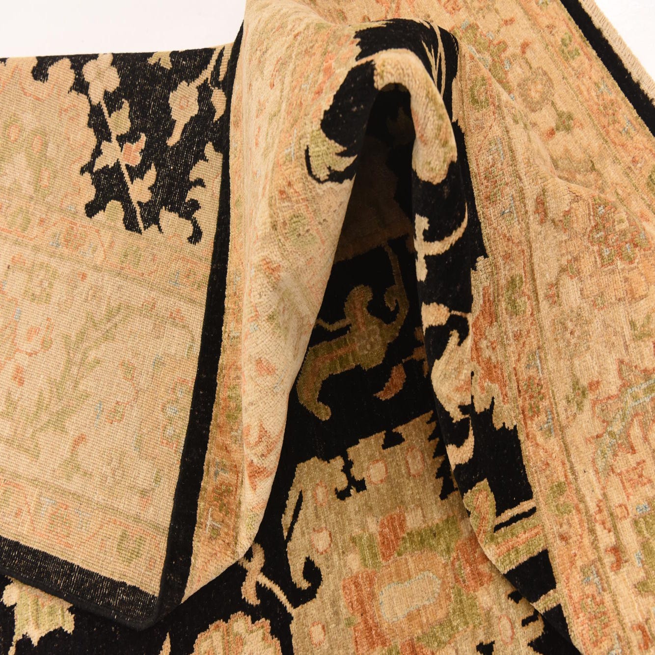 Primary color is Black. Colors in this rug include: Black, Beige, Cream, Green, Salmon, Peach, Gold.