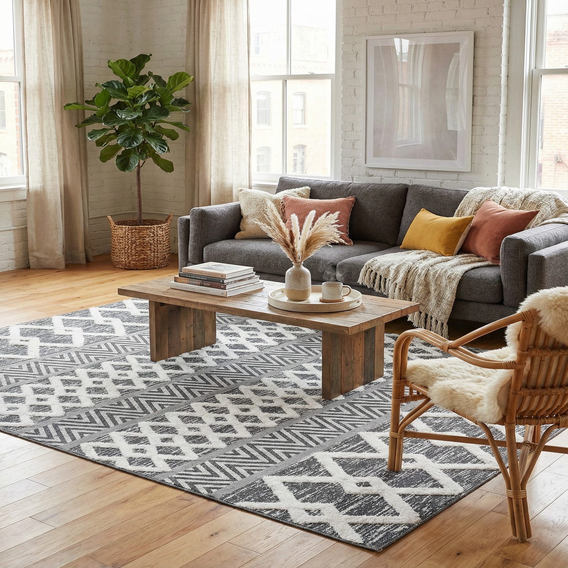 This rug fits naturally into modern and transitional interiors—pair it with light oak furnishings and matte black metal accents for a contemporary living room, or use it to anchor a neutral bedroom where monochrome layering keeps the look calm and refined. It also works well in an entryway or beneath a coffee table, adding pattern and warmth to spaces that benefit from graphic contrast without overwhelming the overall palette.