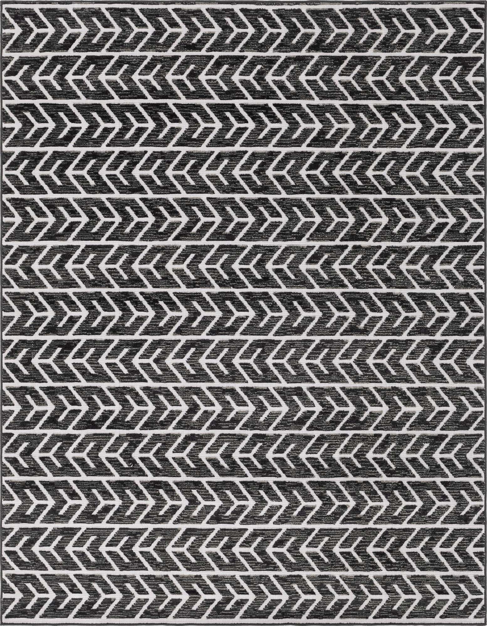 The Sabrina Soto Outdoor 8x10 area rug is a modern, machine-woven piece crafted from 100% polypropylene. This rug features a dynamic geometric pattern that creates a sense of movement and interest on the floor space. The sharp contrast of black and ivory lends itself to a bold statement within an array of design schemes.