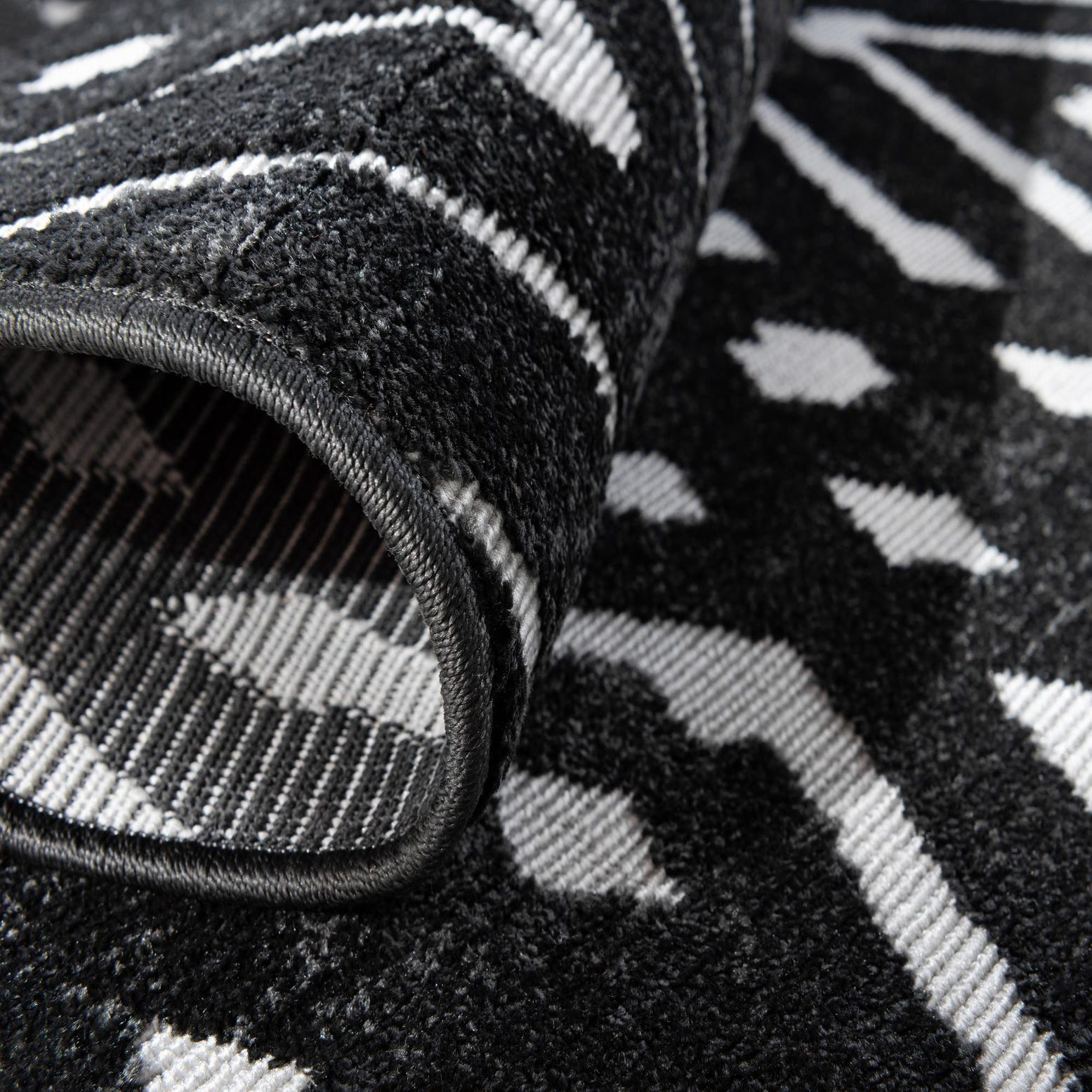 Machine-made from 100% polypropylene, the rug has a low-profile, tightly constructed surface that feels firm yet slightly cushioned underfoot. The fibers hold the pattern cleanly, so the ivory motif provides sharp contrast against the black background. Well-suited for covered patios, screened porches, or high-traffic interior spaces, it can anchor an outdoor seating group, sit beneath a bistro or dining set, or add graphic definition to a modern living room. Pairs nicely with warm wood tones, matte black metal, rattan accents and neutral linens in minimalist, modern-tribal, or transitional coastal schemes.