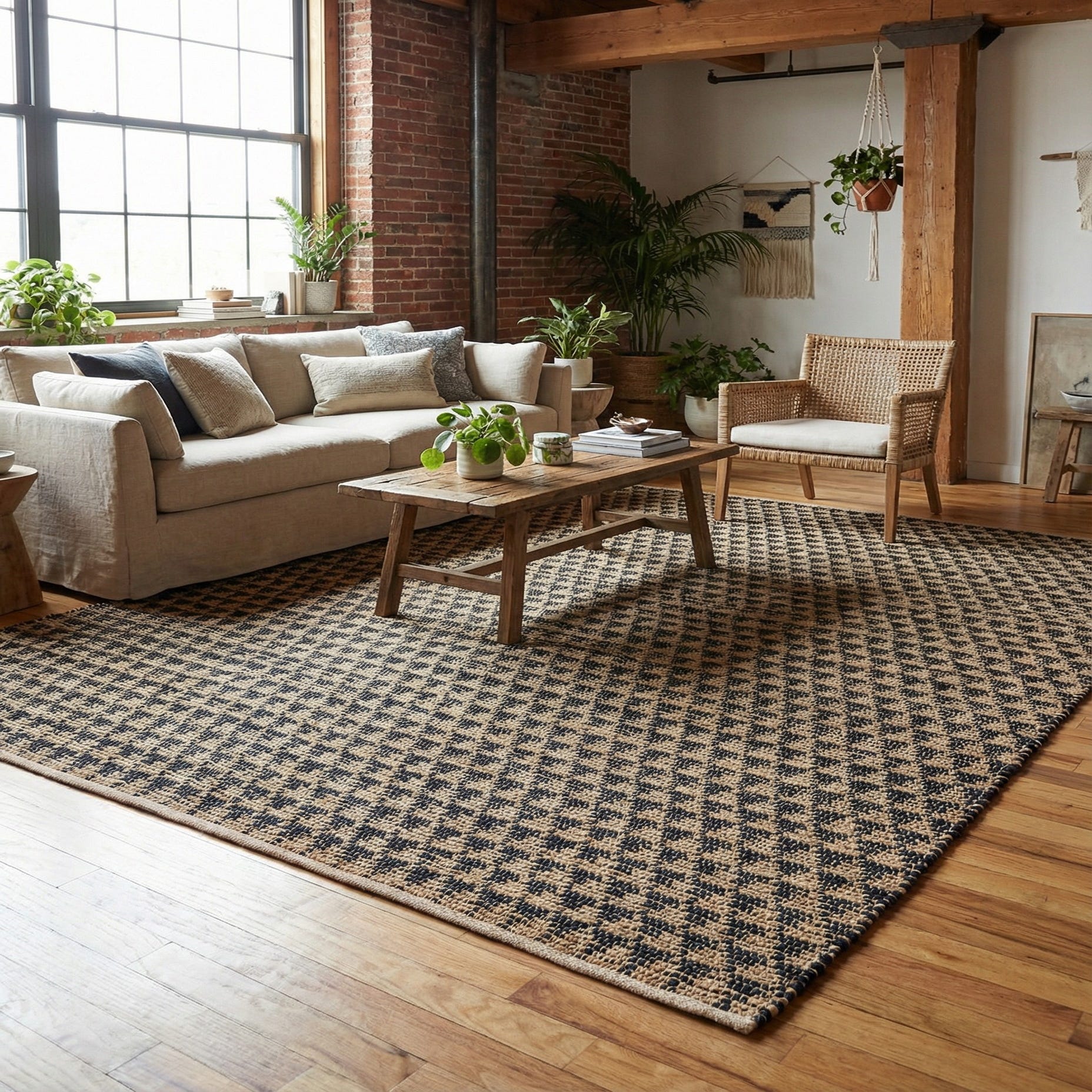 This rug works well in modern farmhouse, Scandinavian, or contemporary settings where natural texture and clean lines are desired. Place it under a dining table to anchor a wood set, layer it beneath a sofa grouping to add subtle contrast to leather or linen seating, or use it in an entry or hallway where a low-profile rug is needed. Pair with matte black accents, woven baskets and light woods to highlight the natural tones and woven character.