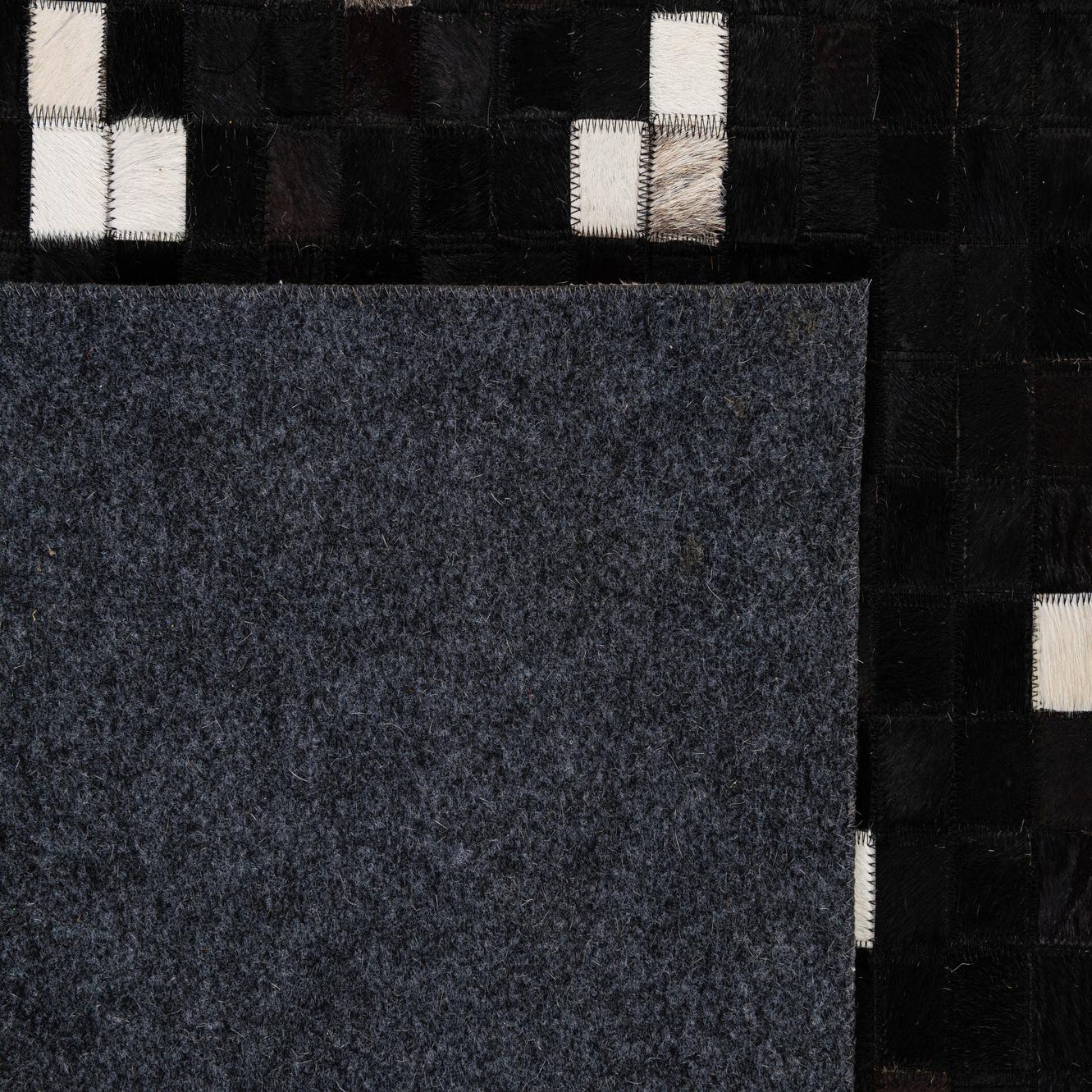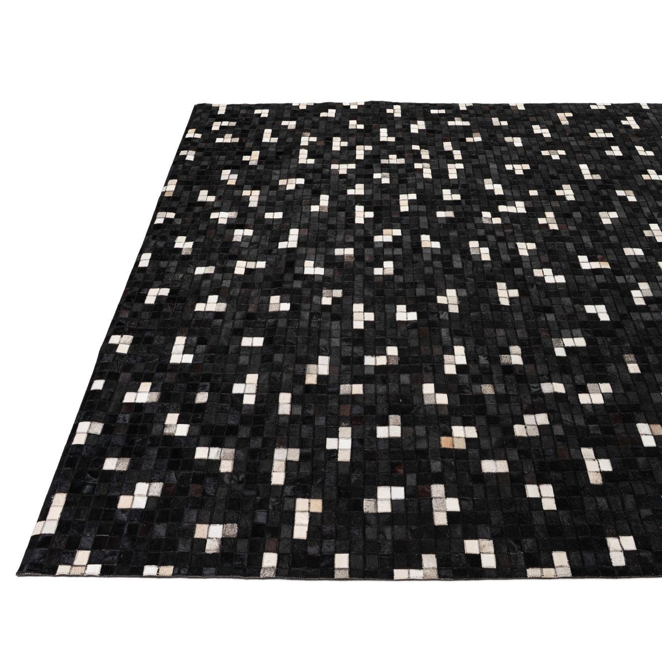 A rectangular 8x11 black cowhide rug with a modern patchwork pattern of scattered white and gray geometric shapes.