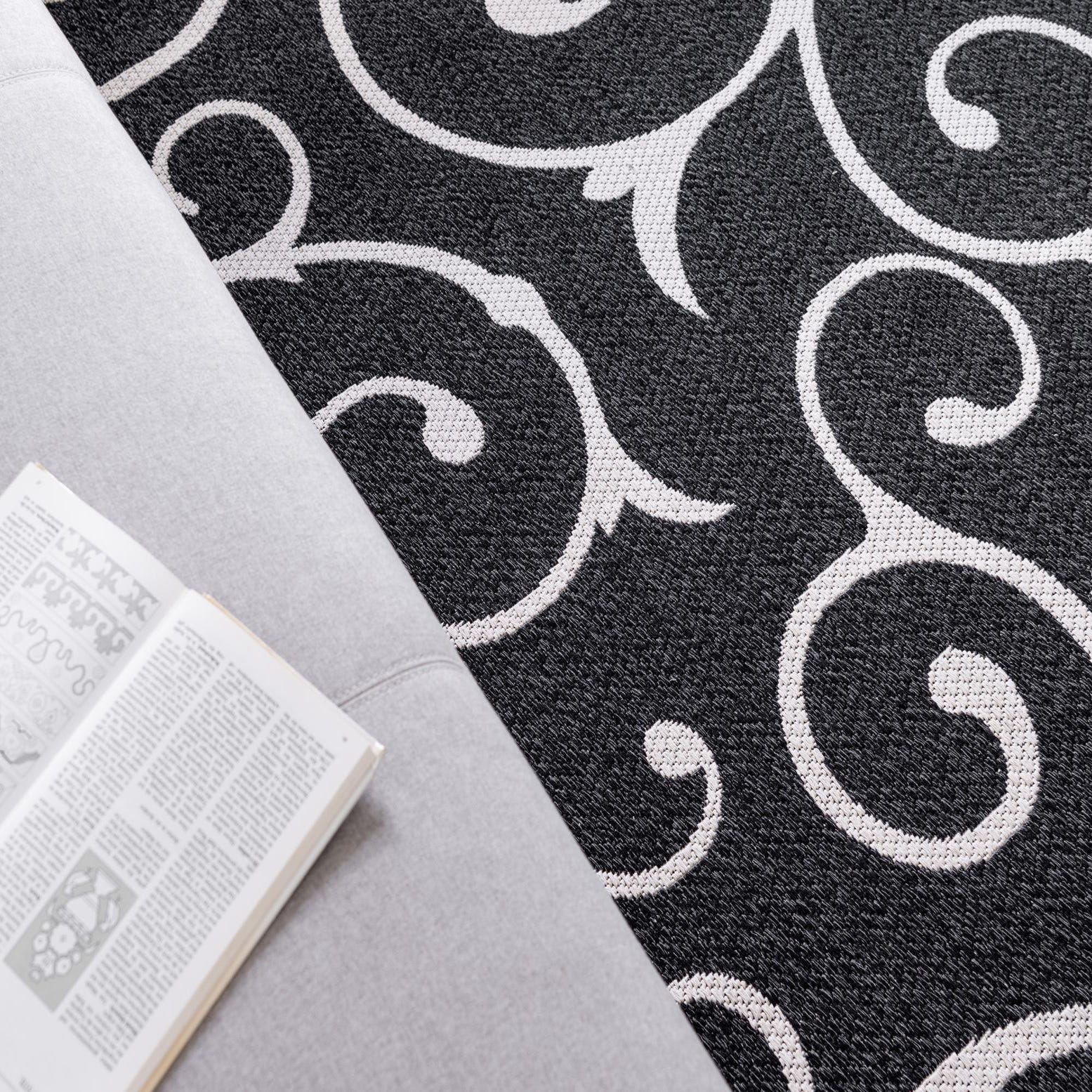 A close-up of an 8x11 black rectangular rug with an elegant white floral scroll pattern, showcasing its flatweave texture.