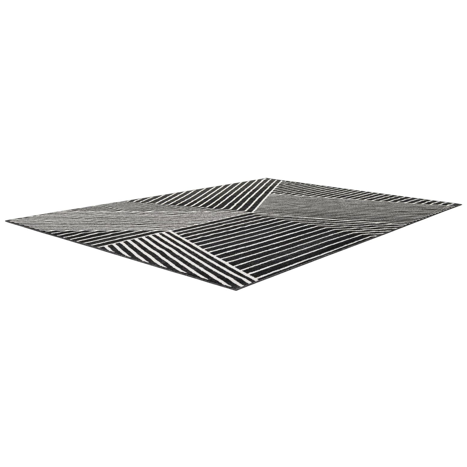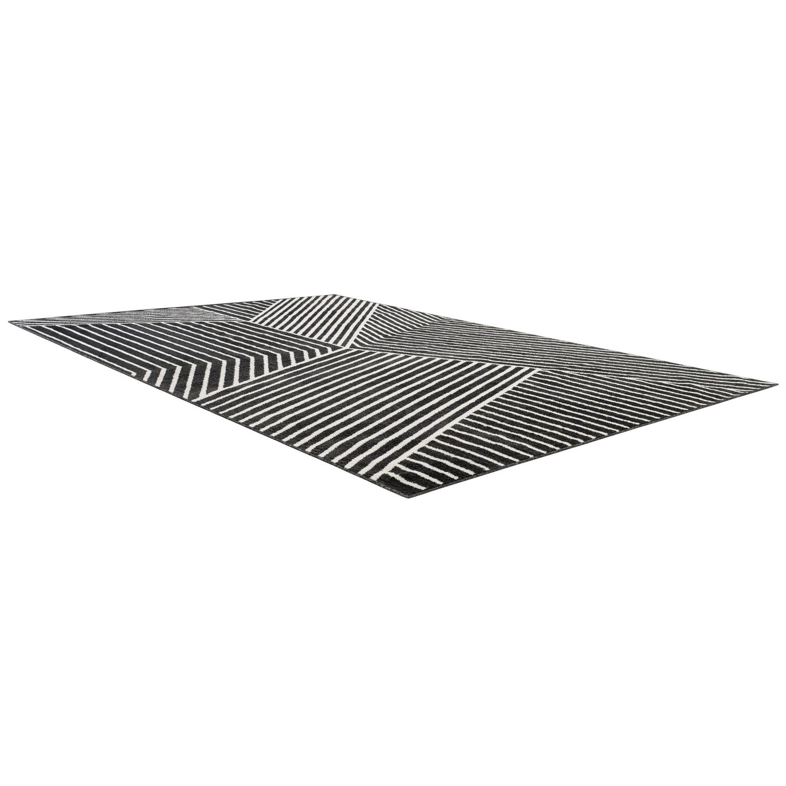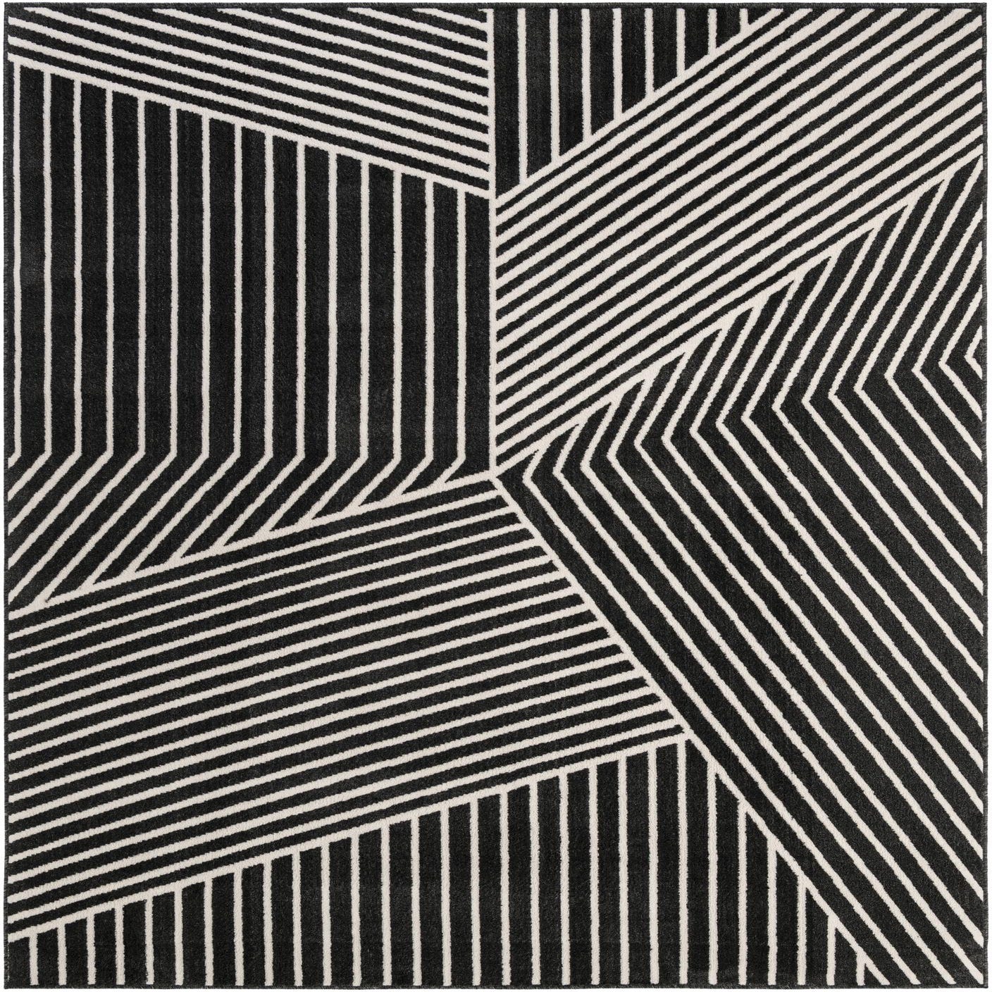 A rectangular 8x11 black and white modern area rug with a bold geometric stripe pattern, ideal for a living room.