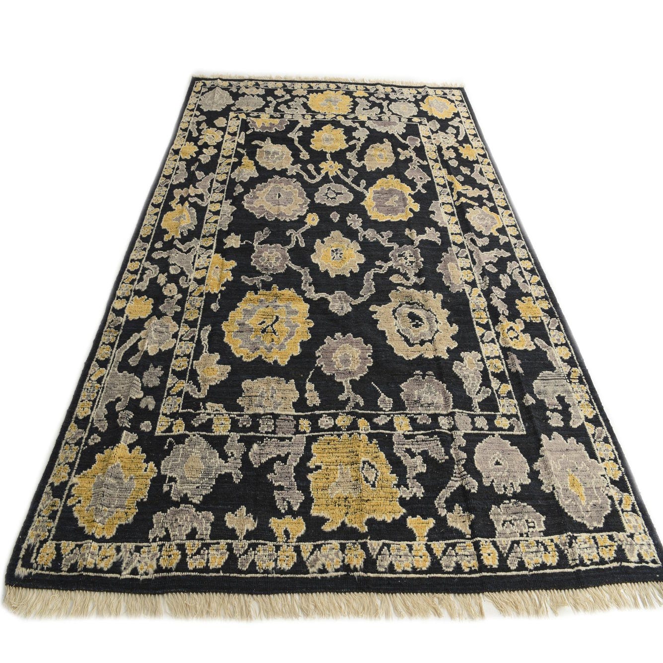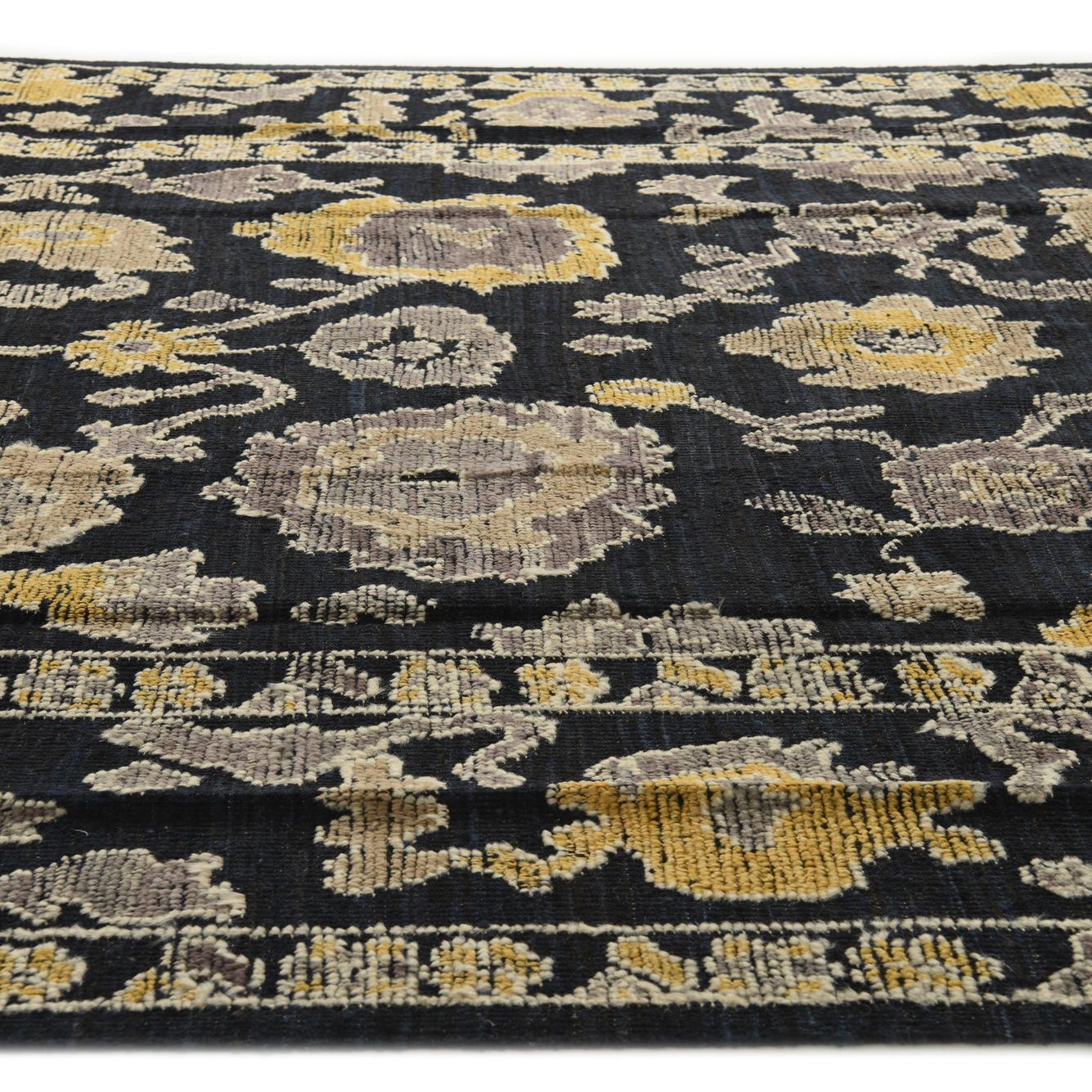 An 8x11 rectangular Oushak wool rug featuring a modern floral pattern in black, gold, and grey tones.
