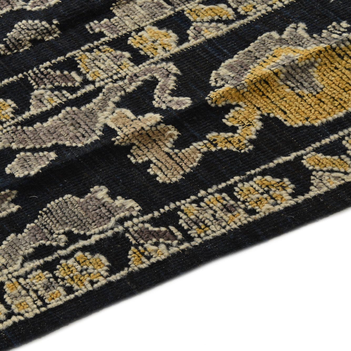 Primary color is Black. Colors in this rug include: Black, Ivory, Yellow, Gray.