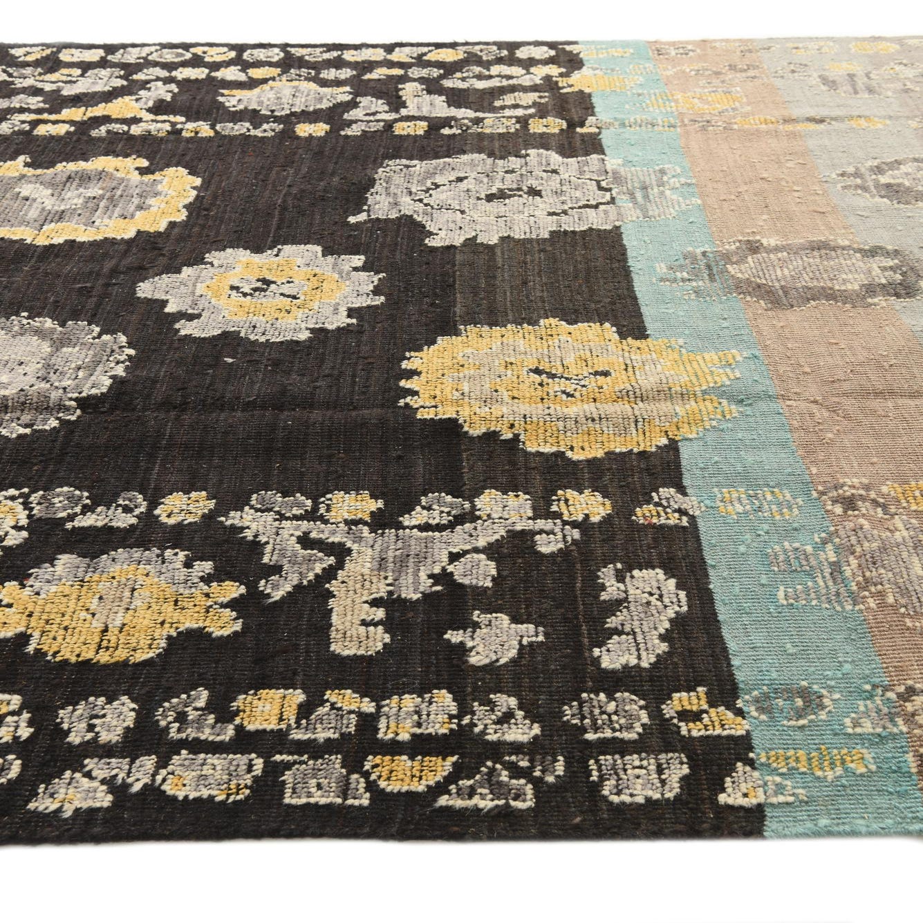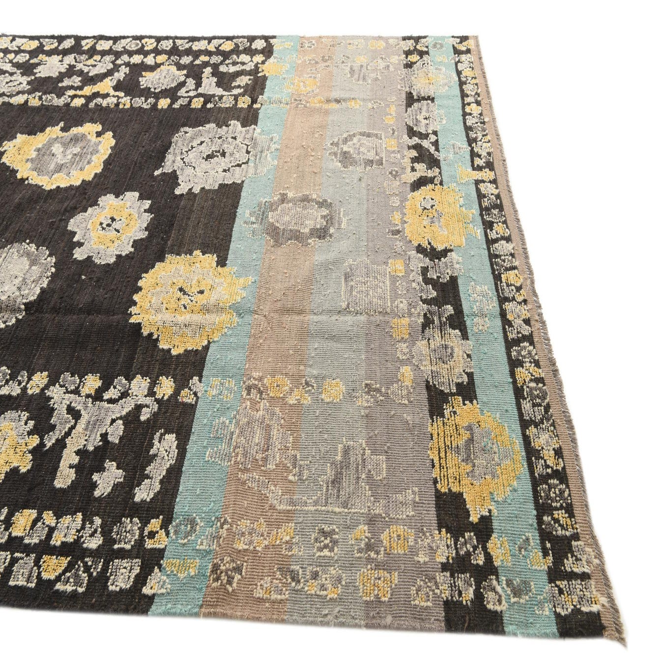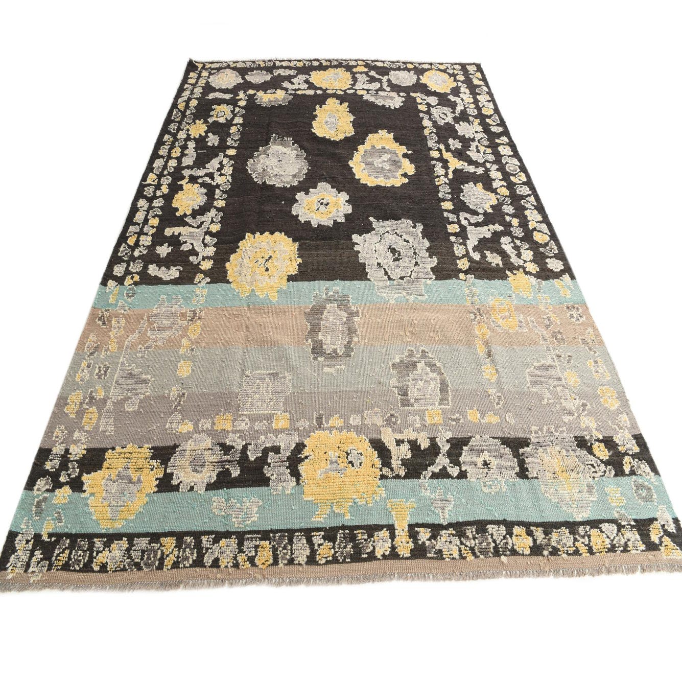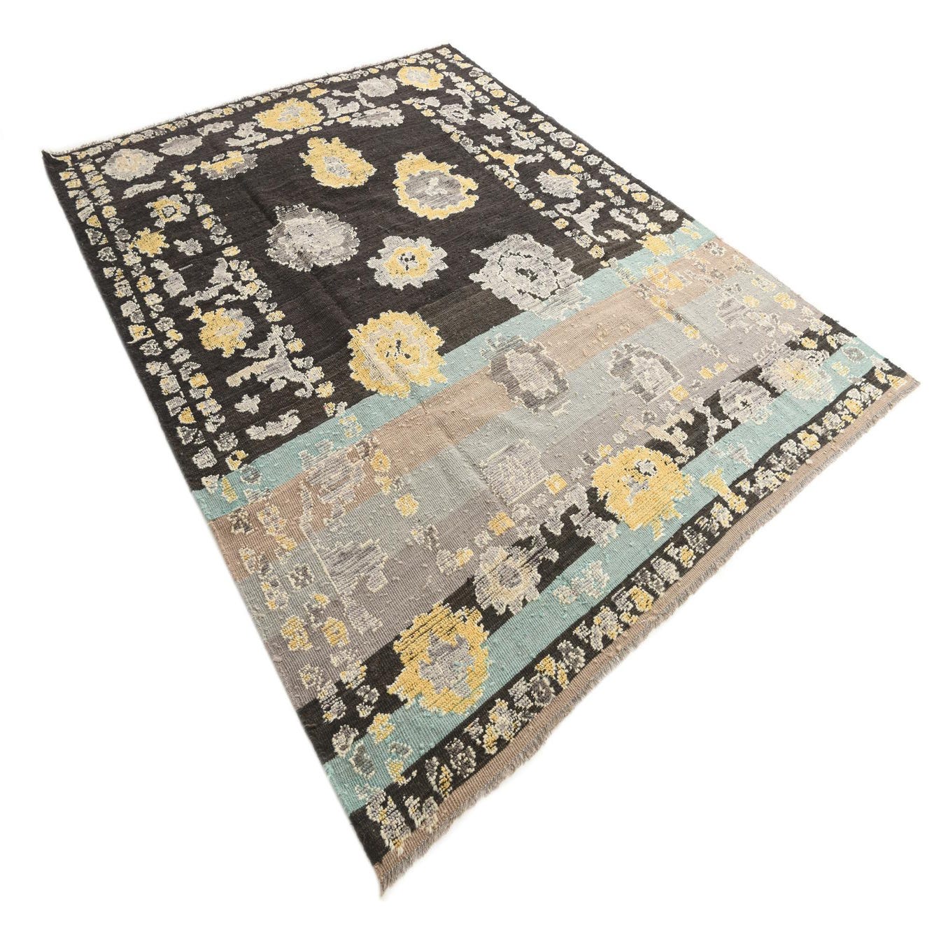 An 8x11 rectangular Oushak rug with a black base, featuring abstract floral patterns in yellow, gray, and teal stripes.