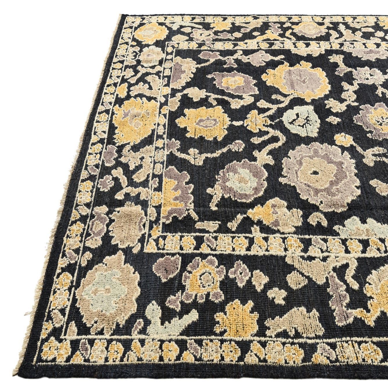 A rectangular 8x11 black Oushak rug with a modern floral pattern in gold, beige, and gray, perfect for a living room.