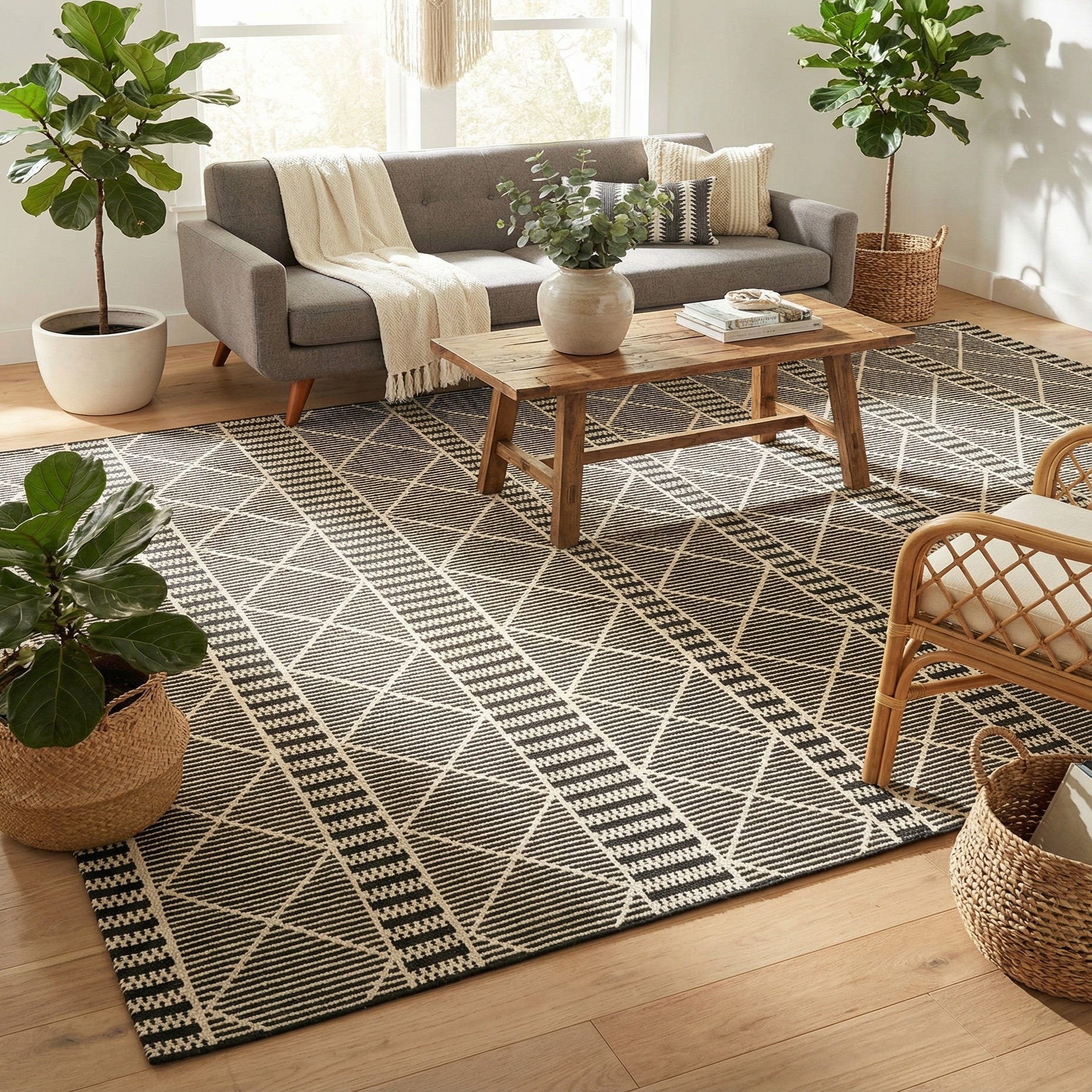 This versatile black-and-ivory piece is well suited to outdoor living areas such as covered patios, poolside lounges, or an alfresco dining spot, and it also works indoors in contemporary living rooms, minimalist dining areas, or a monochrome bedroom. Pair it with light wood furniture and woven accessories for a relaxed coastal look, or with metal and glass pieces for a sleek, modern setting that benefits from strong graphic contrast.