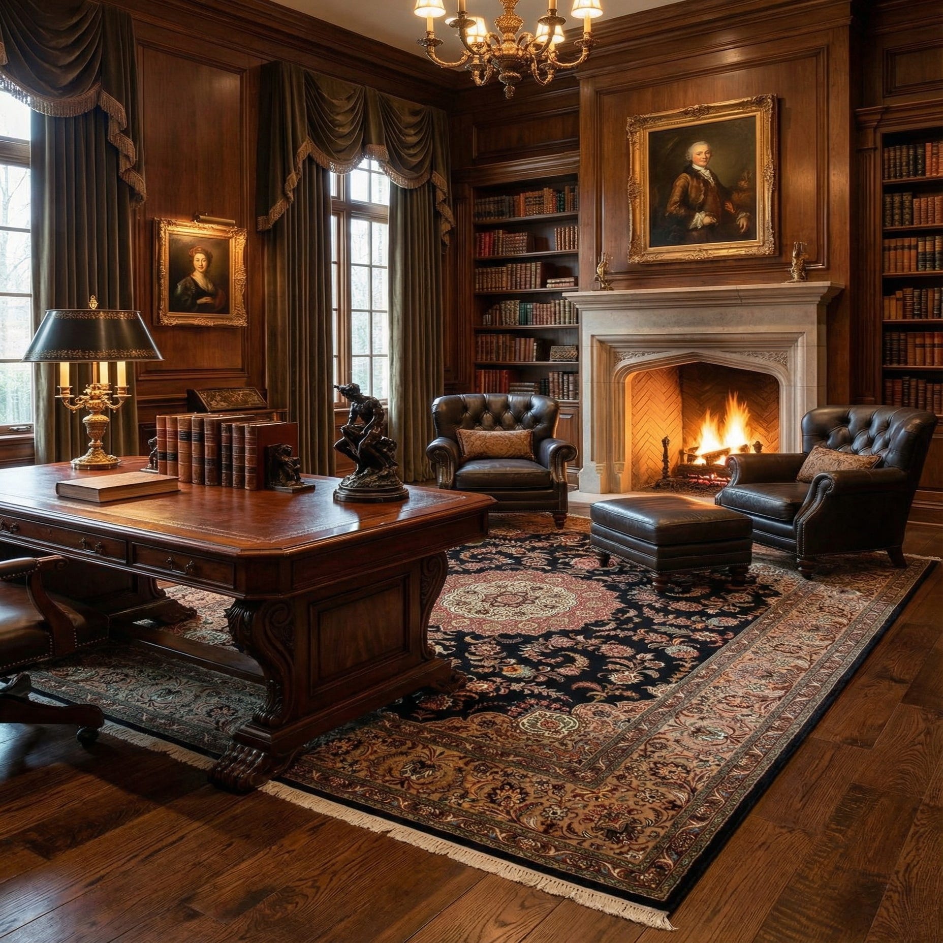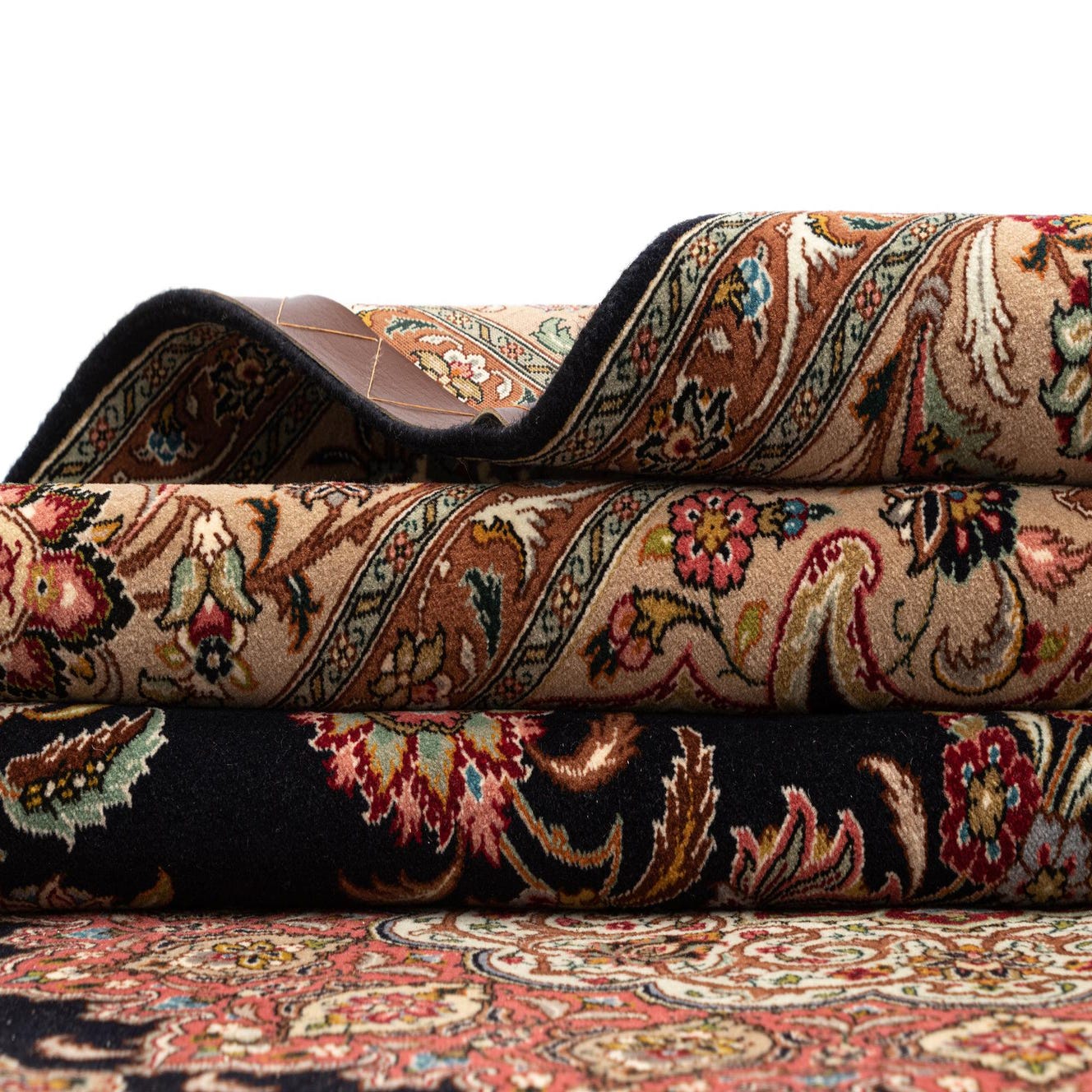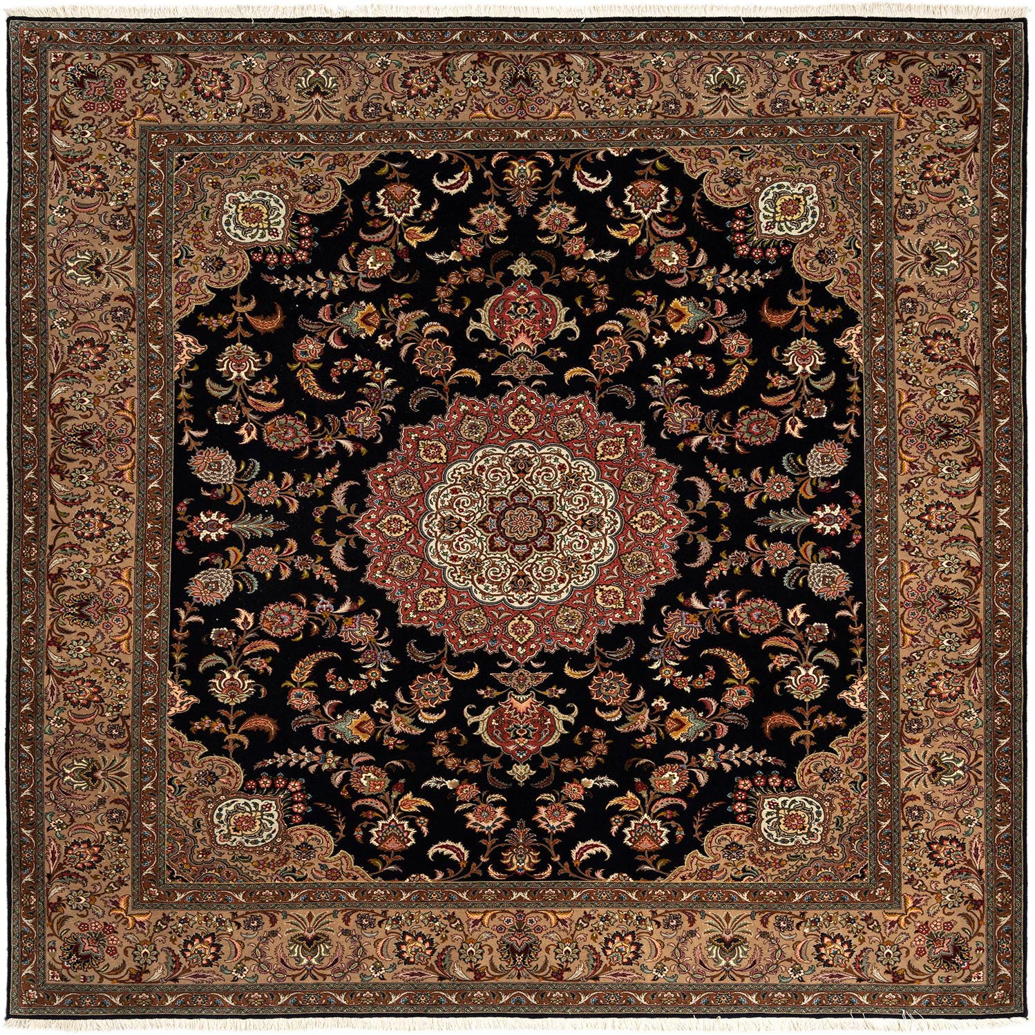 An 8x11 rectangular black Persian rug with an intricate floral medallion design and a detailed tan border.