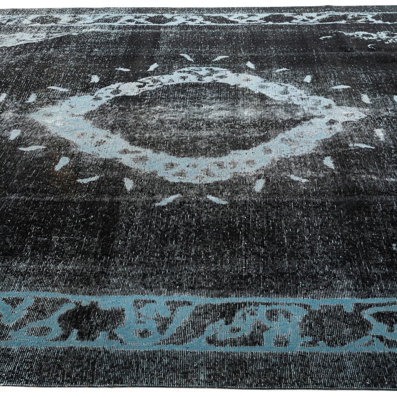 An 8x11 rectangular black area rug with a faded light blue Persian medallion and border pattern, suitable for a living room.