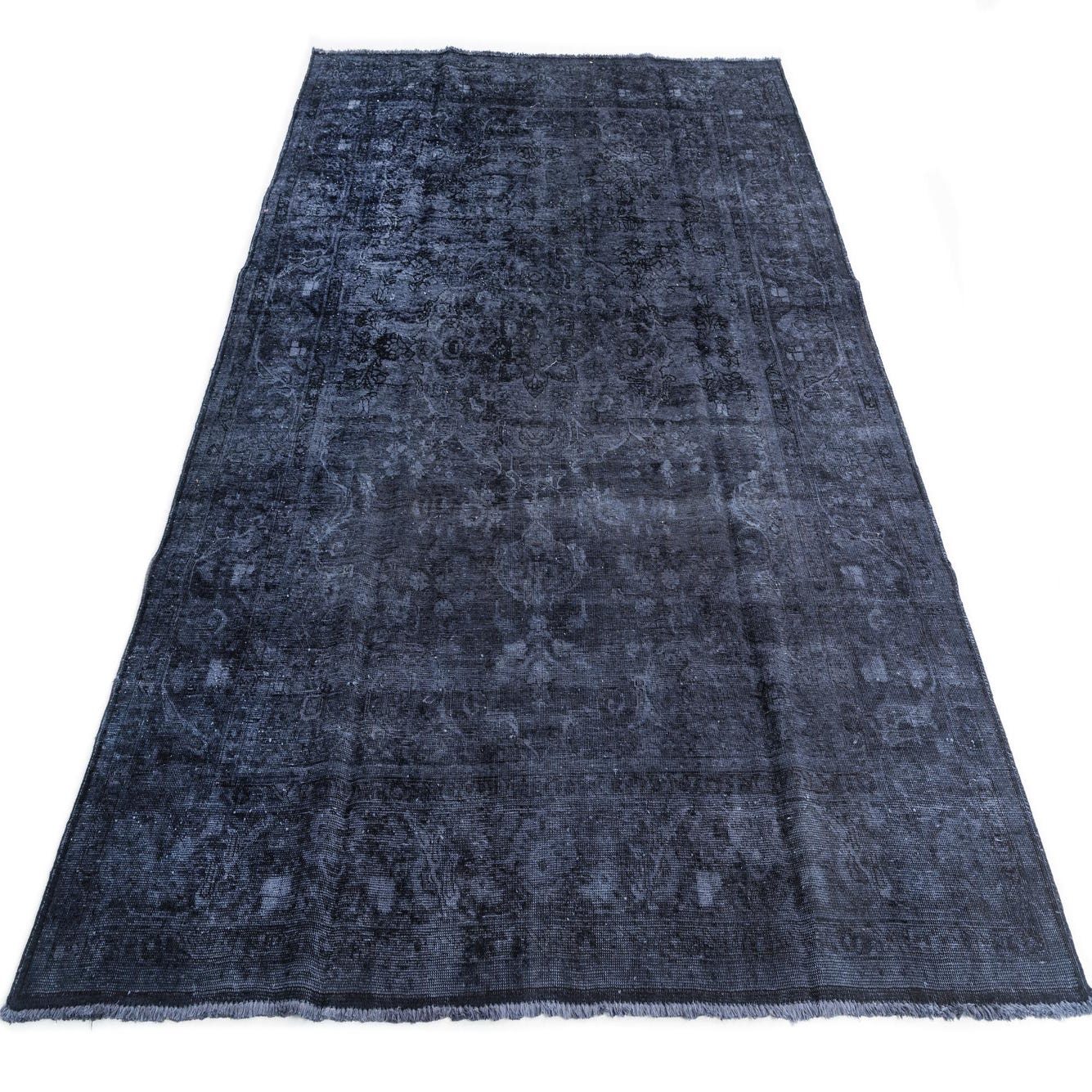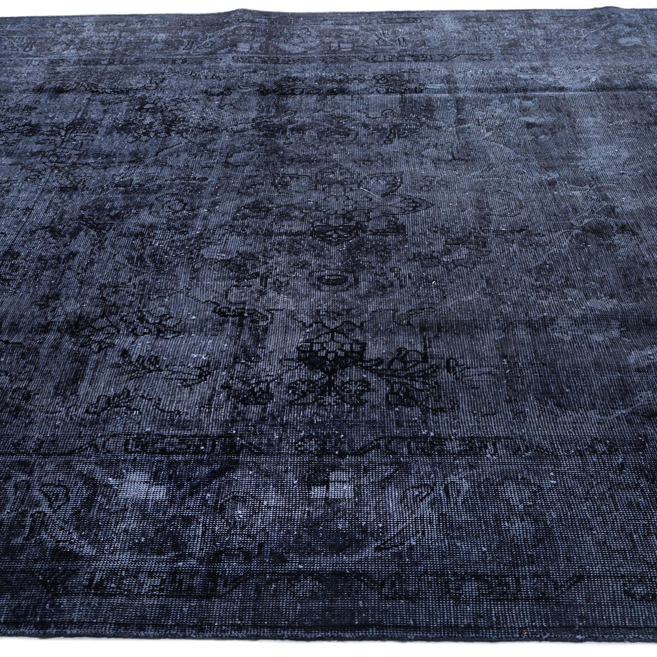 Hand-knotted from 100% wool, this rug features a low, dense pile that feels soft and substantial underfoot. A deep black ground provides the foundation for a muted gray vintage medallion and scrolling floral pattern that has been subtly distressed for a well-worn, layered look. The overdyed effect tones down high contrast and gives the surface a rich, tactile depth you can both see and feel.