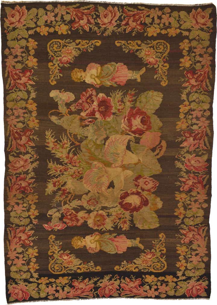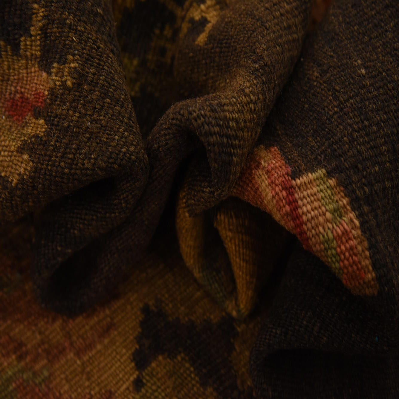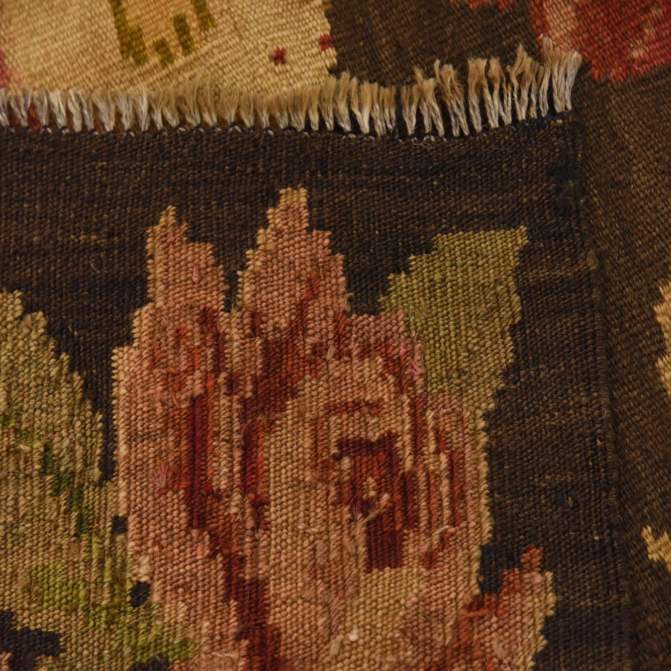 Primary color is Black. Colors in this rug include: Black, Burgundy, Green, Light Green, Puce, Gold, Beige.