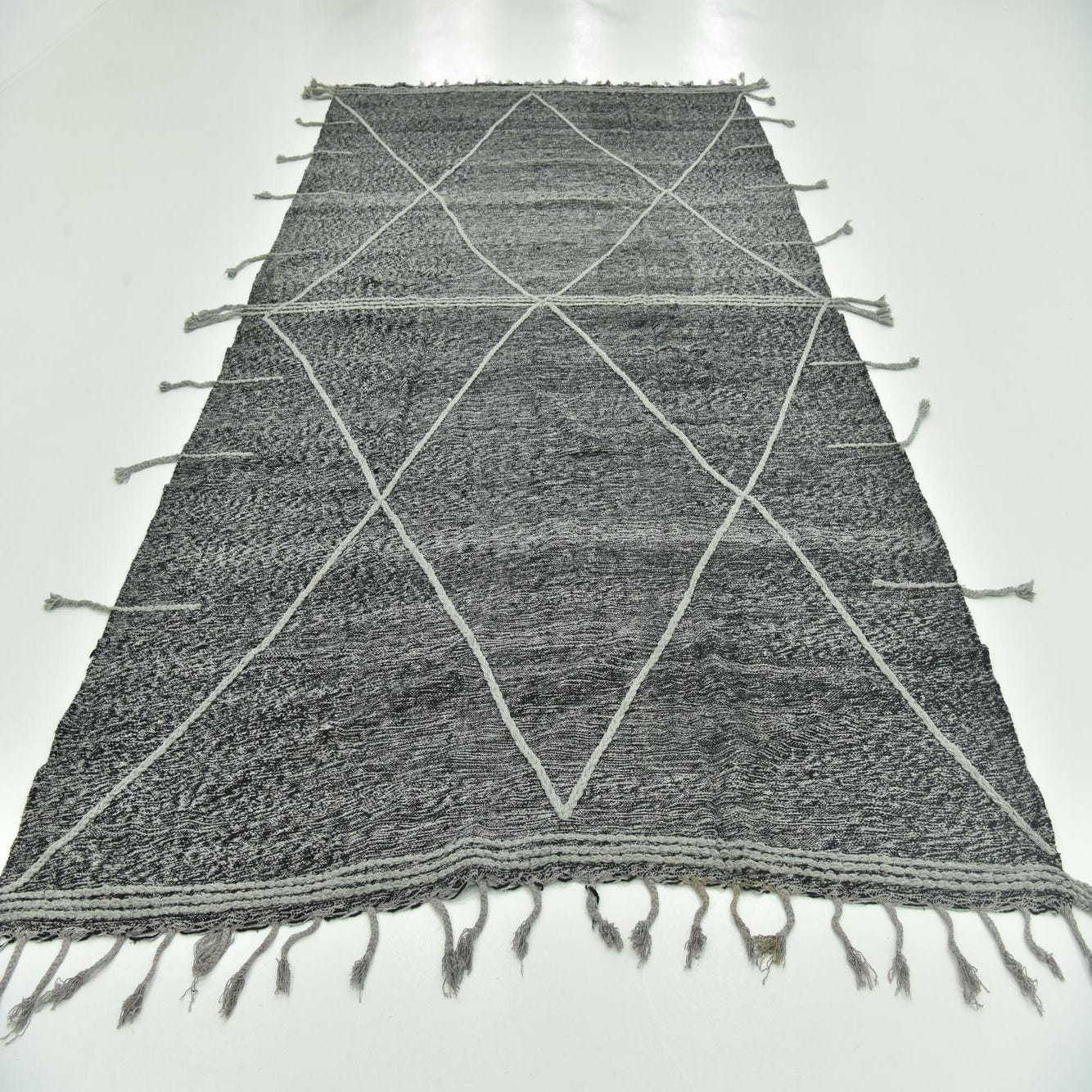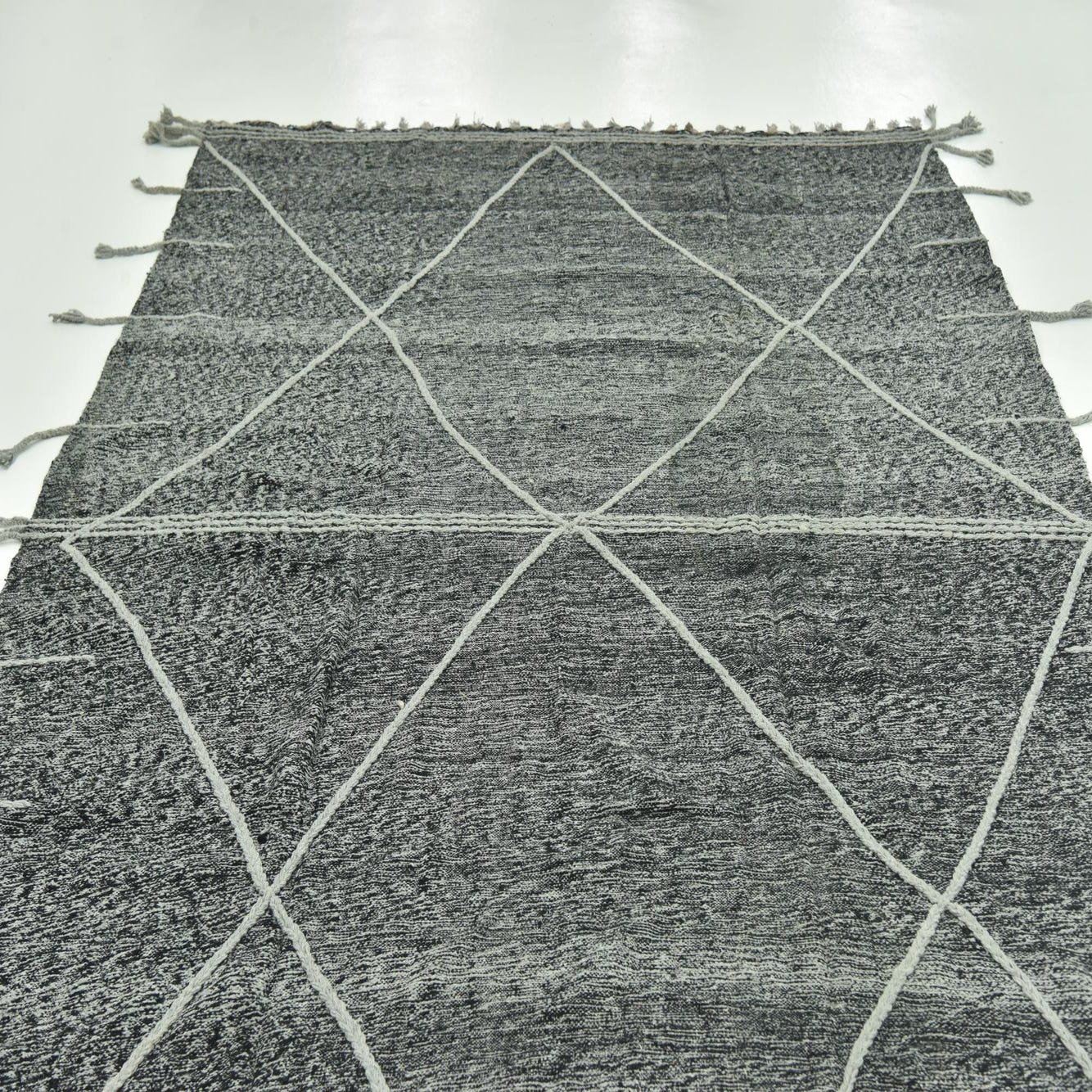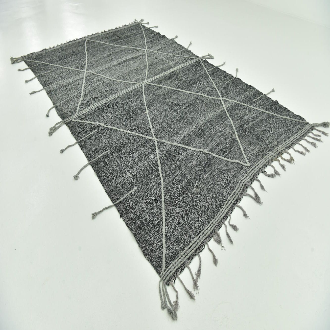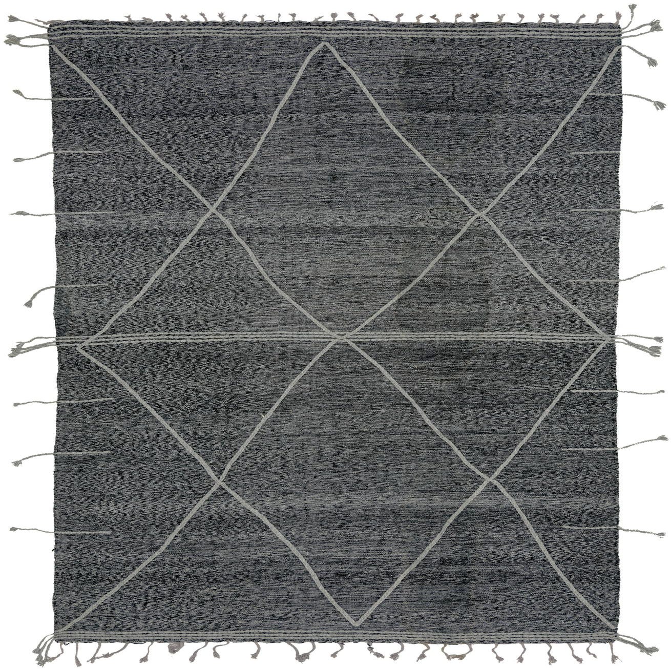 A rectangular 8x12 black wool shag rug with a light gray tribal diamond pattern and fringed edges.