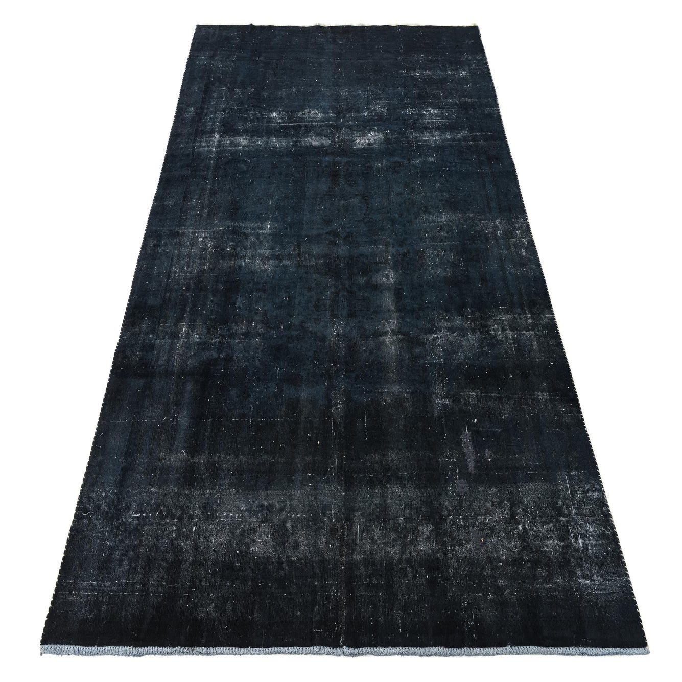 A large 8x12 rectangular black wool area rug with a distressed vintage Persian pattern, suitable for a living room.