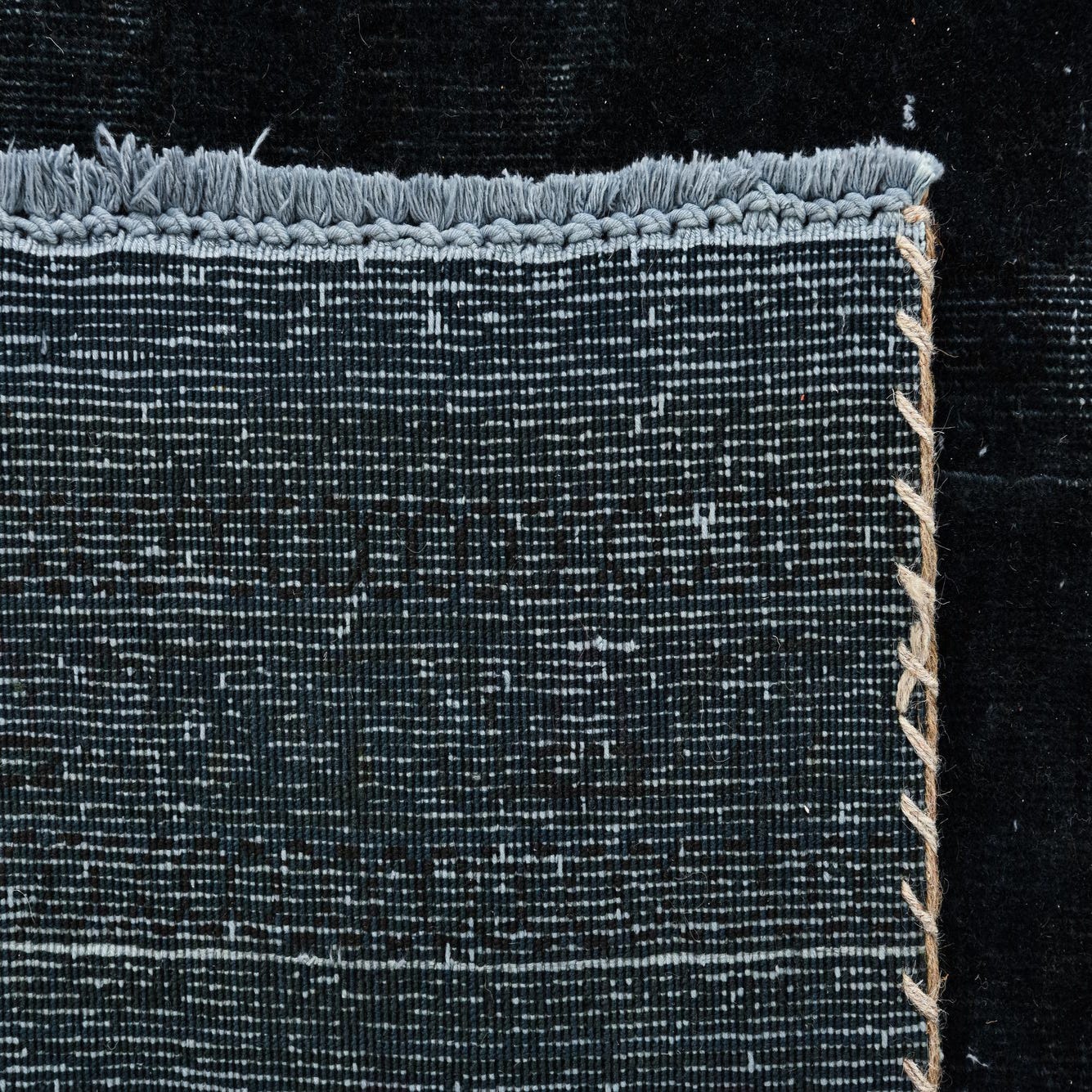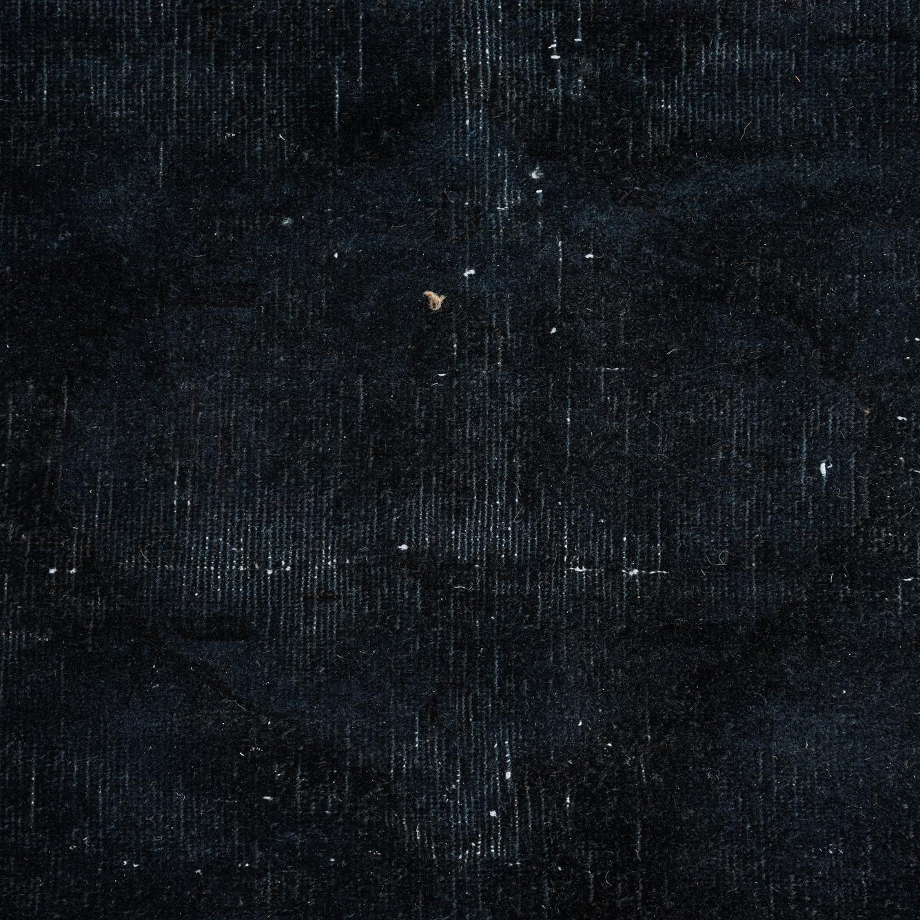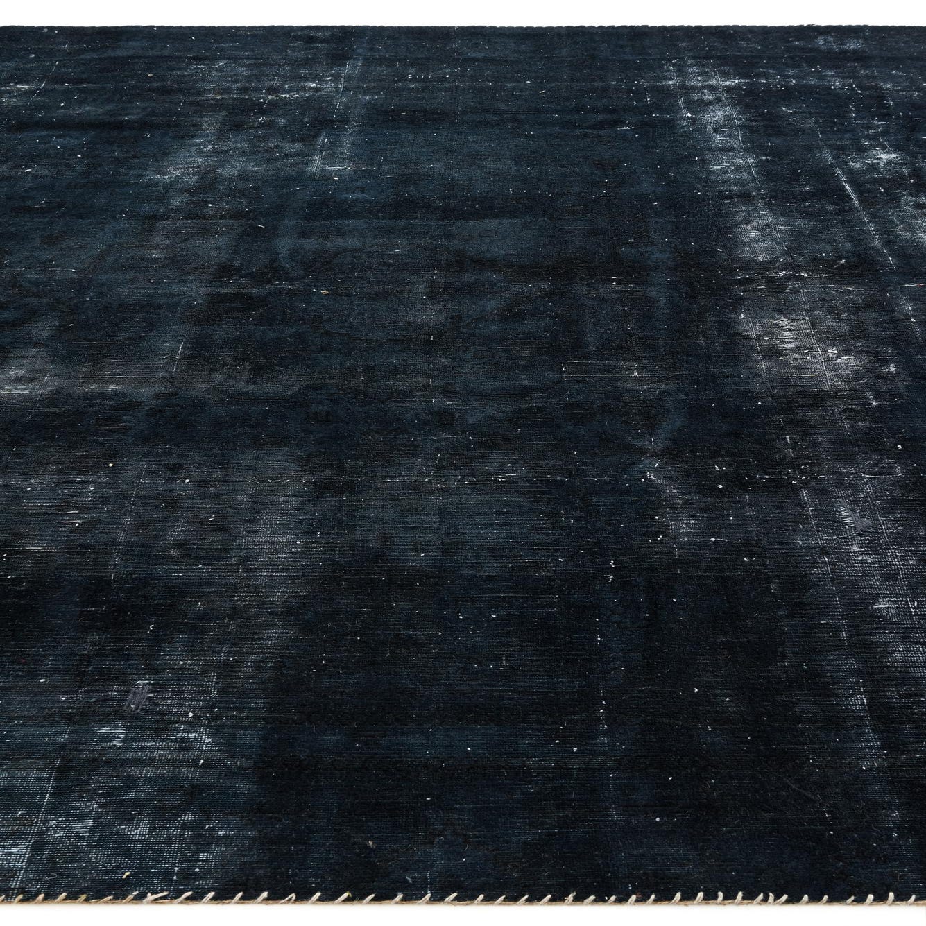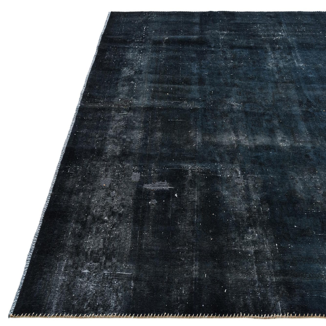 The rug's pattern is understated, with faded and distressed elements that emulate the authentic character of a well-loved antique. Finished with fringe detailing, it contributes an additional element of texture and visual interest. This versatile rug harmonizes effortlessly with a range of interior styles, from industrial lofts to more traditional living spaces. It anchors furniture in open floor plans, defines areas in large rooms, and would make a particularly striking contrast against light hardwood or polished concrete floors. Its dark palette and resilient wool construction also make it a practical choice for high-traffic areas such as living rooms, dining areas, or studies.