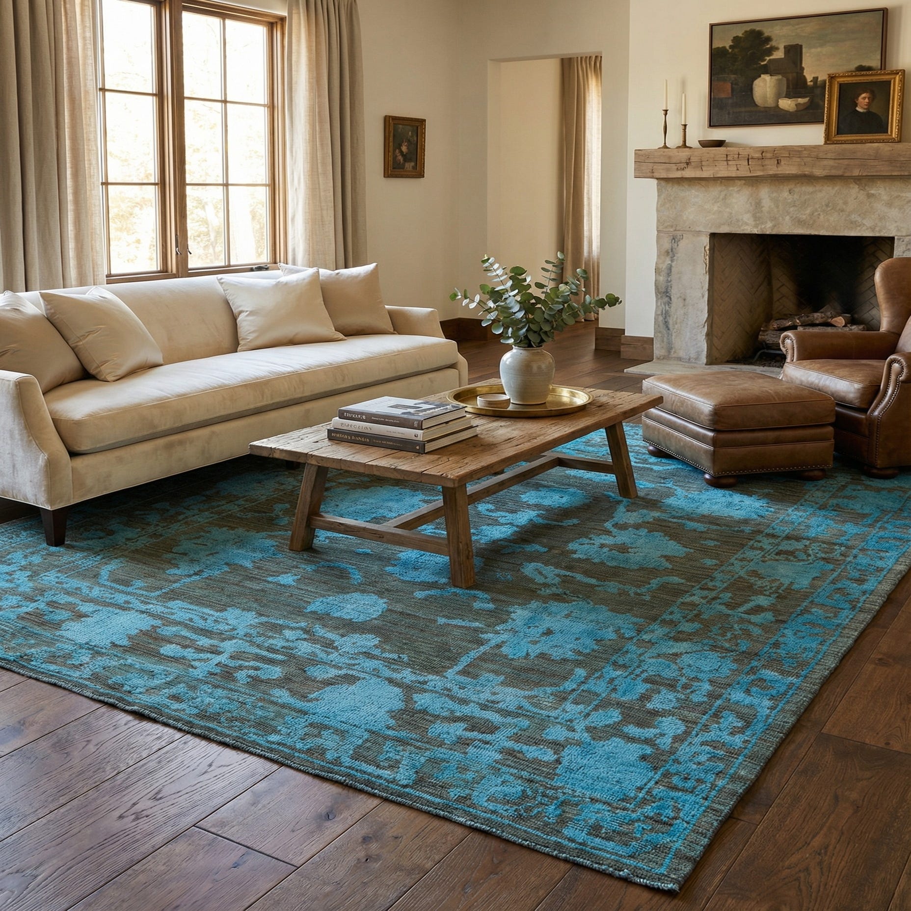 This piece works well as an anchor in contemporary or transitional interiors—place it under a seating group to define a living area, beneath a square dining table to add visual weight, or layer it in a bedroom seating nook for added color and texture. It pairs cleanly with neutral upholstery, natural wood tones, and matte metal accents, and also complements rooms that use blue as an accent color for a cohesive, thoughtfully layered look.