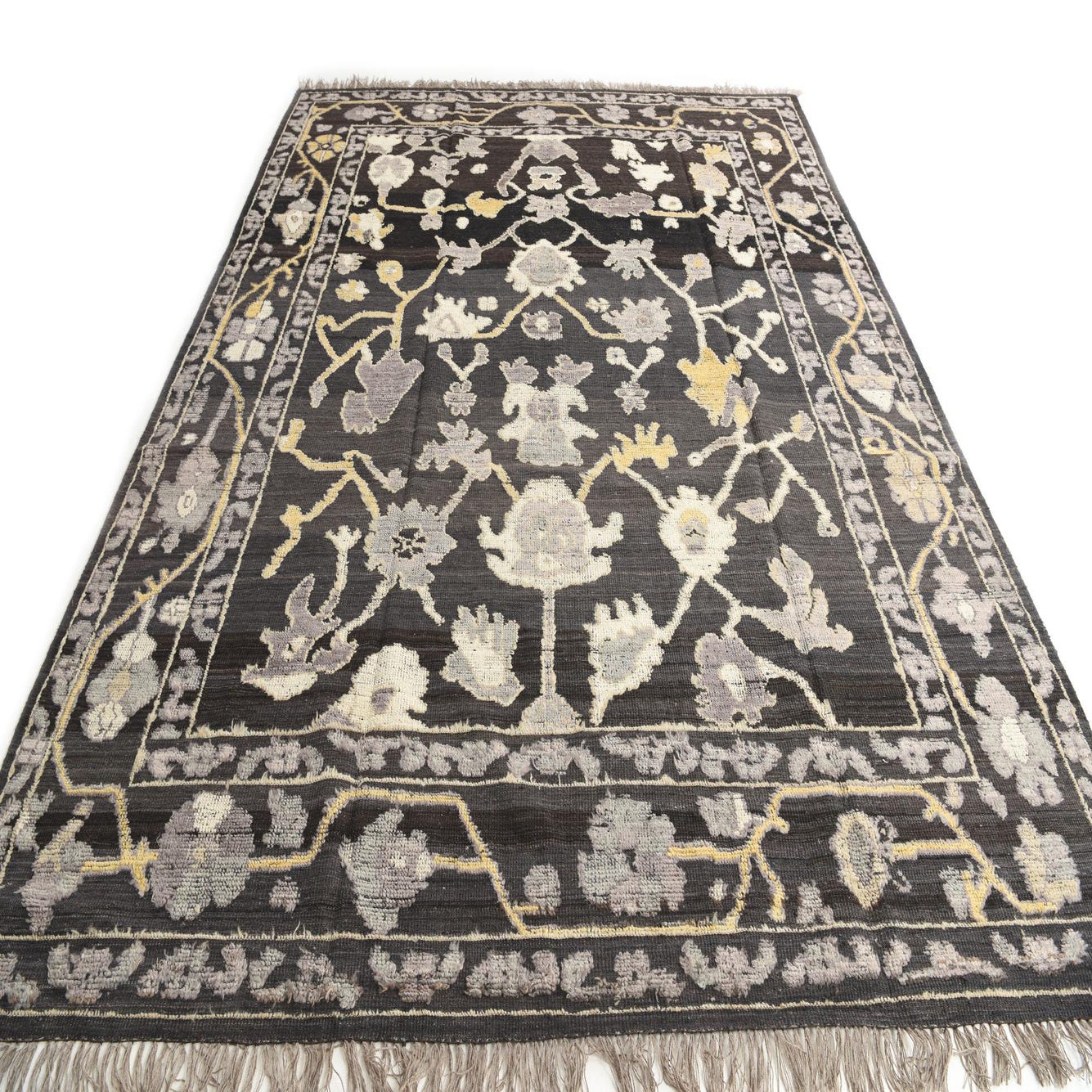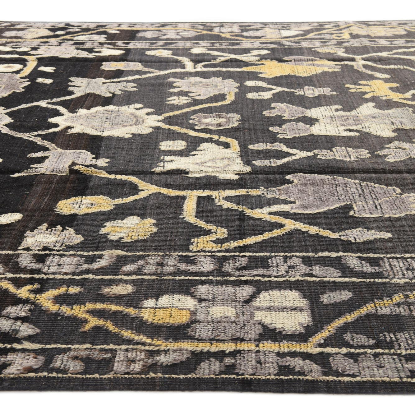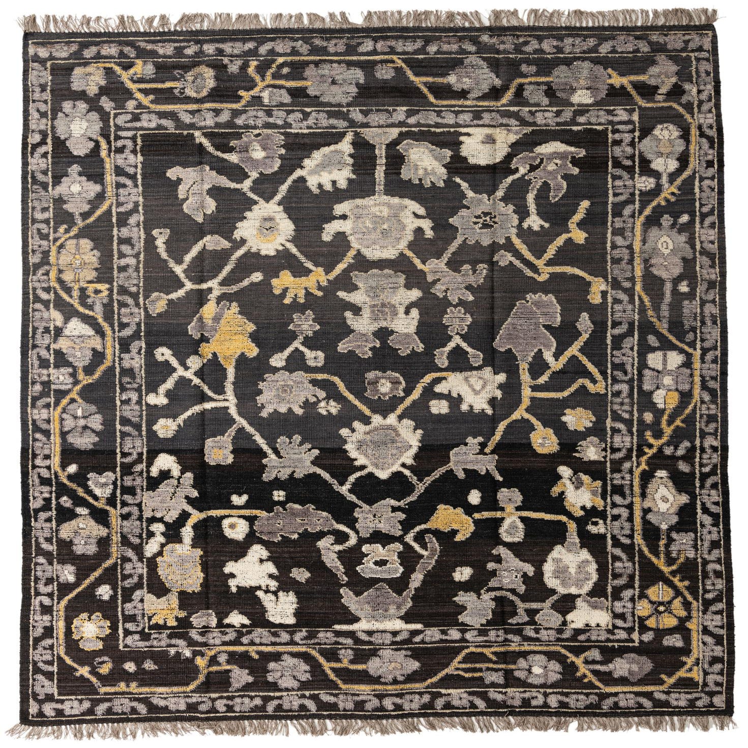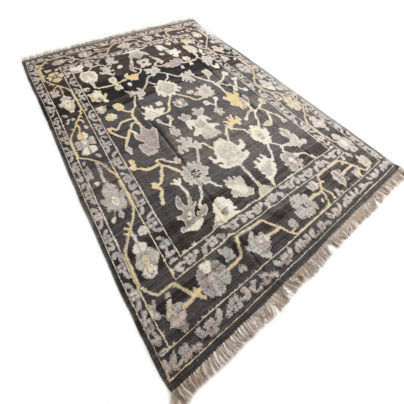 A 9x12 rectangular Darya Collection wool rug featuring an abstract floral pattern in black, gray, and gold, with fringed edges.