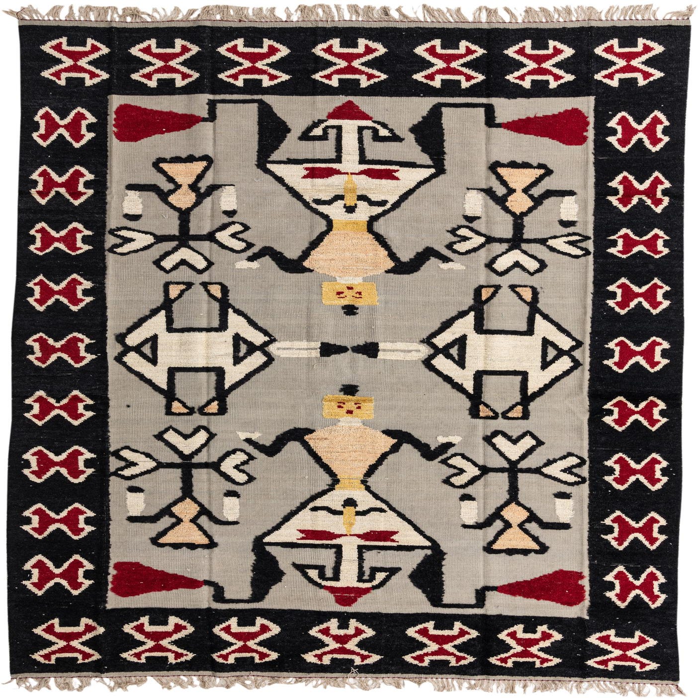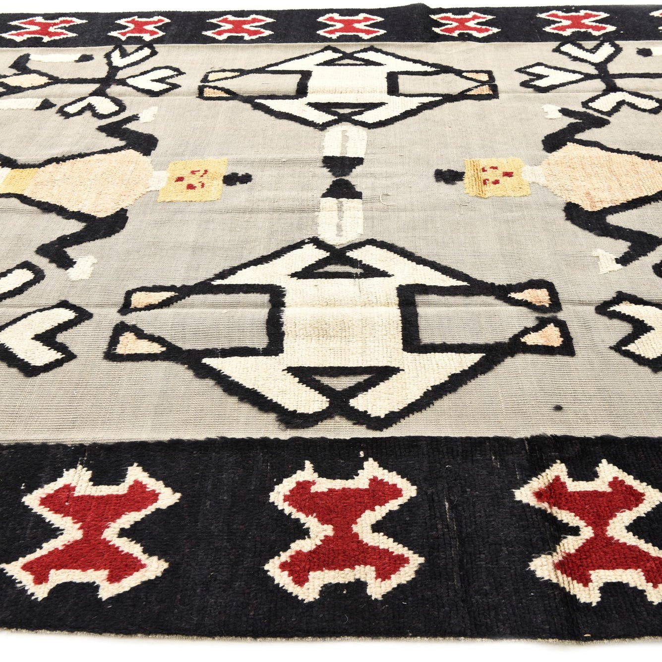 Primary color is Black. Colors in this rug include: Black, Gray, Ivory, Red, Cream, Yellow.