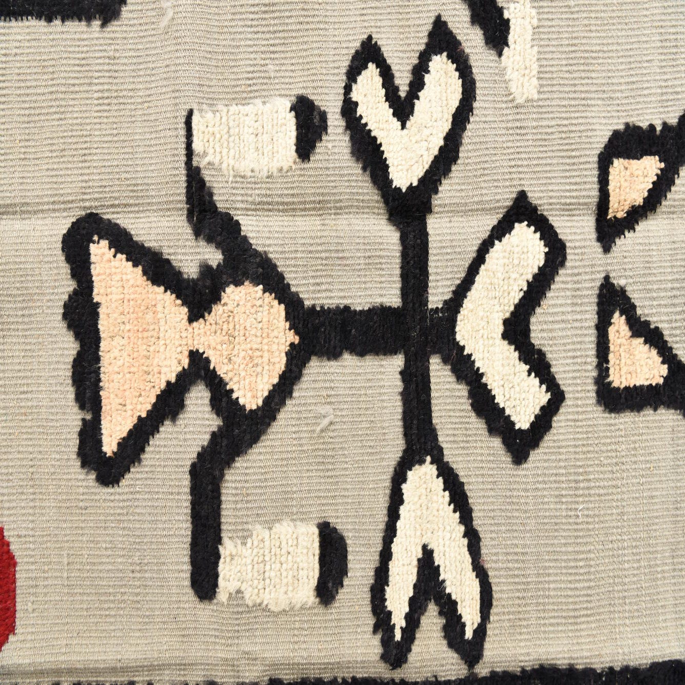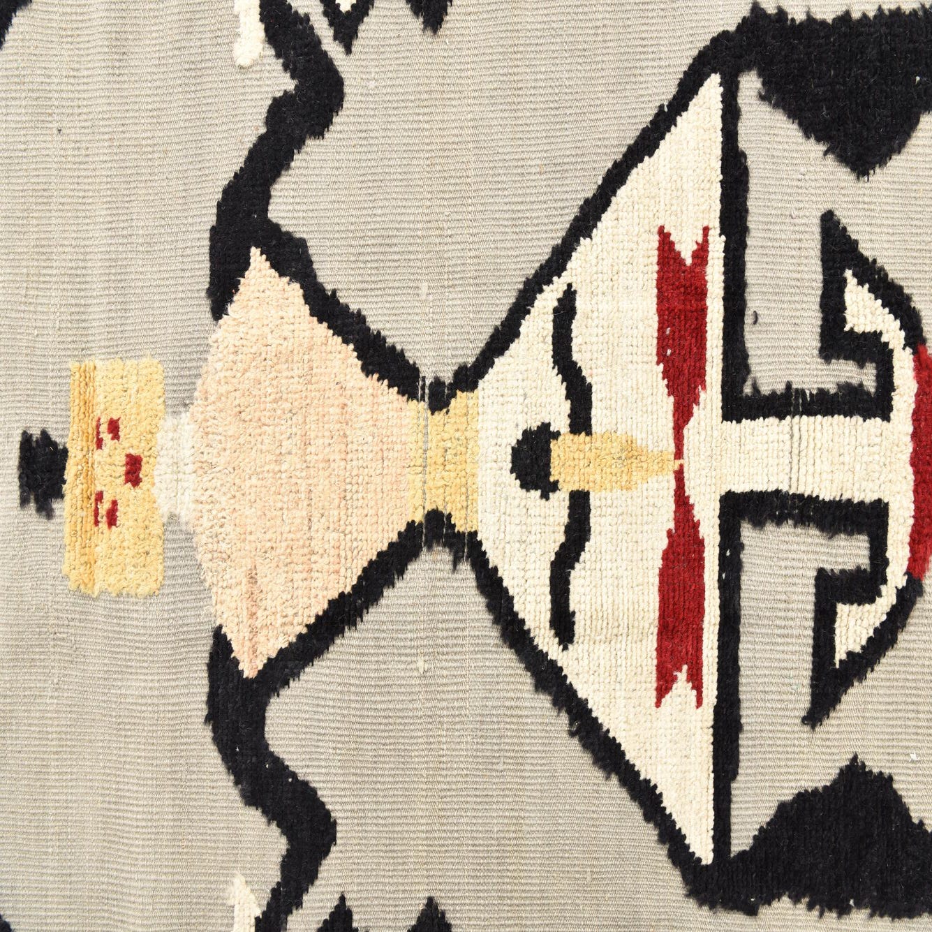 Crafted from 100% wool, the 9x12 rug offers a textured feel underfoot, providing both comfort and durability. The bold motifs and sturdy construction makes it well-suited for spaces that receive regular traffic and can serve as a statement piece in a variety of rooms.